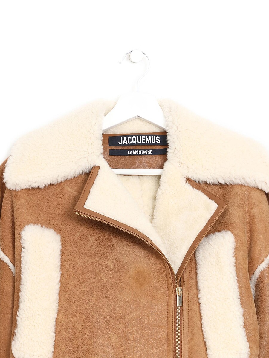 Veste à manches longues avec un grand col en peau lainée dans un ton brun clair. Fermeture à glissière. Poches à rabat sur le devant.
