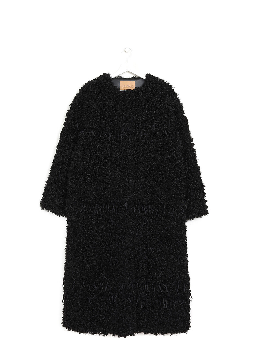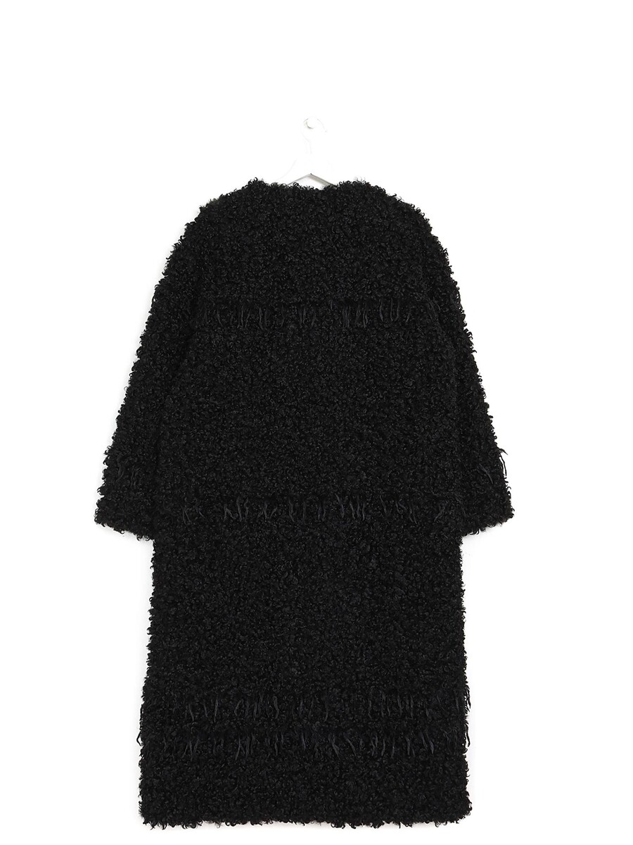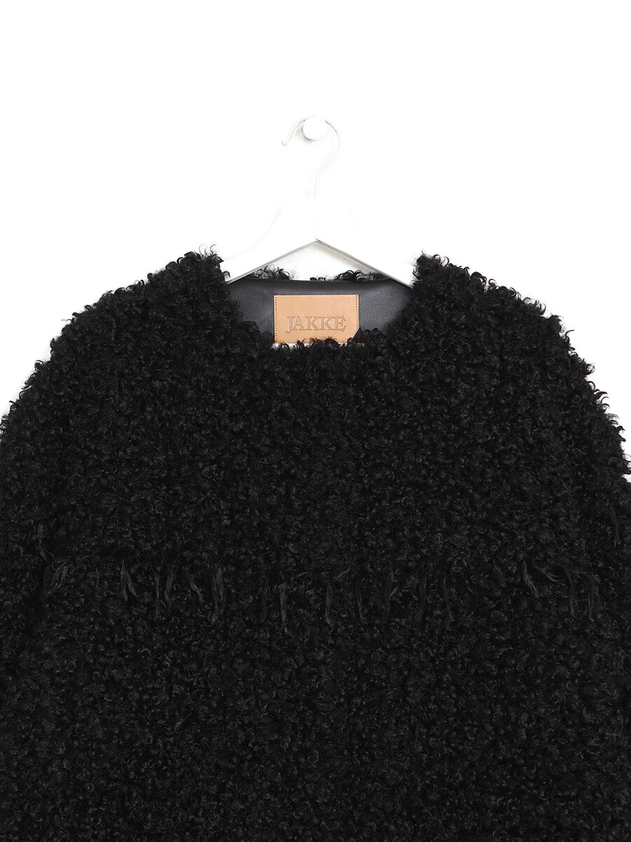 Manteau en fausse fourrure courte noir. Col à revers cranté. Fermeture à agrafes au devant. Texture douce. Intérieur doublé.