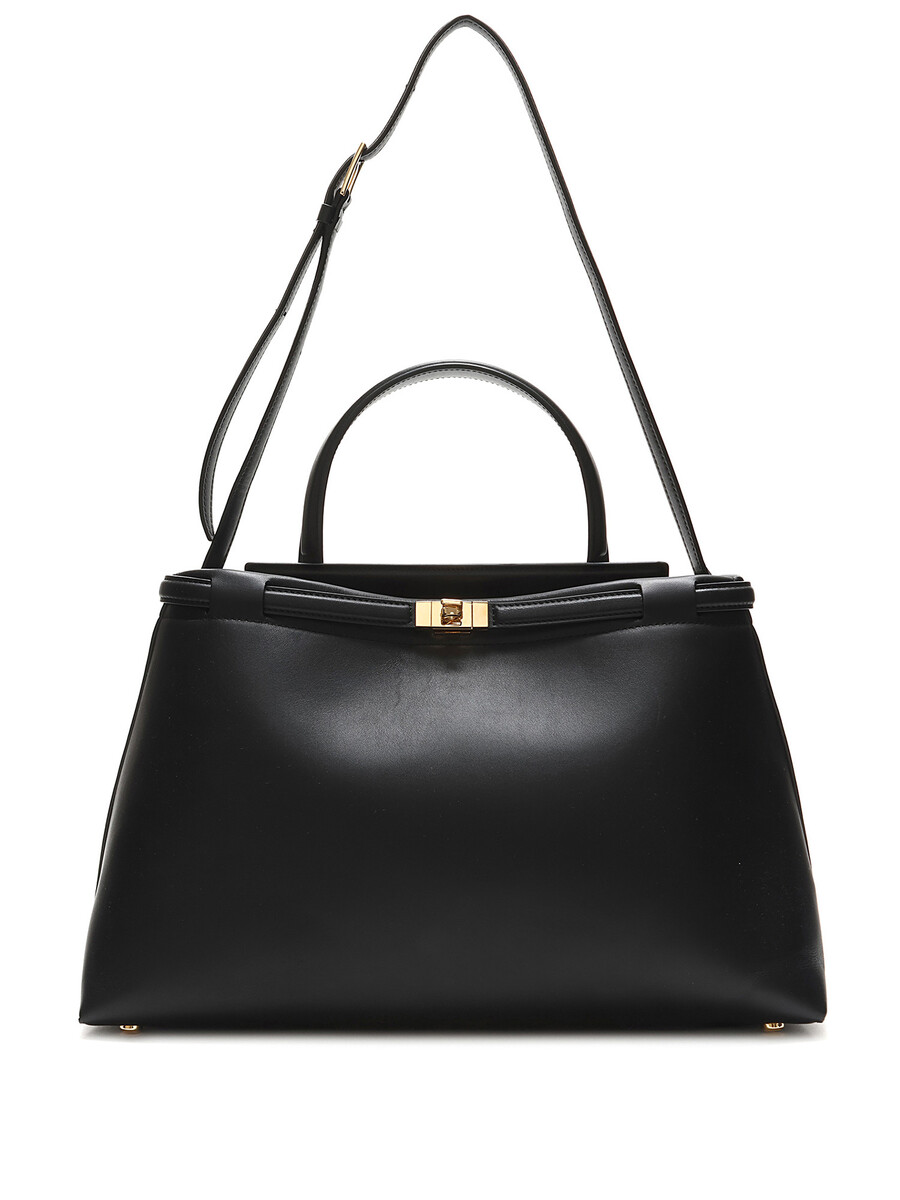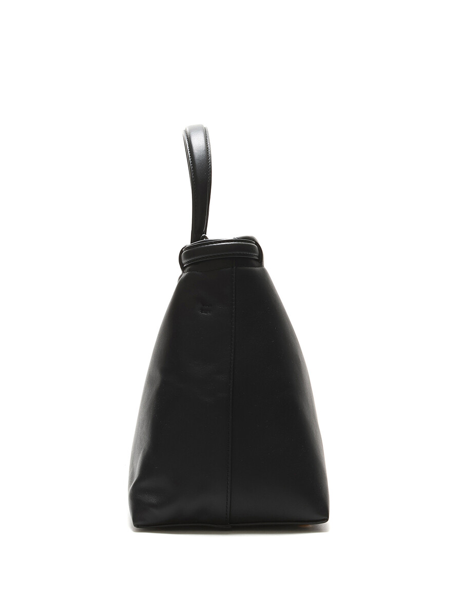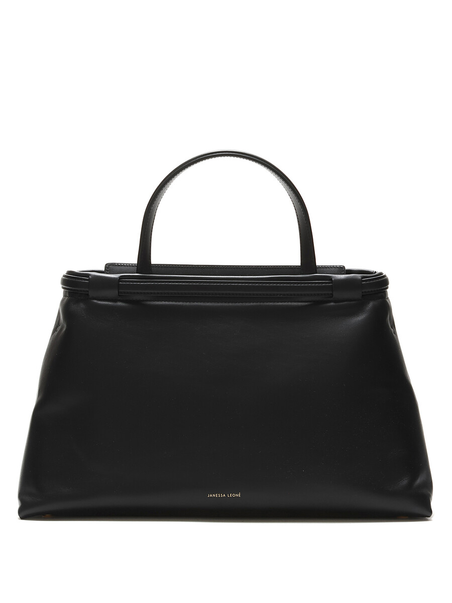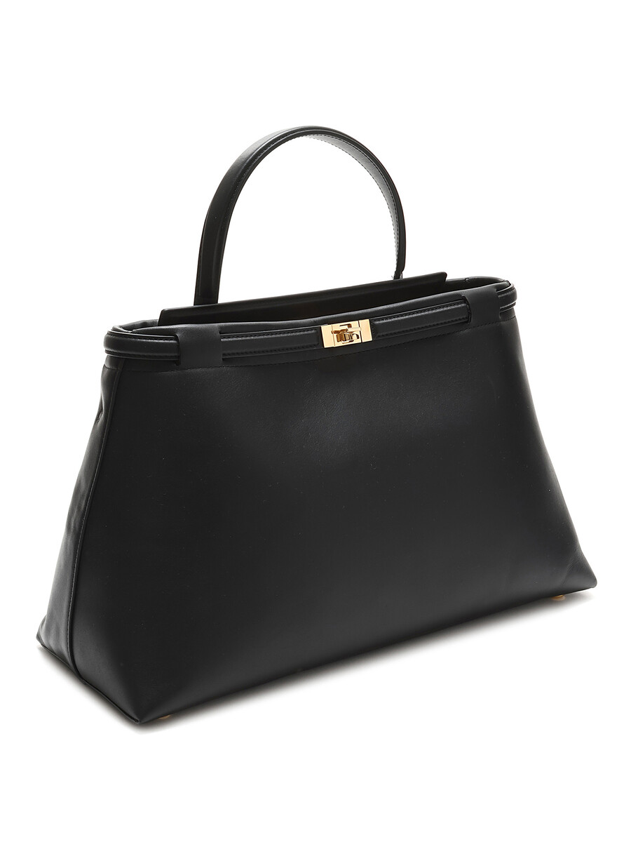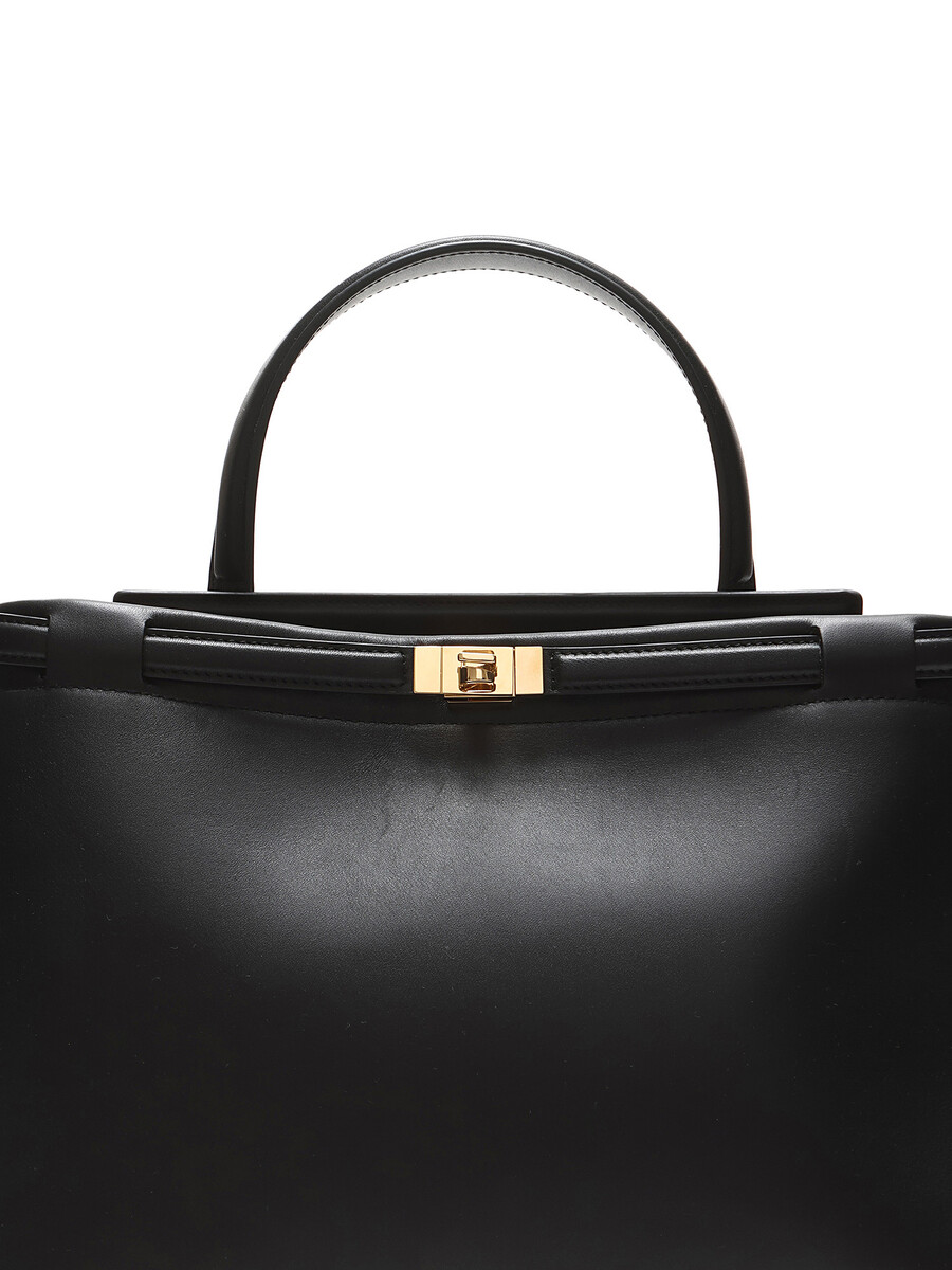Cabas structuré en cuir noir. Fermeture à tourniquet et anses fixes. Ferrures dorées. Intérieur spacieux.
