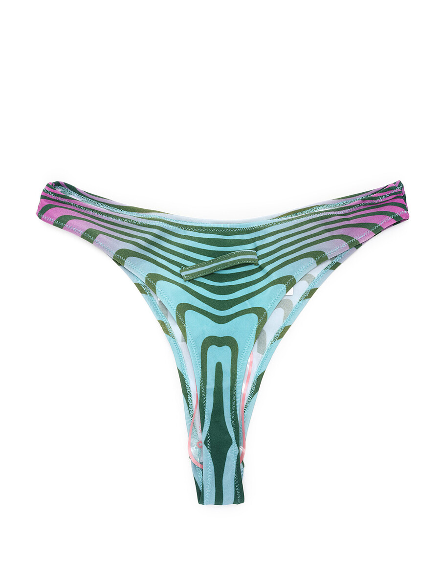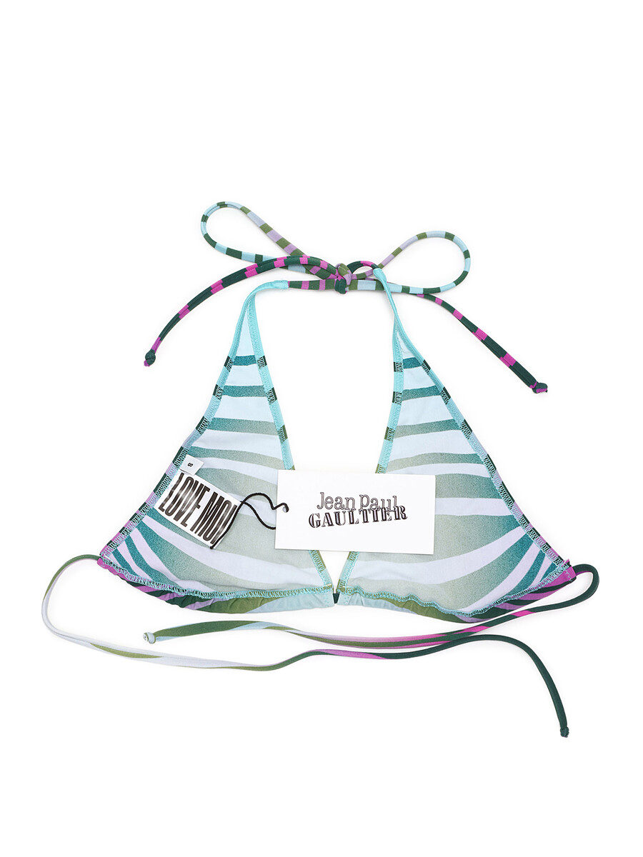 Ensemble bikini à rayures multicolores. Comprend un haut de bikini à bretelles réglables et un bas assorti.