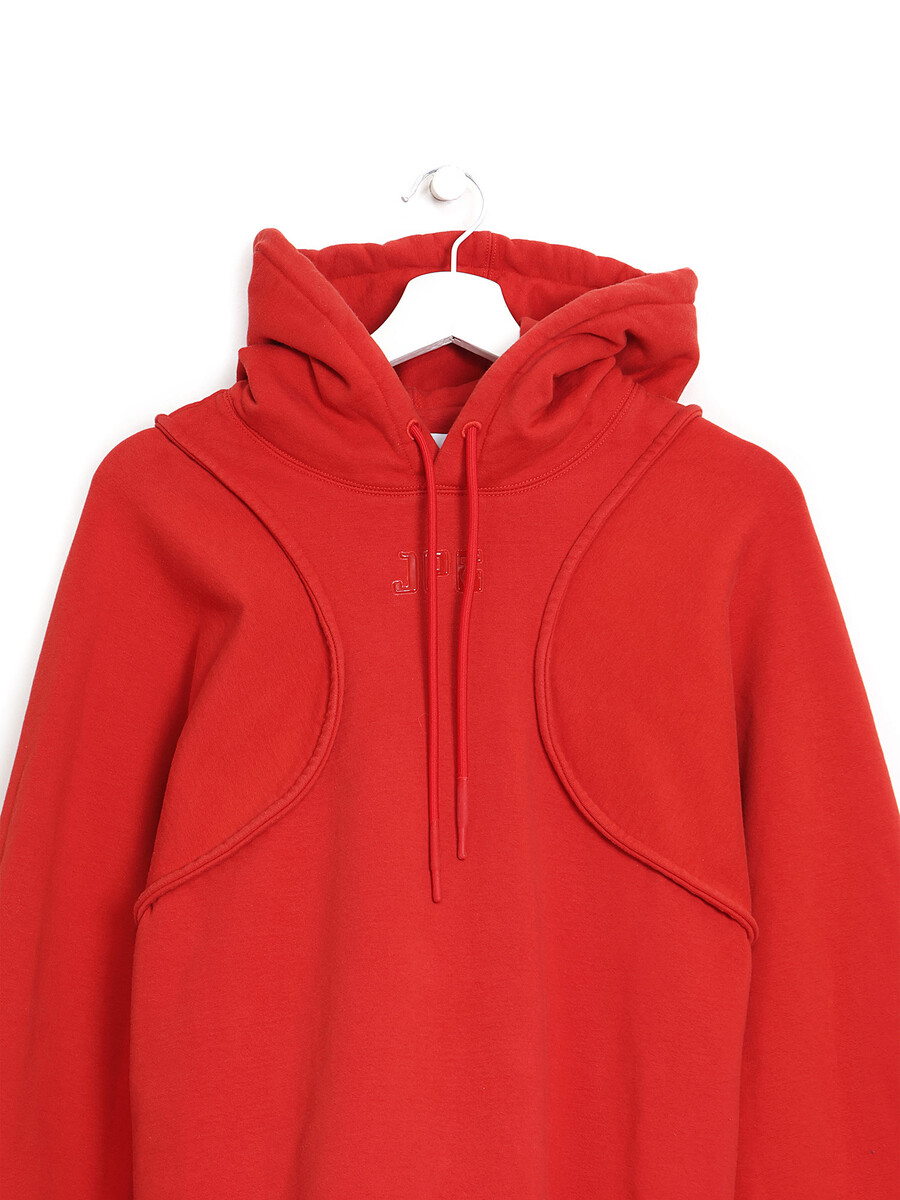 Chandail à capuchon rouge avec fermeture éclair et logo ton sur ton. Capuchon ajustable avec lacets. Coupe décontractée. Poches avant.