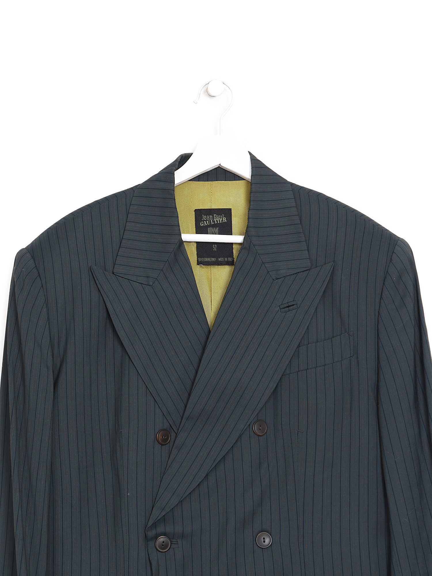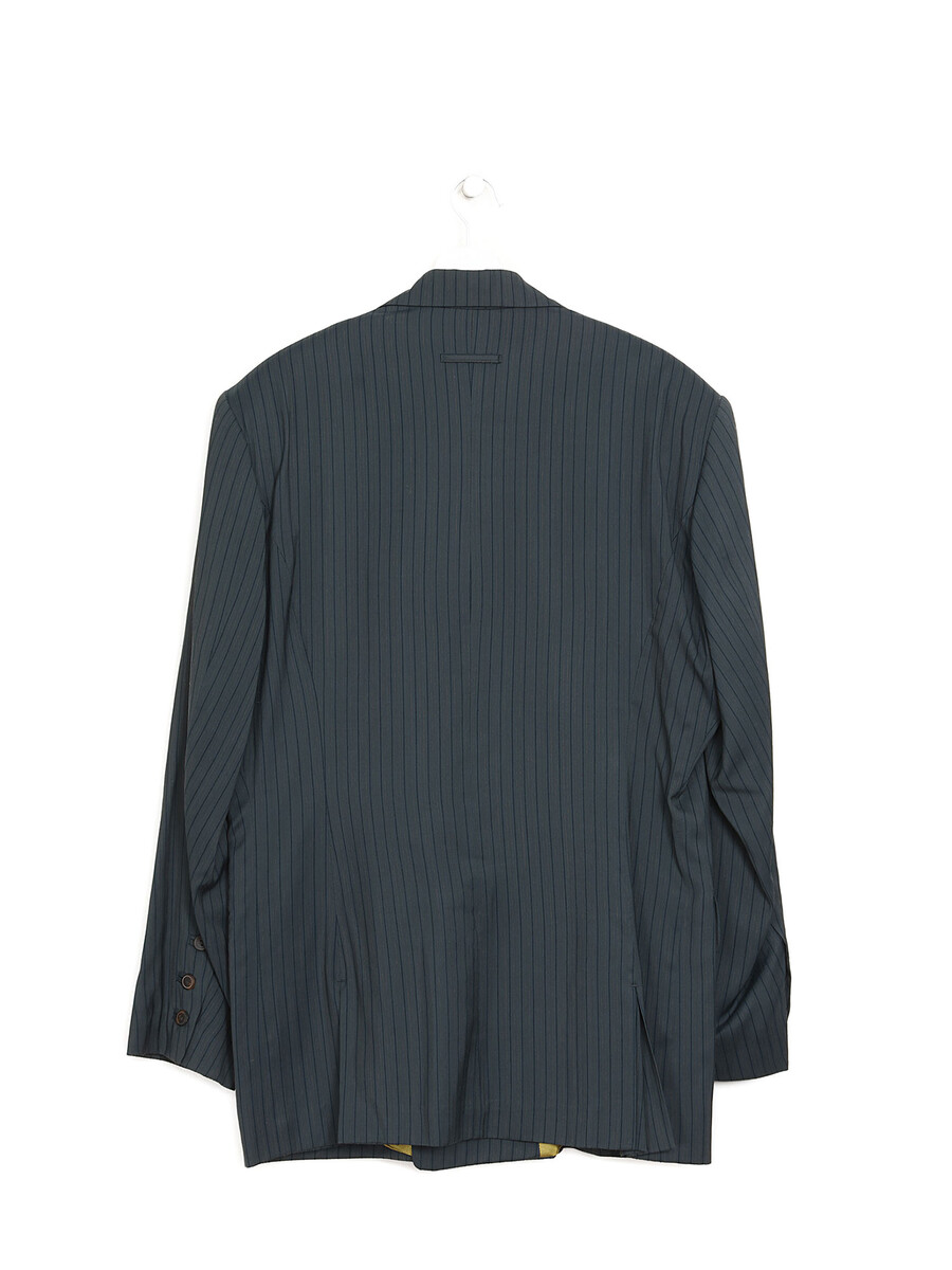 Blazer à manches longues à rayures grises. Boutonnage croisé. Col à revers crantés. Trois poches. Fabriqué en Italie.