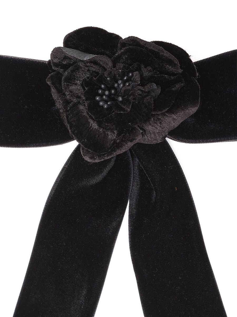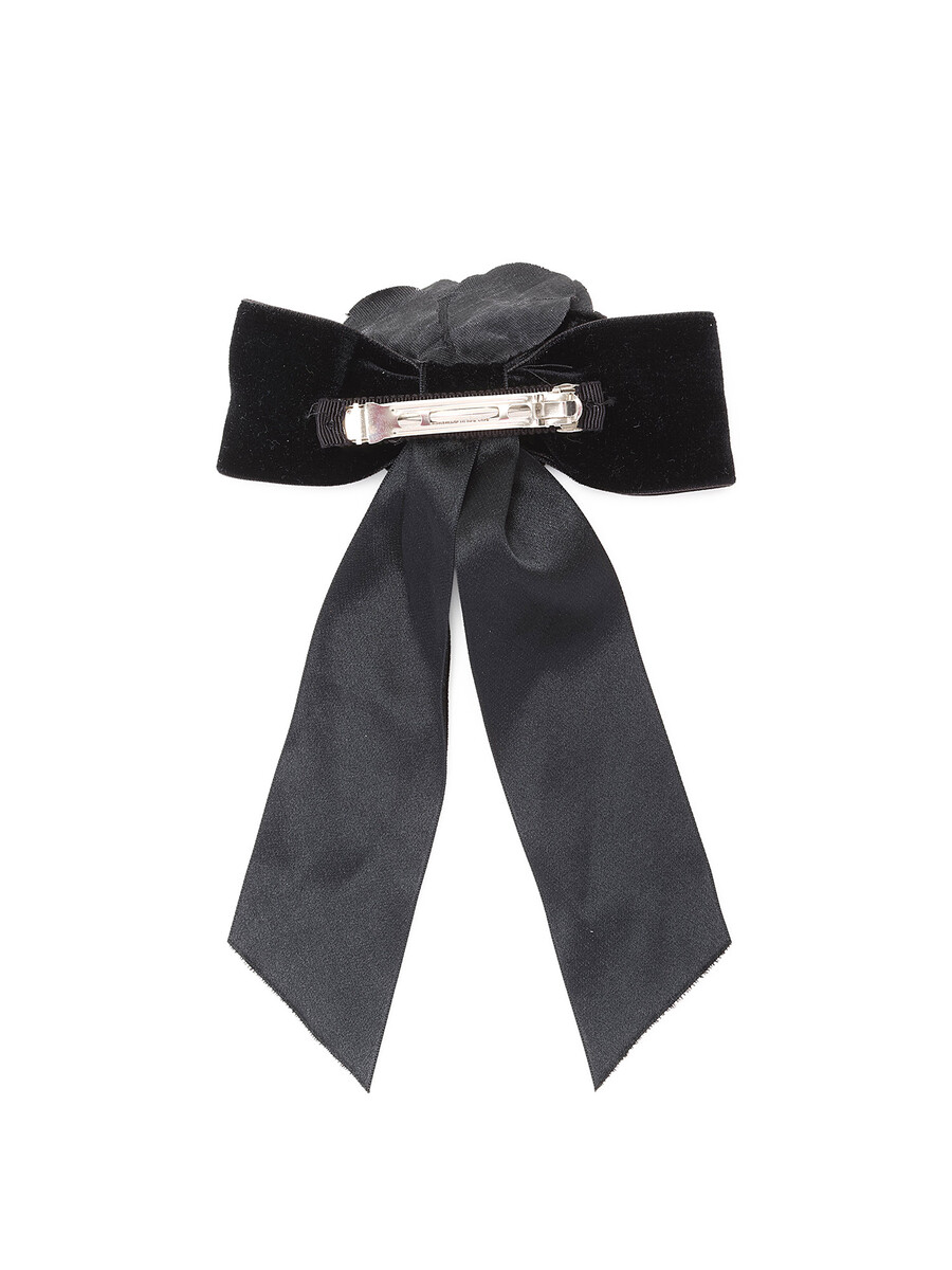 Barrette en velours luxueux de couleur noire classique avec une fleur et un nœud en velours. Clip barrette argenté gravé 'JENNIFER BEHR'.