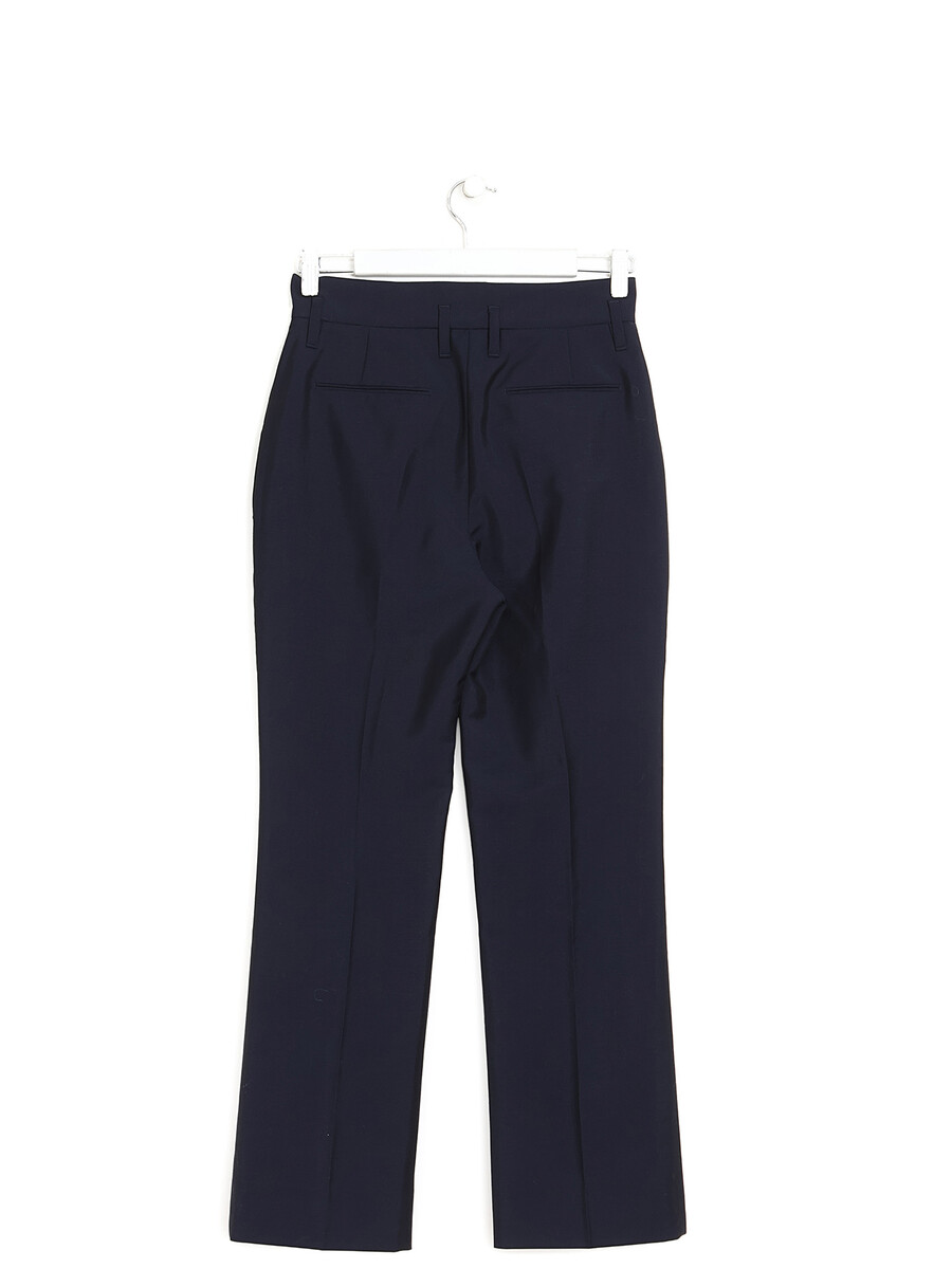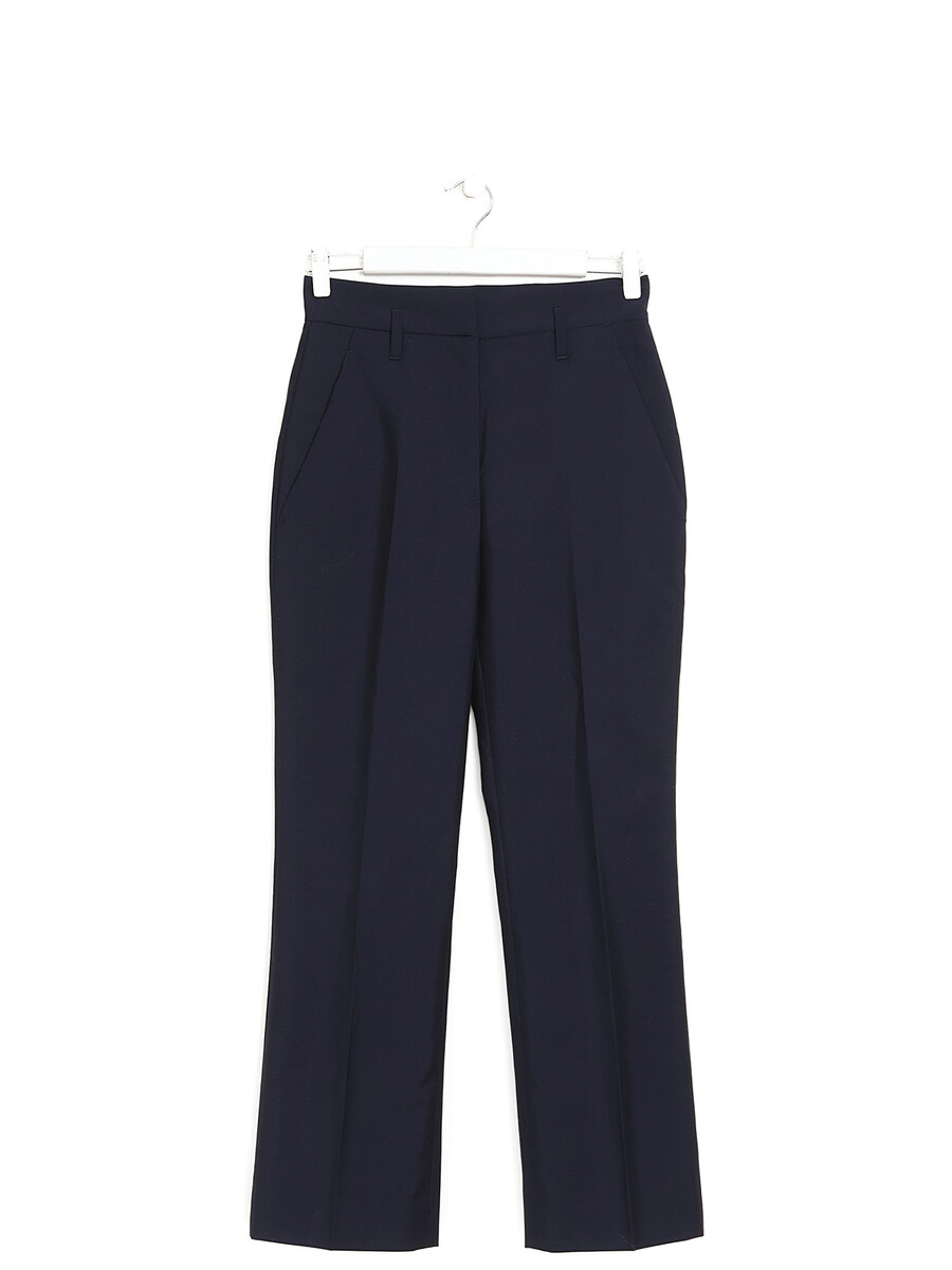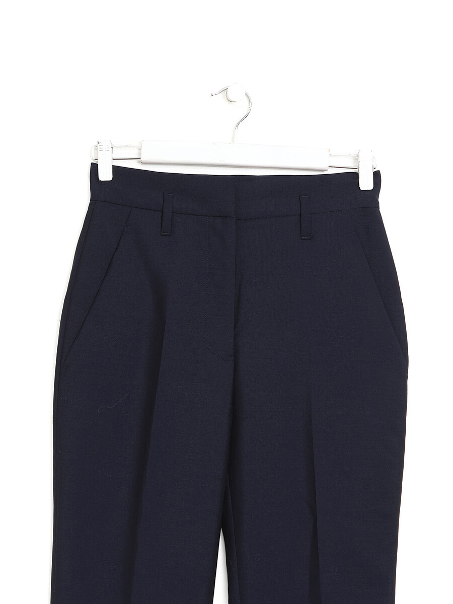 Pantalon en laine extensible bleu marine, coupe élégante. Poches latérales.