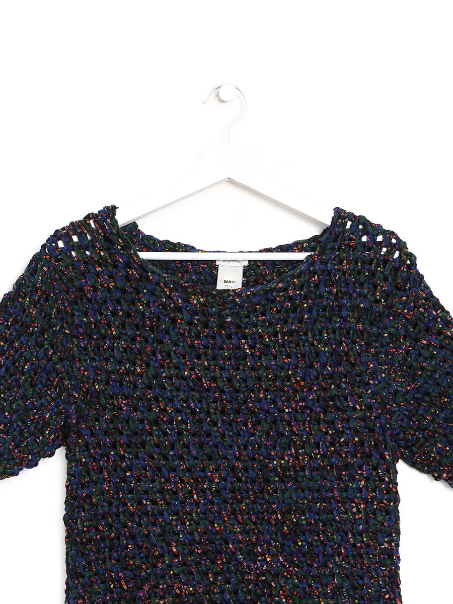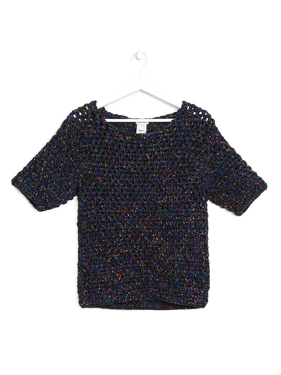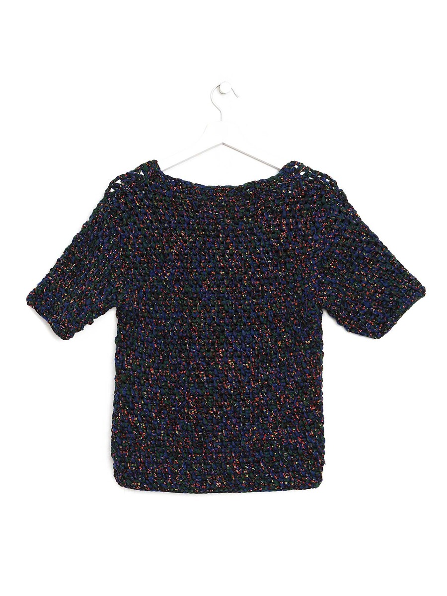 Haut à manches courtes avec motif abstrait en fils multicolores. Mélange textile.