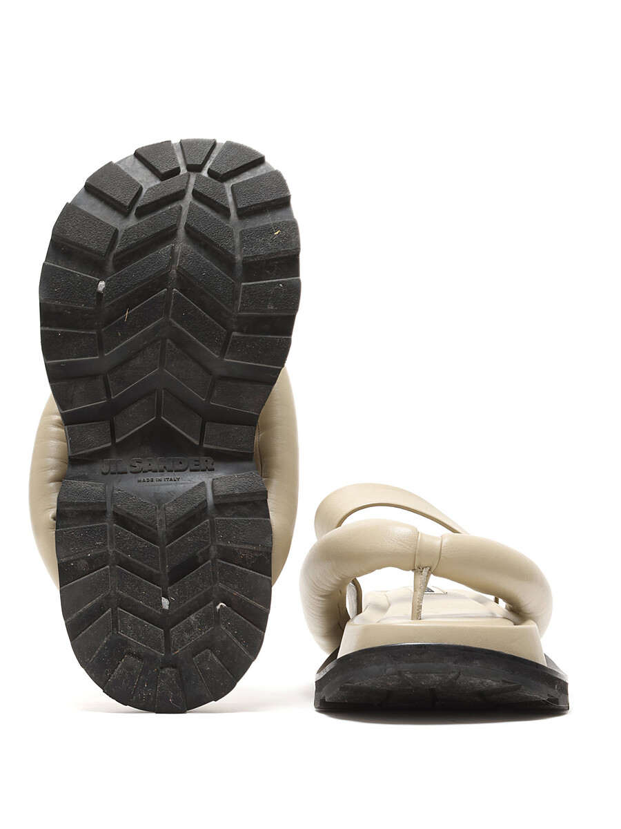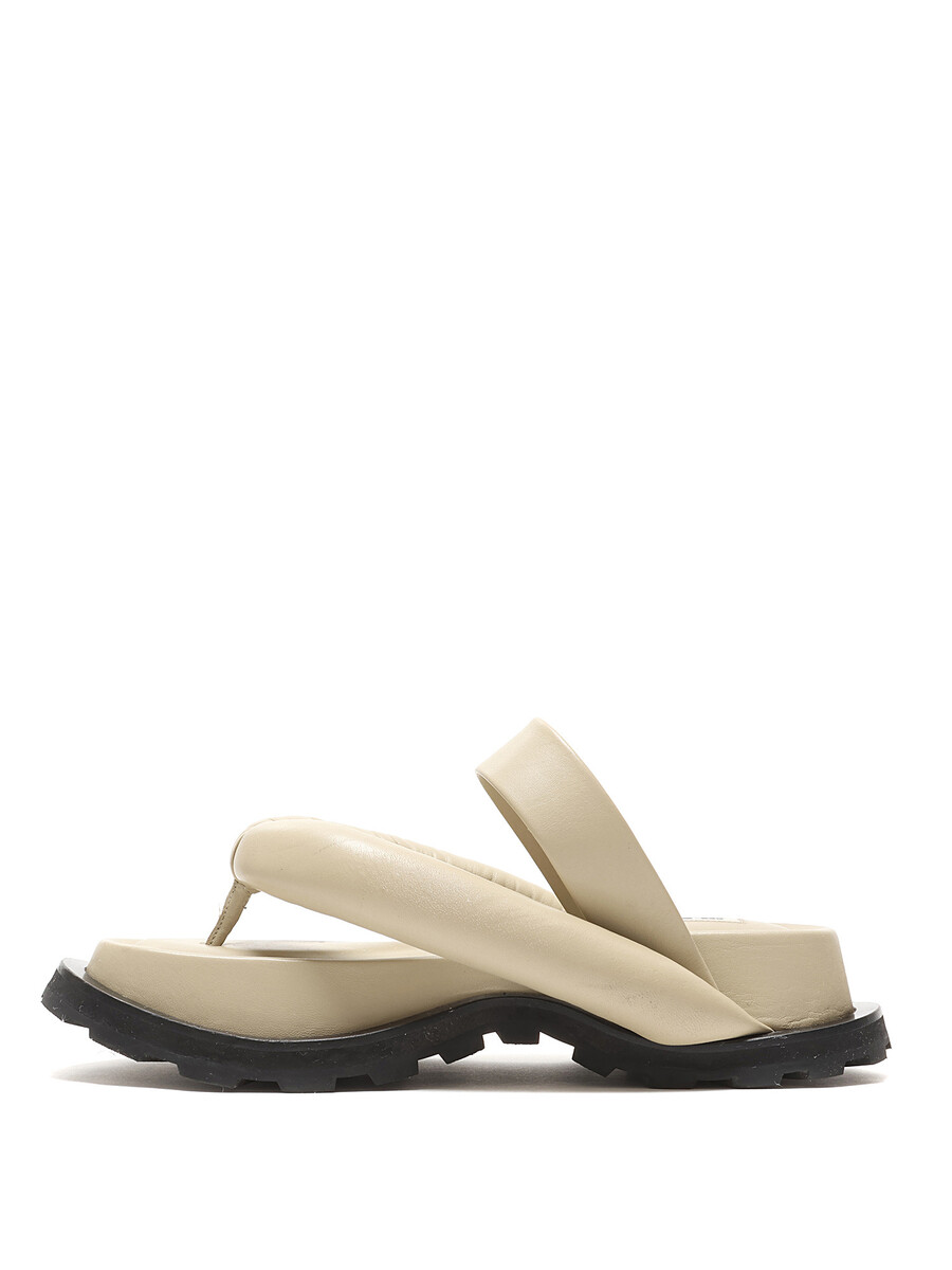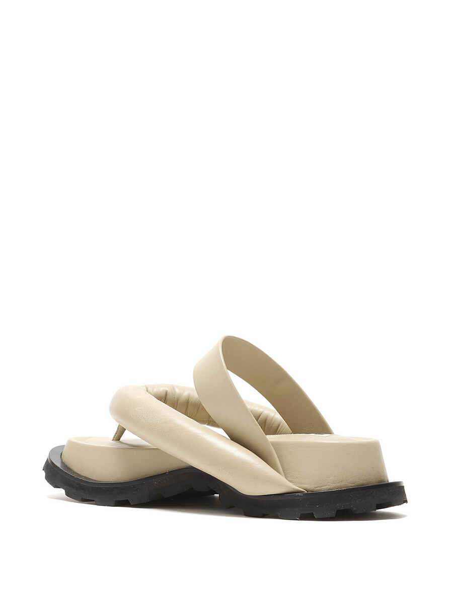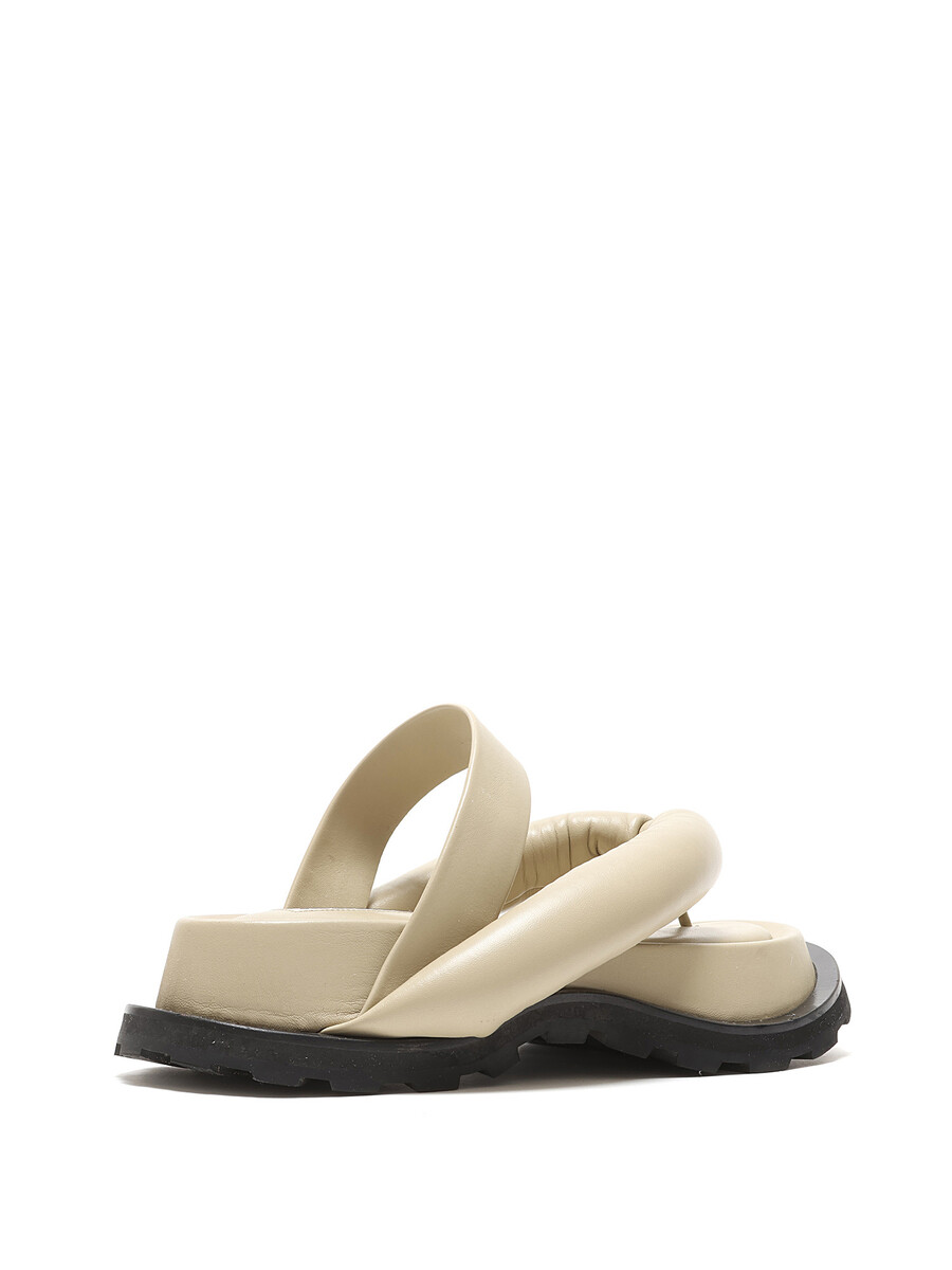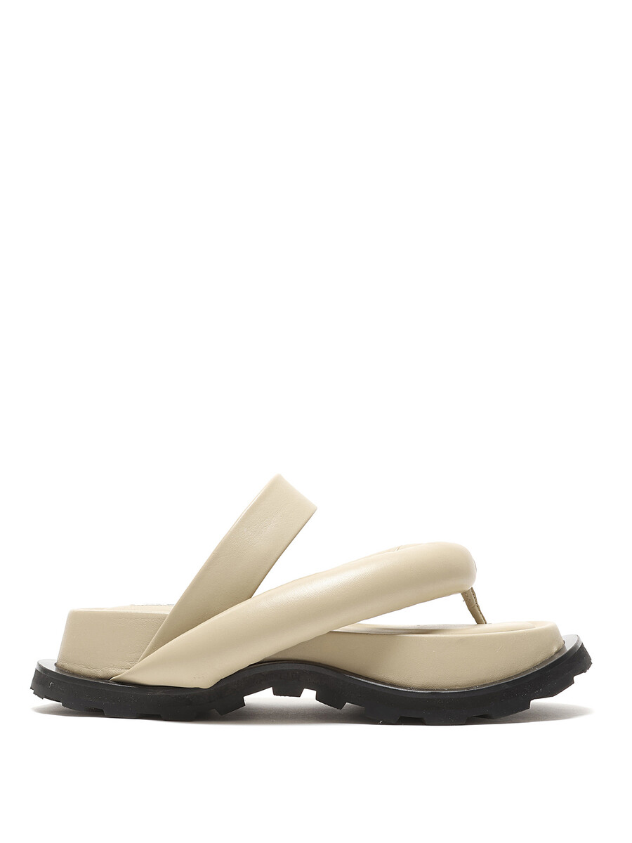 Sandales en cuir matelassé avec semelle crantée taupe. Double bride. Bout ouvert. Livrées avec boîte et housse.