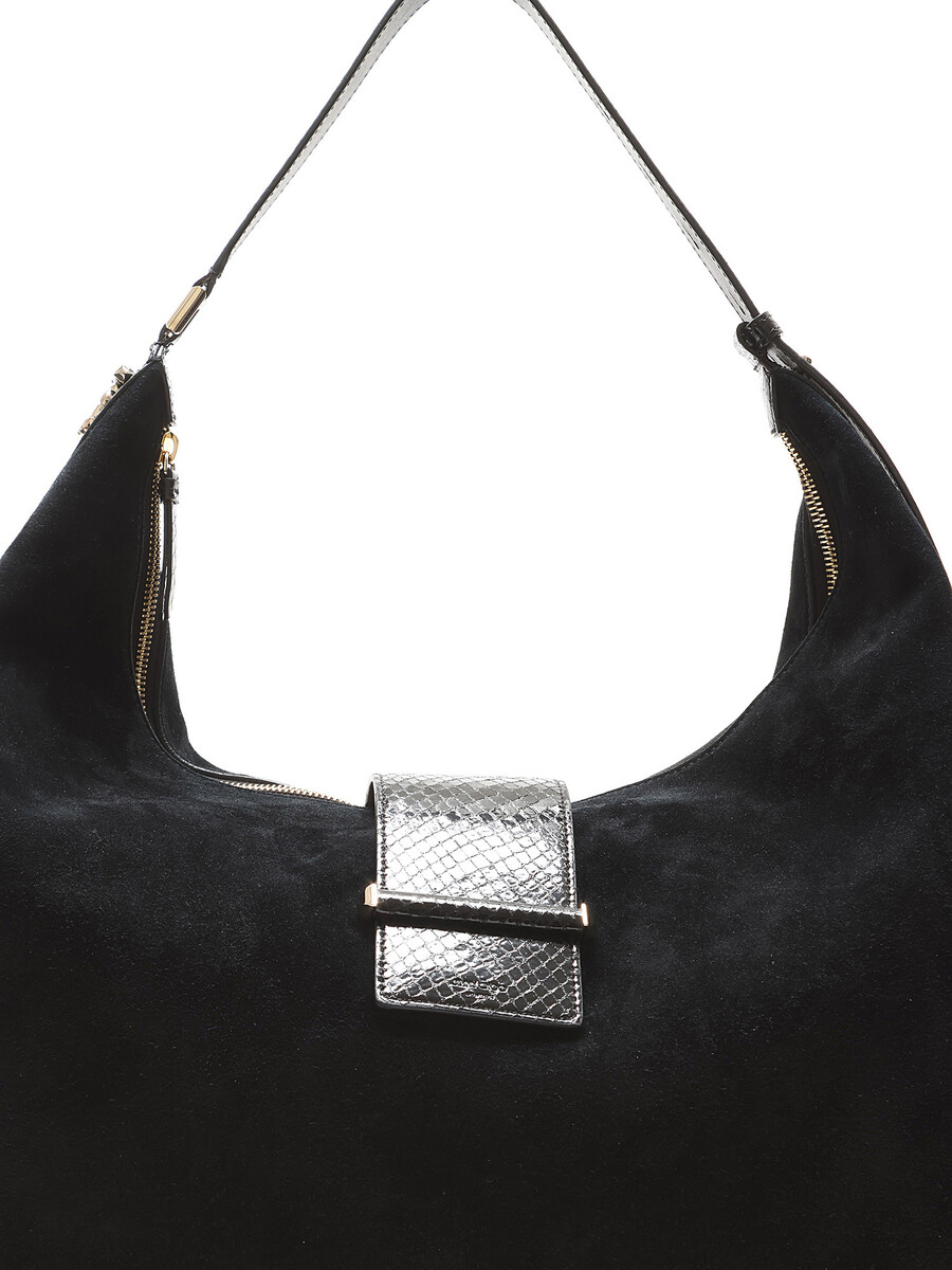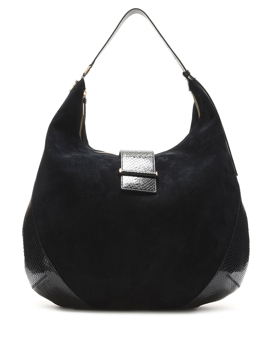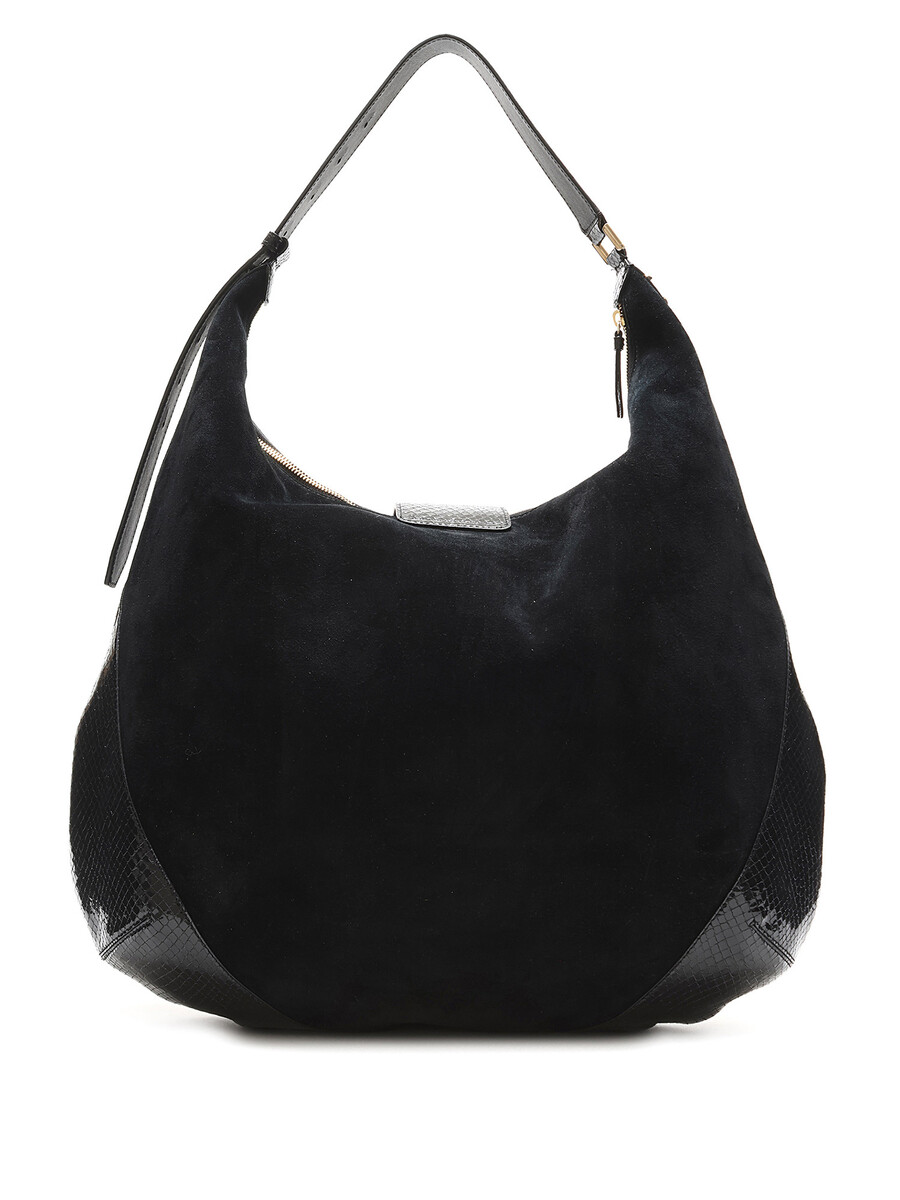 Grand sac hobo en somptueux mélange de suède et cuir noir. Accents en cuir texturé et ferrures dorées. Fermeture à glissière. Bandoulière ajustable.