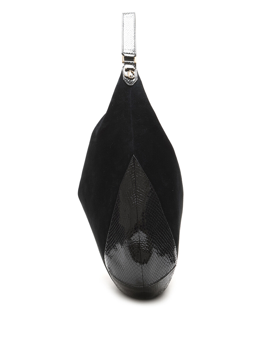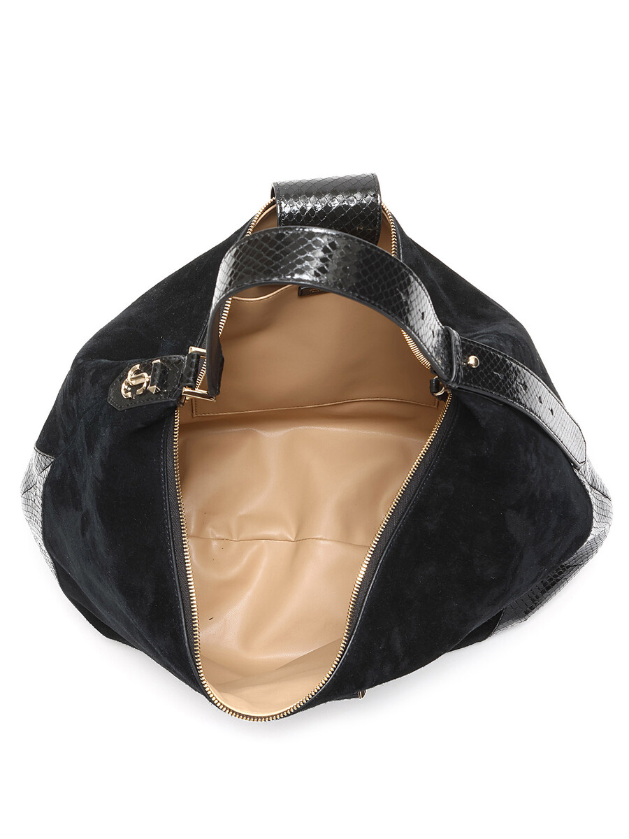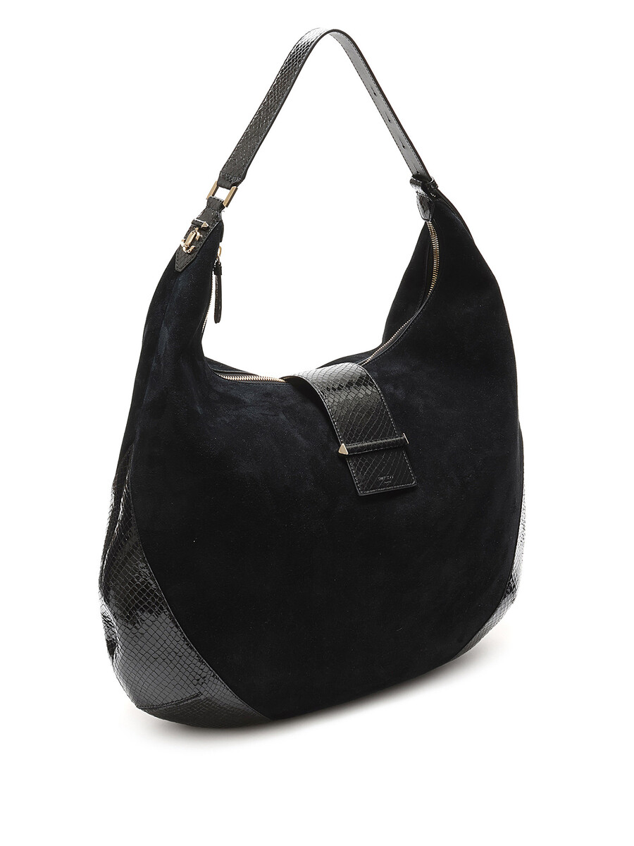 Grand sac hobo en somptueux mélange de suède et cuir noir. Accents en cuir texturé et ferrures dorées. Fermeture à glissière. Bandoulière ajustable.