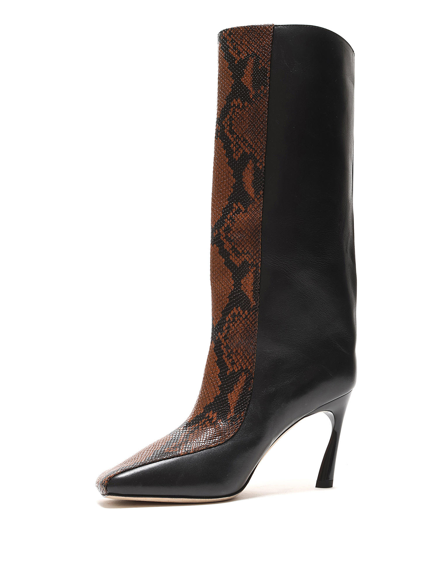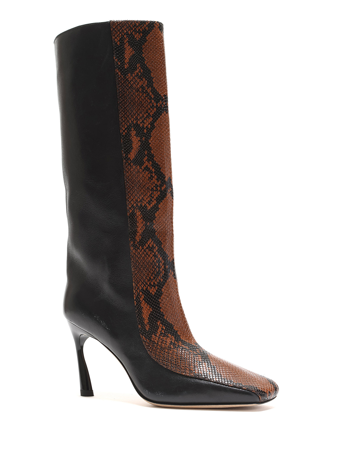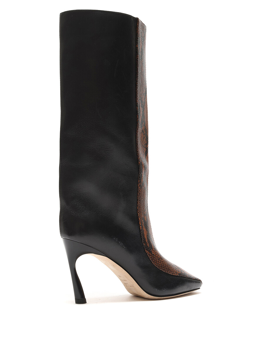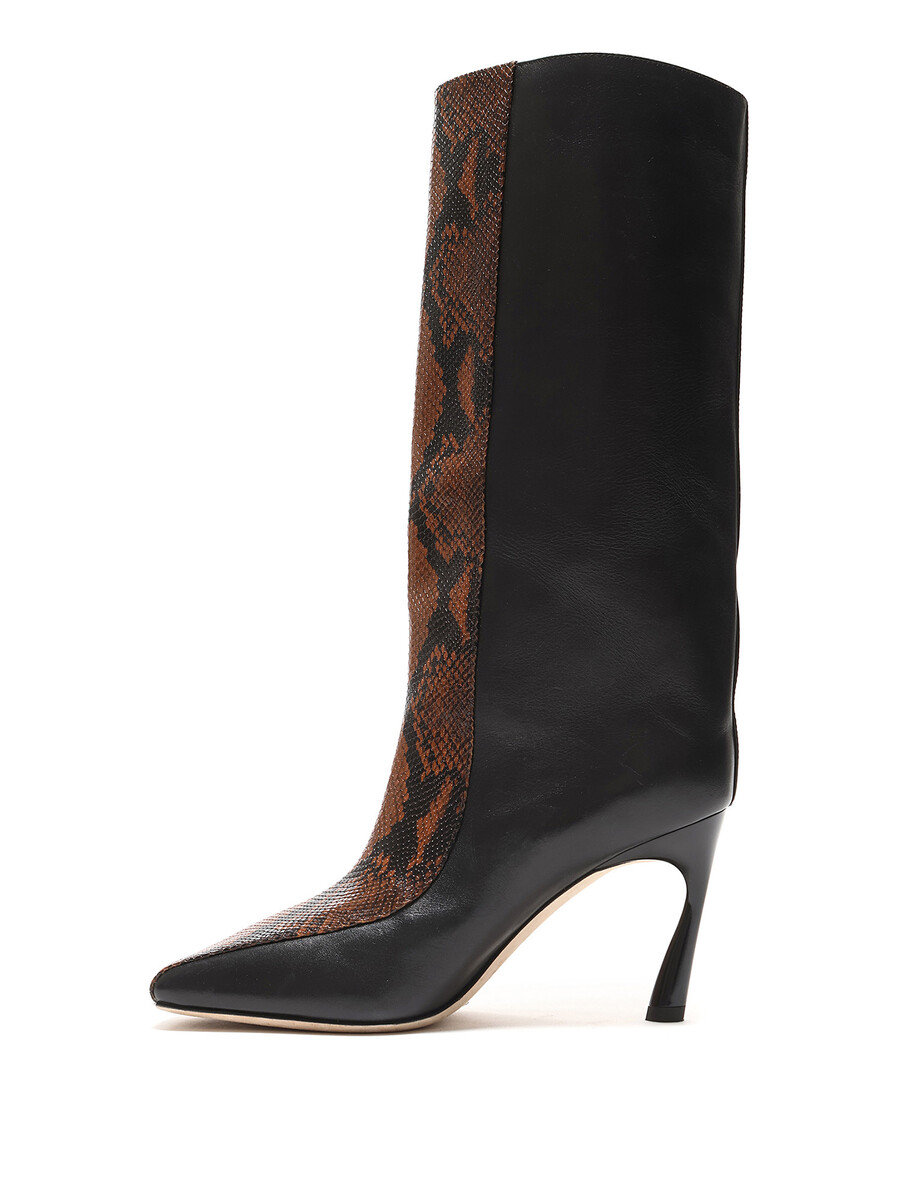 Bottes mi-mollet en cuir noir et imprimé peau de serpent dans les tons noirs et bruns. Bout carré. Talon stiletto.