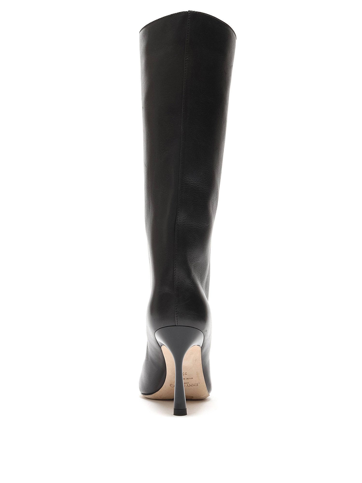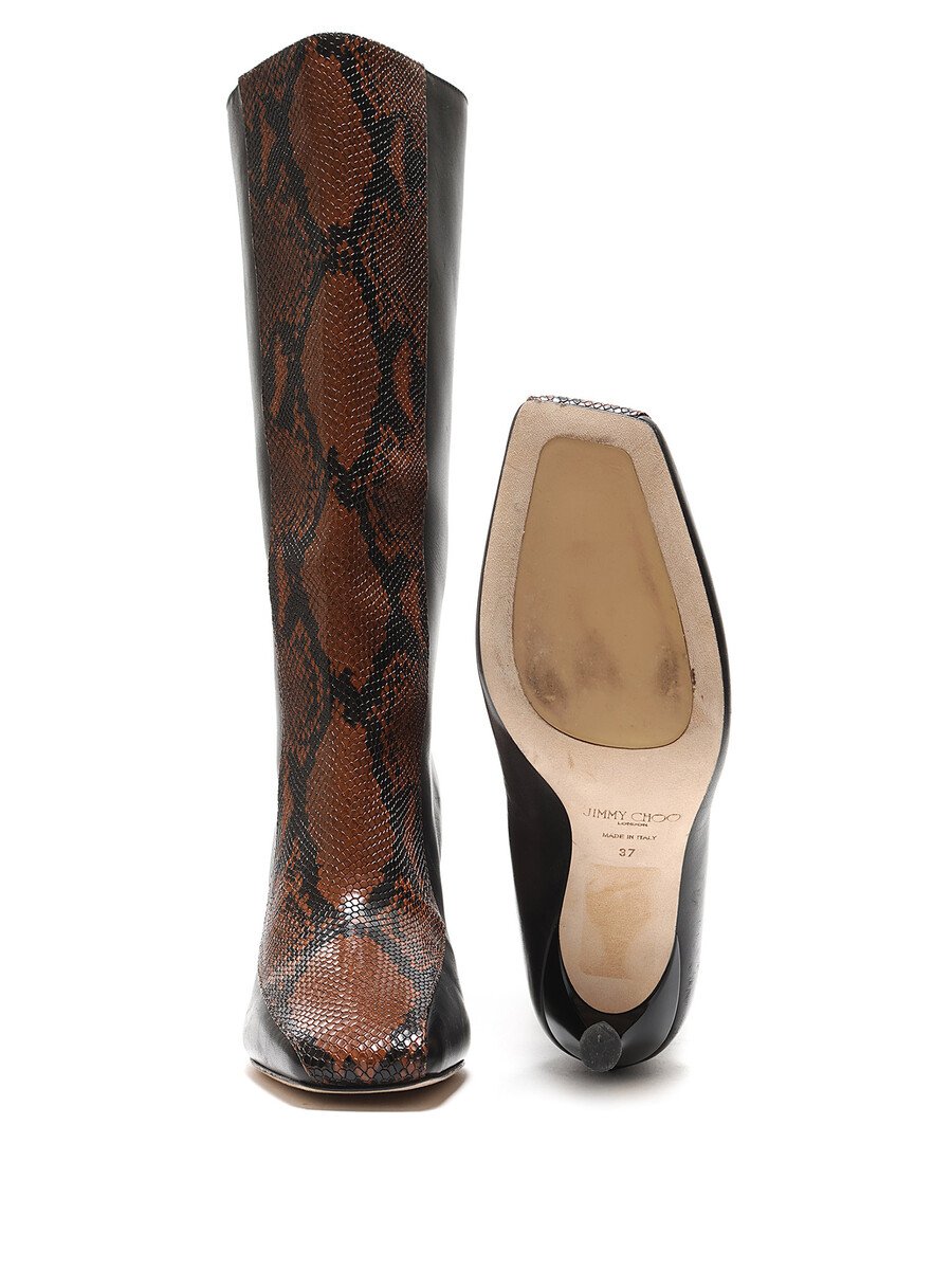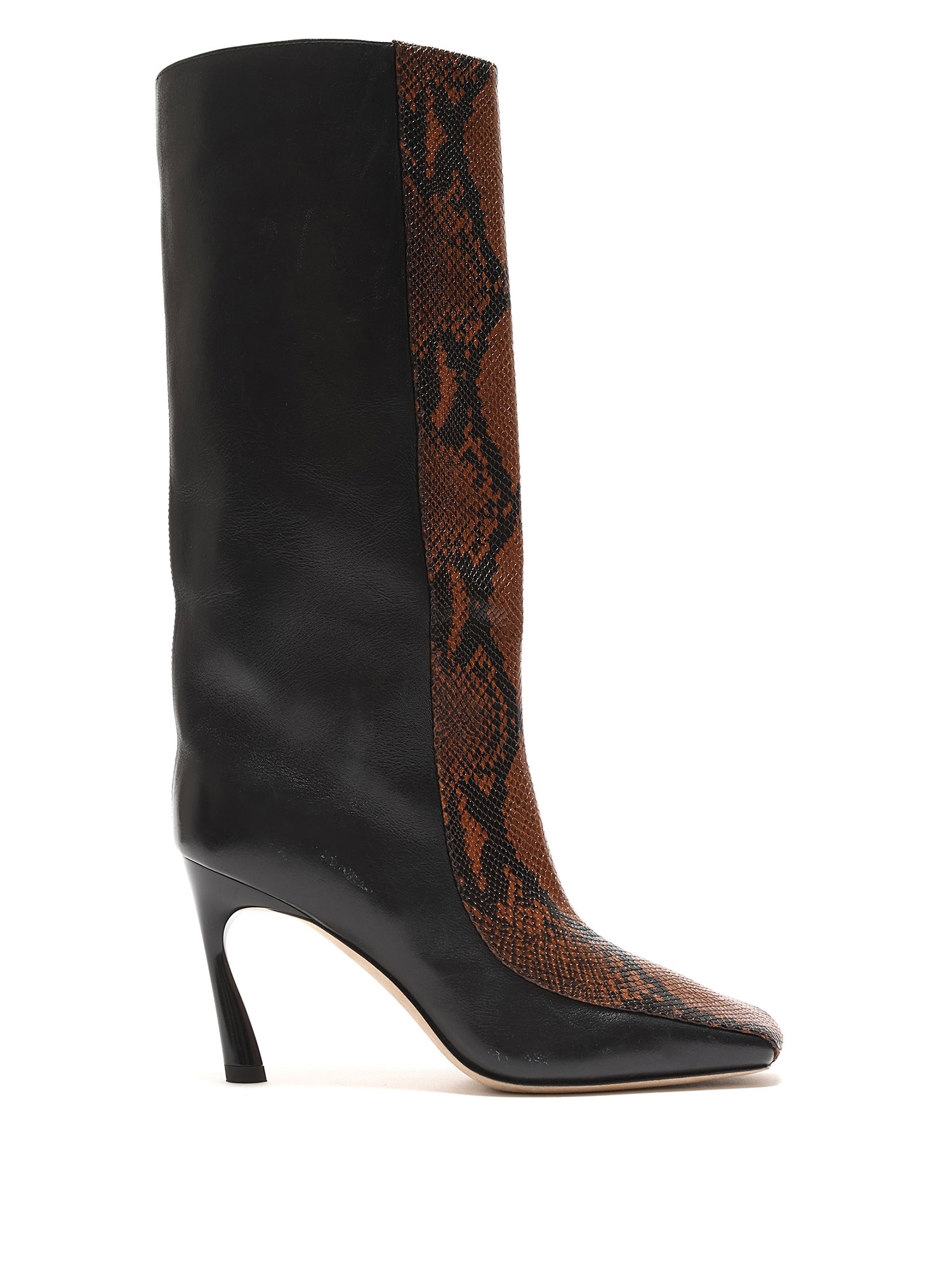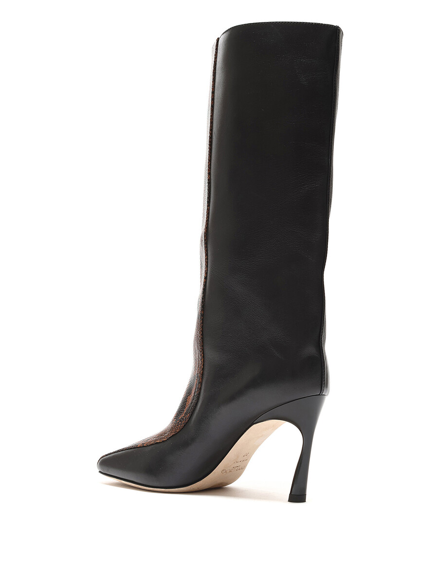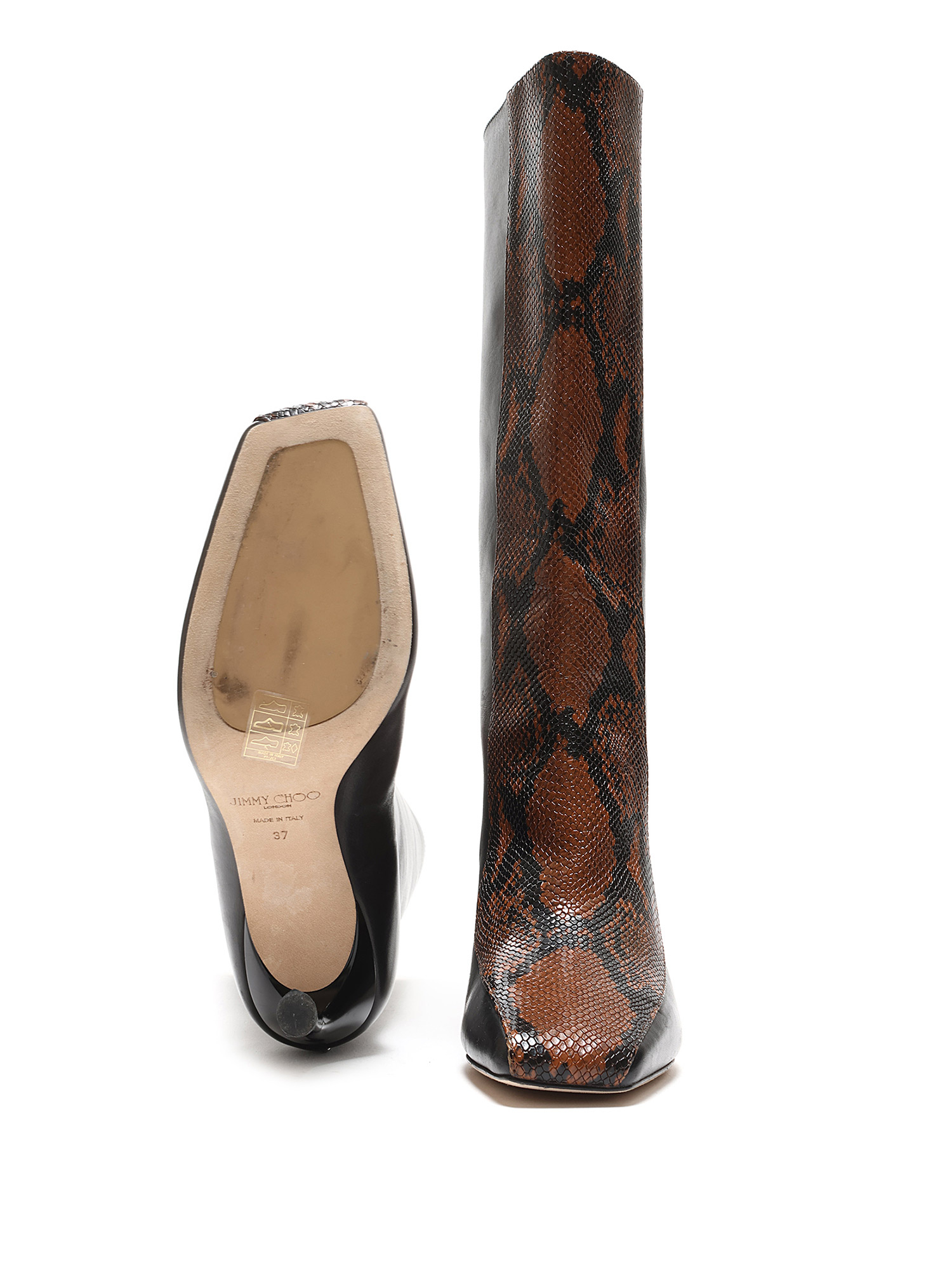 Bottes mi-mollet en cuir noir et imprimé peau de serpent dans les tons noirs et bruns. Bout carré. Talon stiletto.