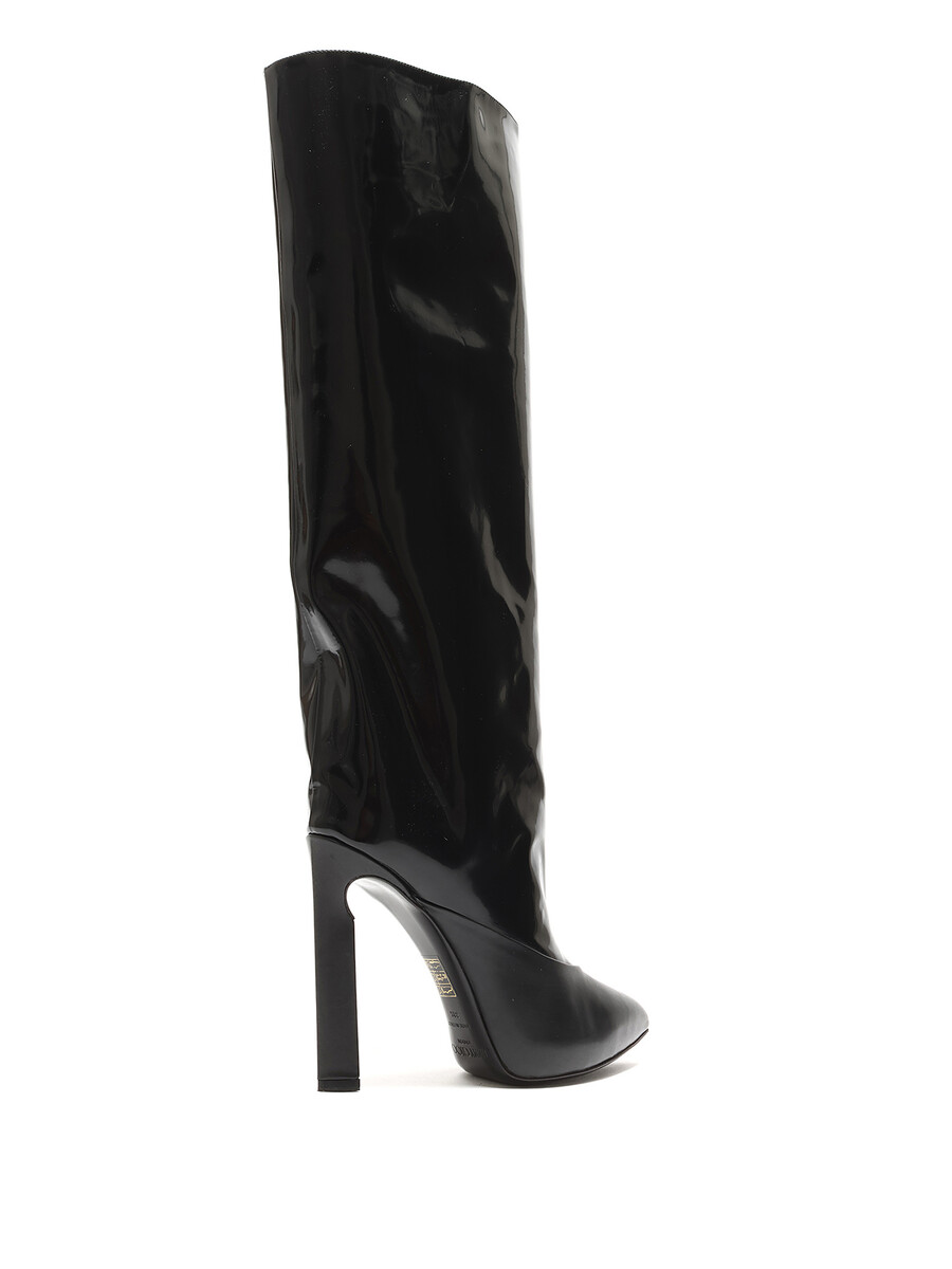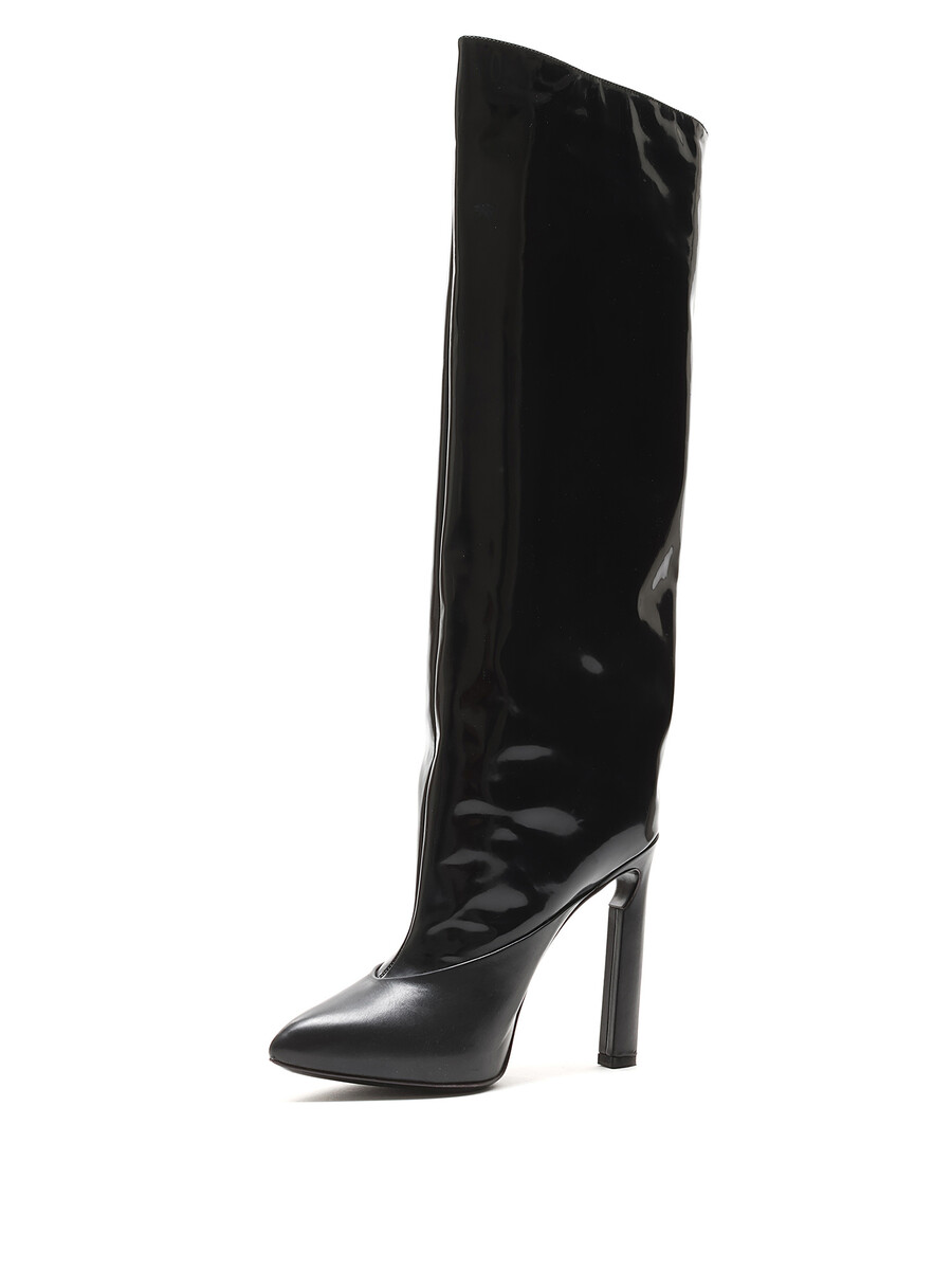 Bottes montantes en cuir lisse noir avec une silhouette élégante. Conception à enfiler. Bout pointu et semelle en cuir.