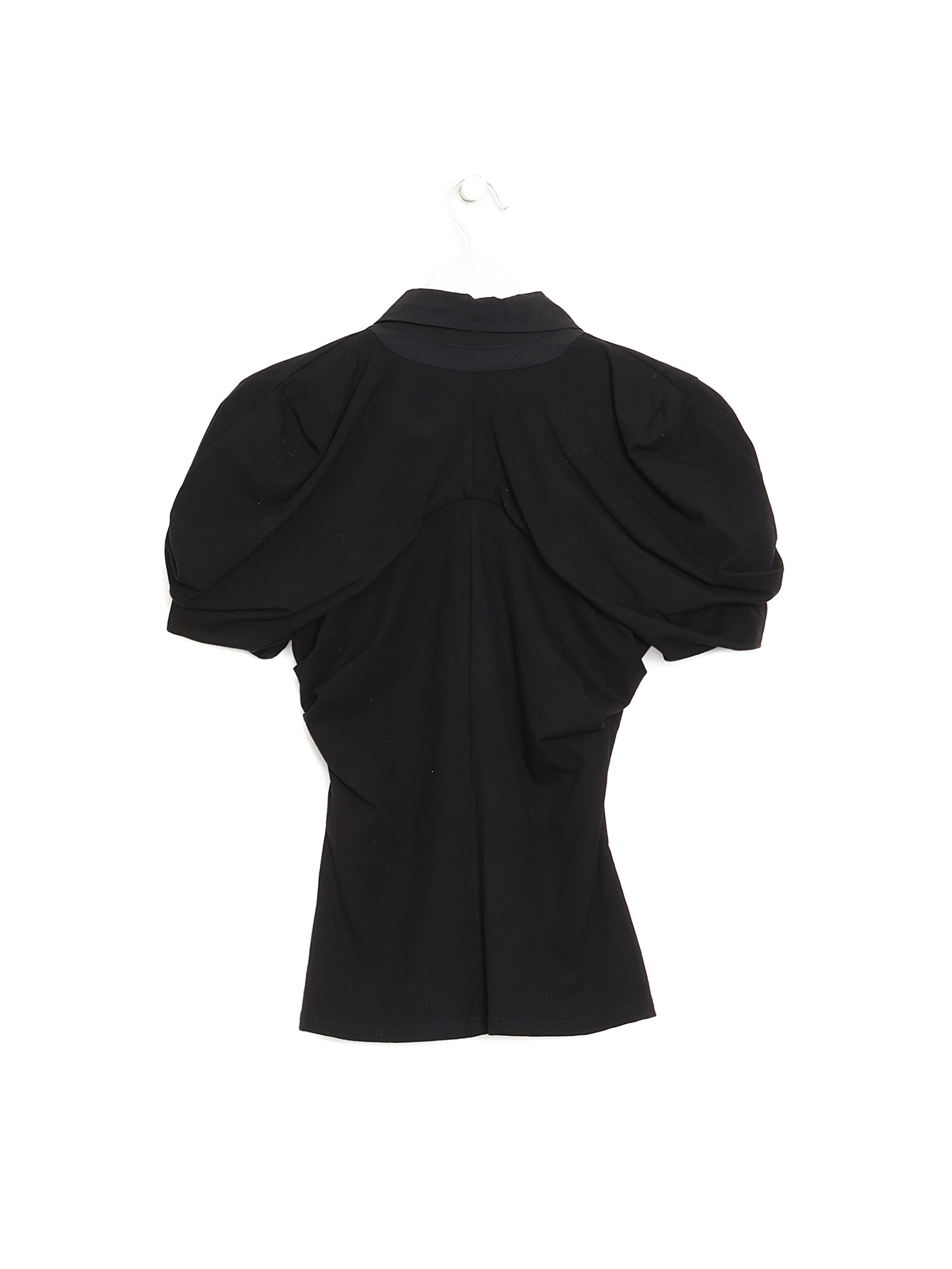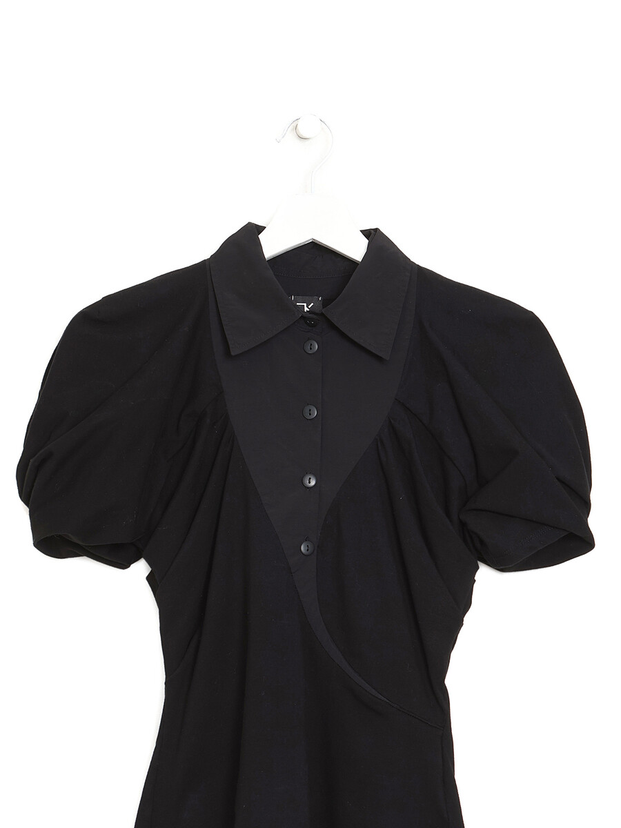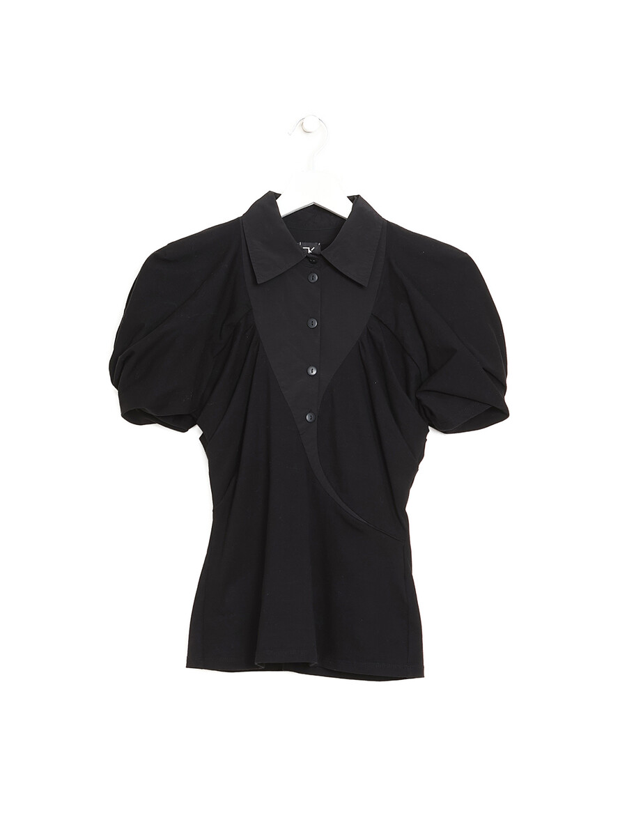 Chemise à manches courtes bouffantes en noir. Boutonnière. Col classique.
