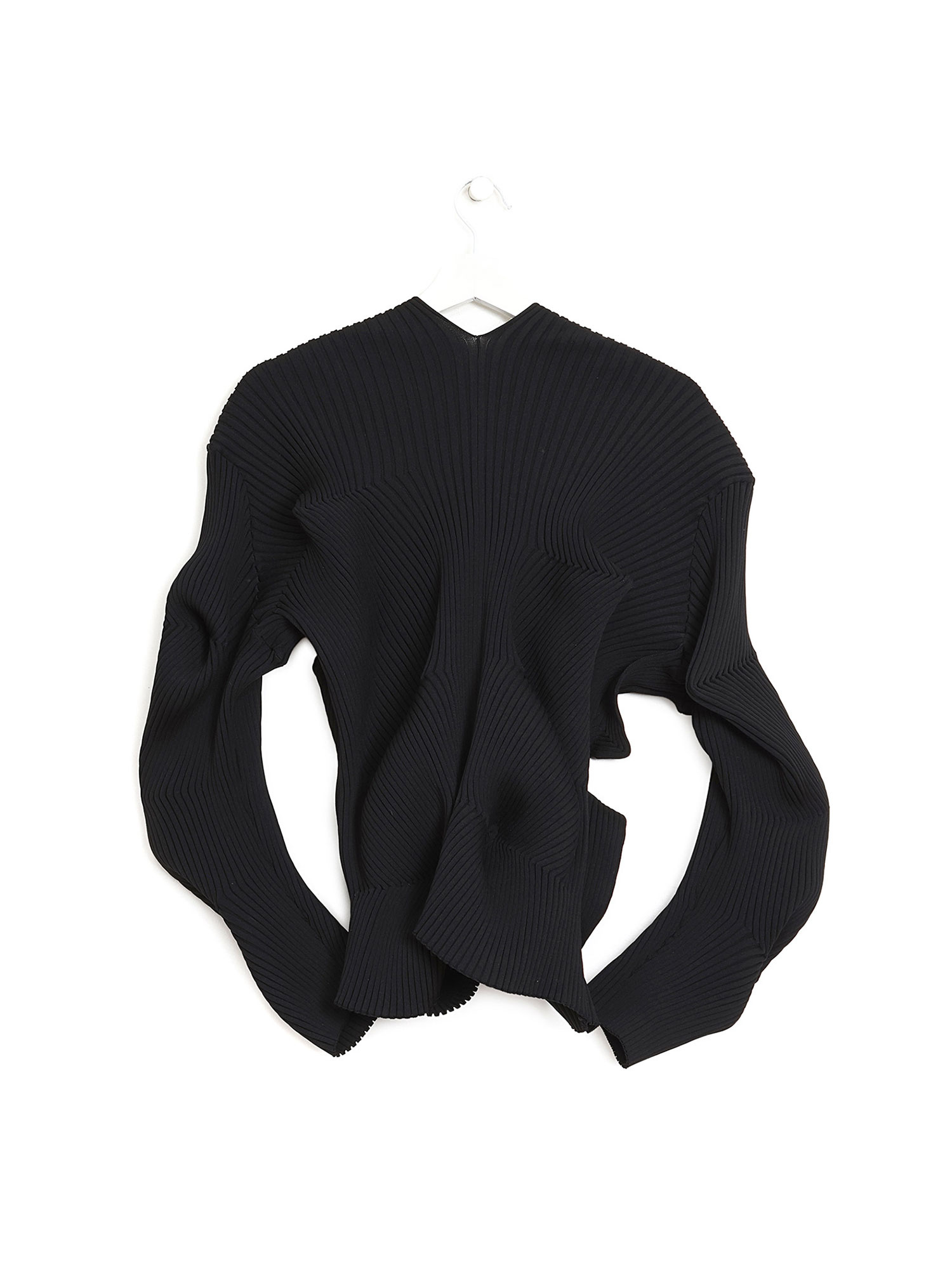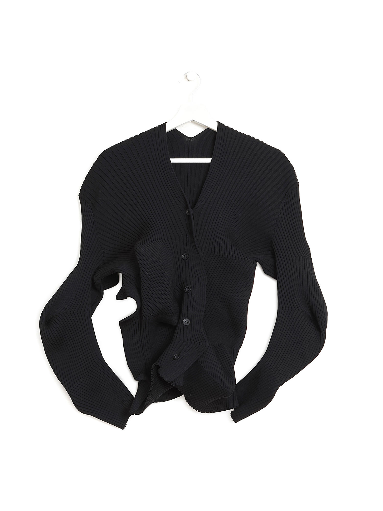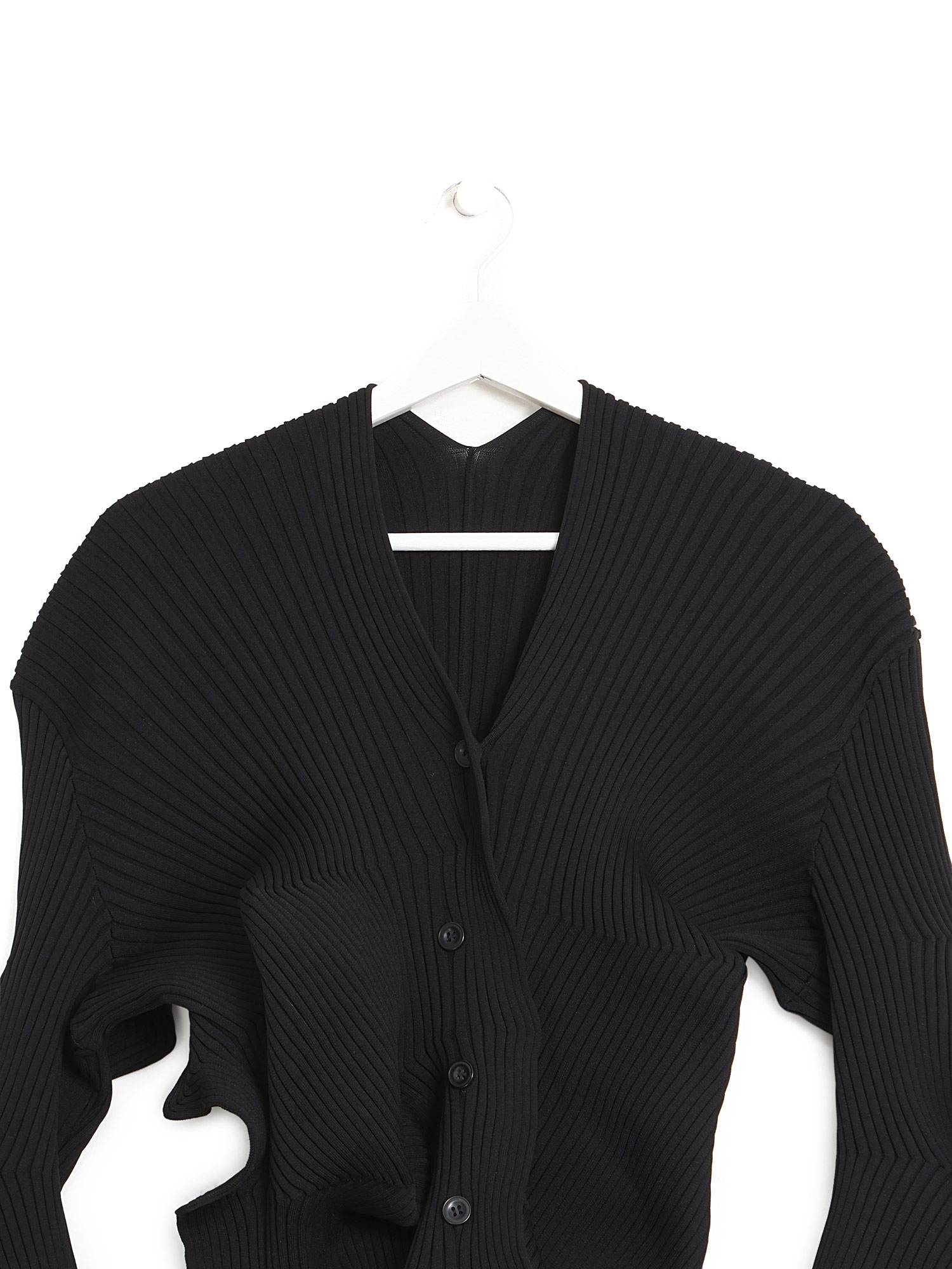 Chandail à manches longues côtelé en noir avec fermeture à boutons et coupe sculpturale.