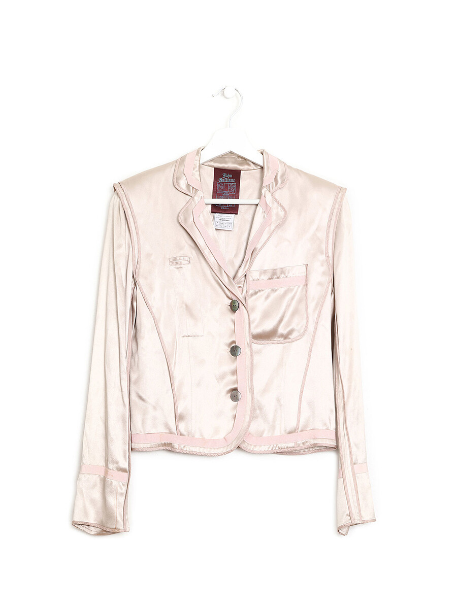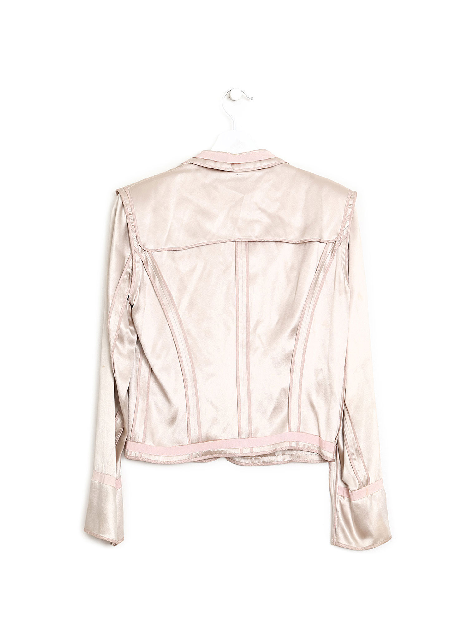 Veste à manches longues beige avec passepoil bicolore rose pâle. Fermeture par boutons au devant. Col chemise. Poche unique sur la poitrine.