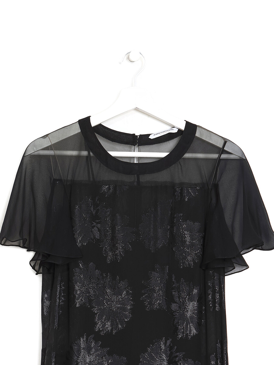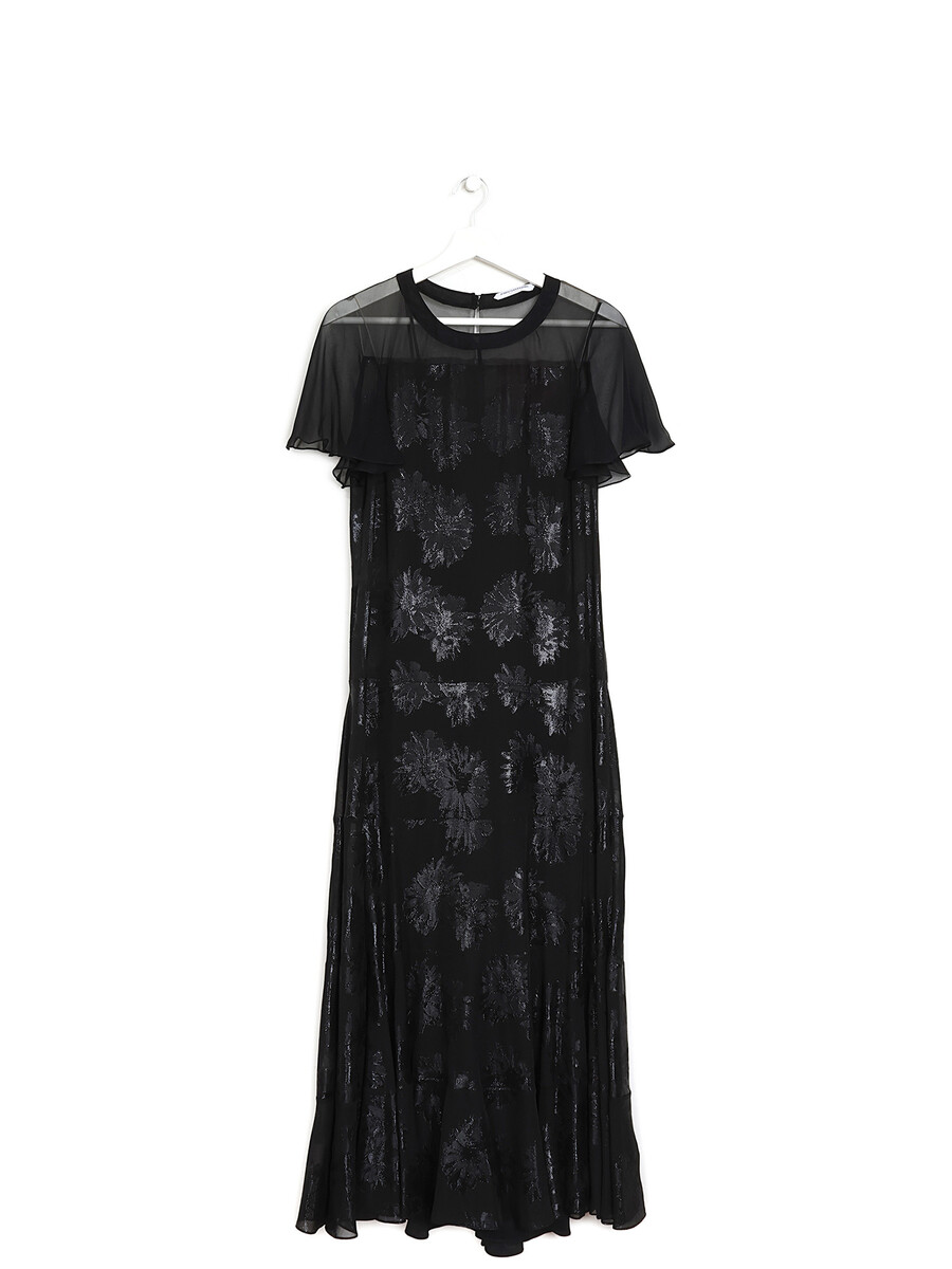 Ensemble robe longue semi-transparente à motif floral ton sur ton noir scintillant à manches courtes. Doublure en satin noir avec encolure en V. Col rond, fermeture à glissière et boutons.