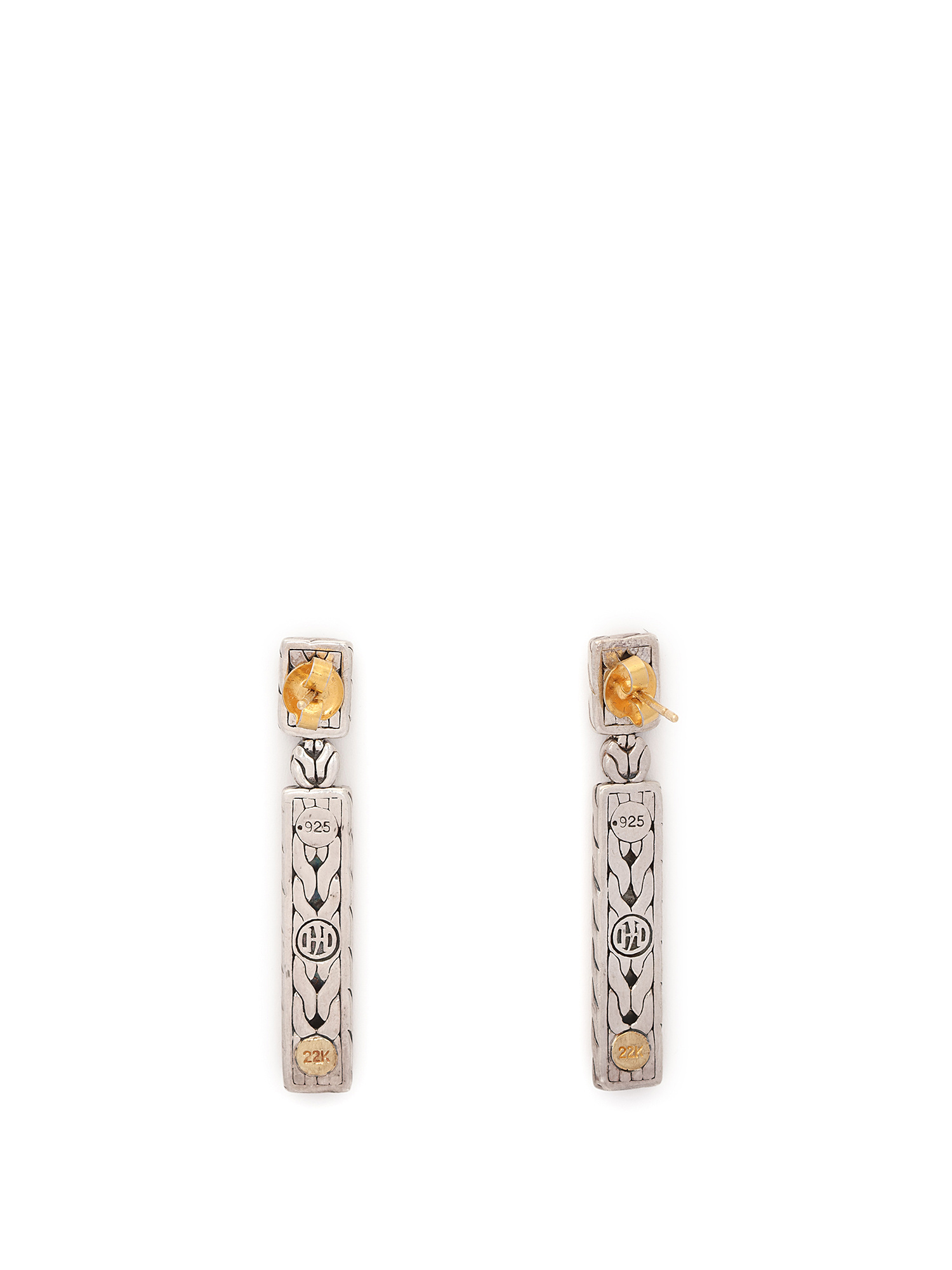 Boucles d'oreilles en forme de barre avec texture martelée en or et argent. Détails gravés. Fabriqué en argent 925 et or 22 carats.