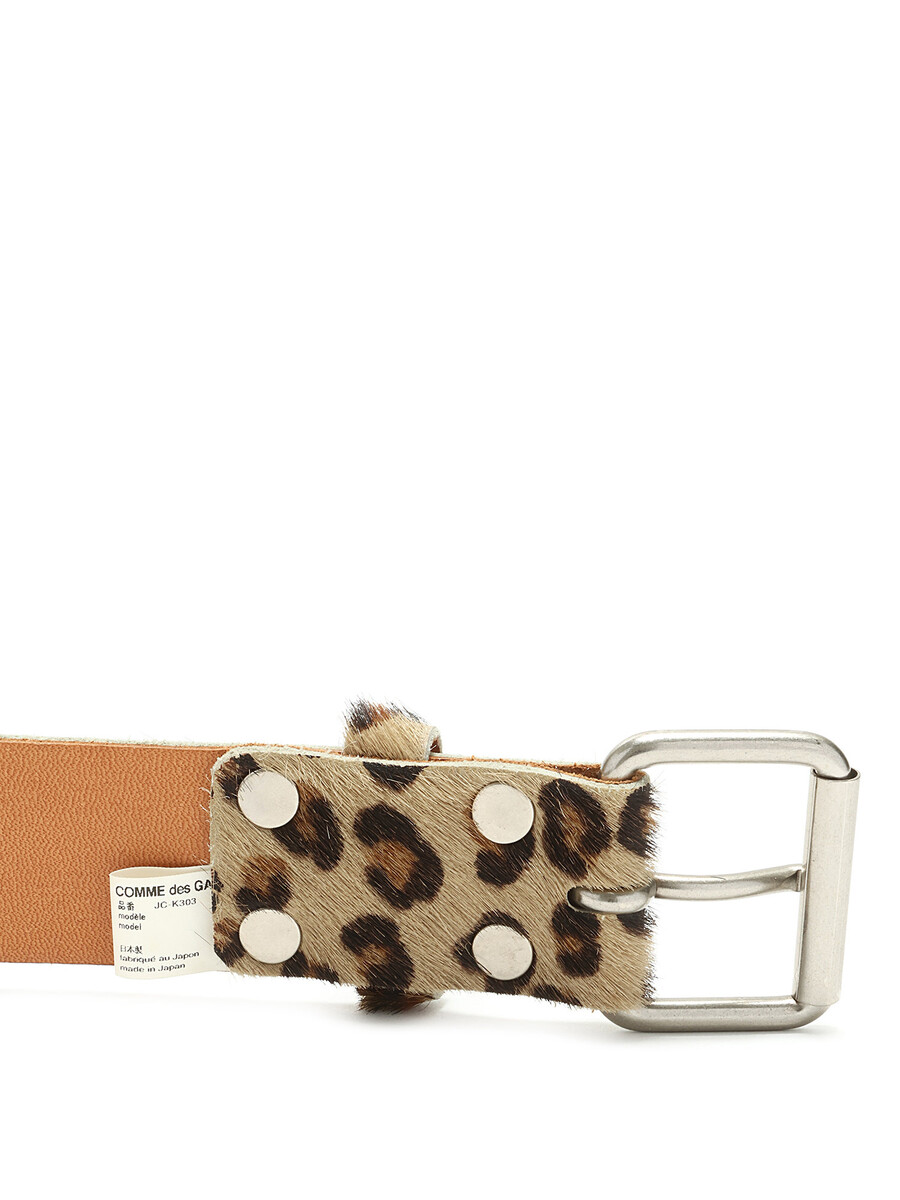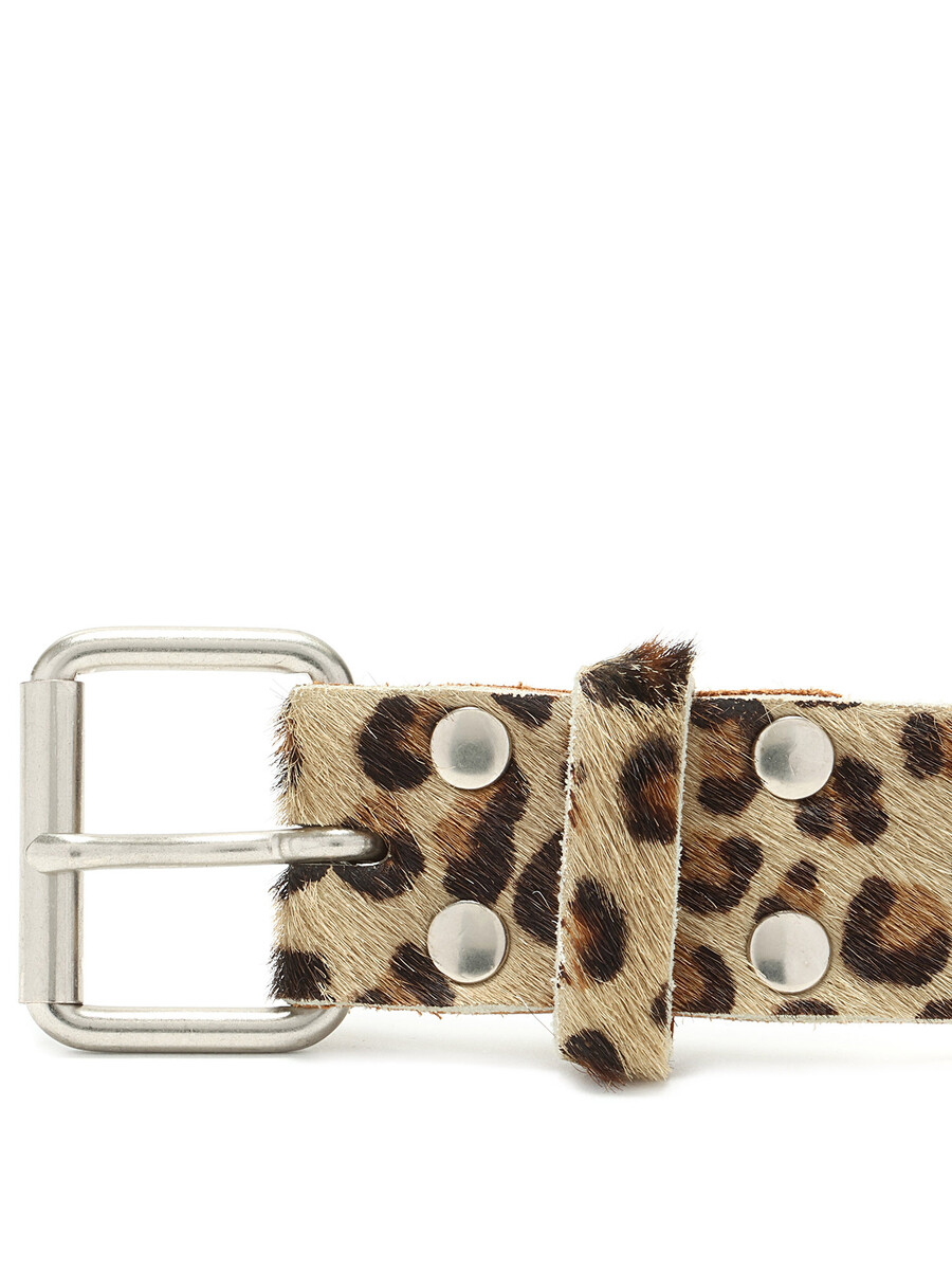 Ceinture en cuir à motif léopard brun et noir avec détails à franges. Boucle en métal argenté.