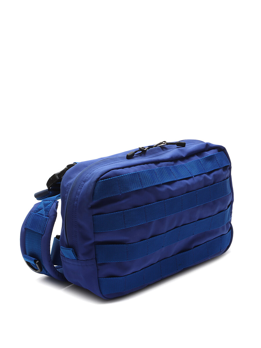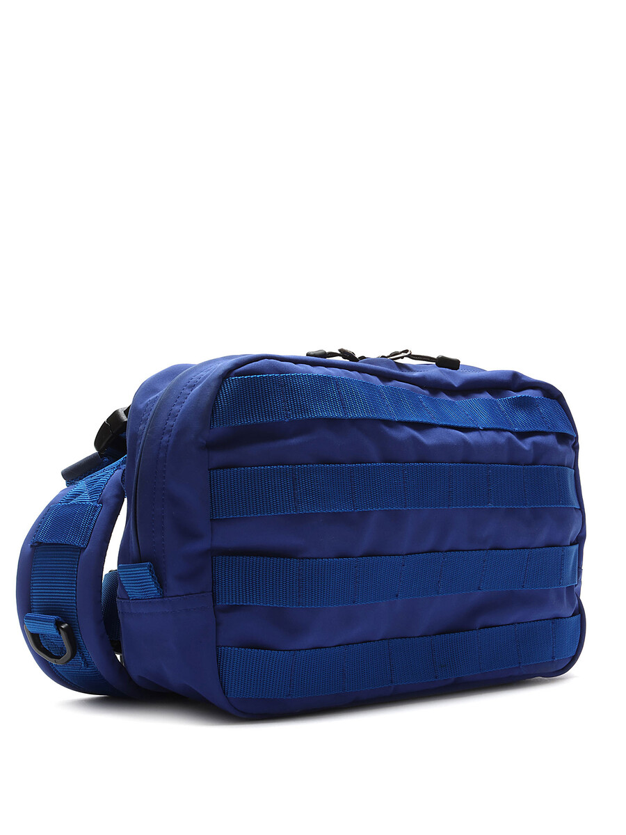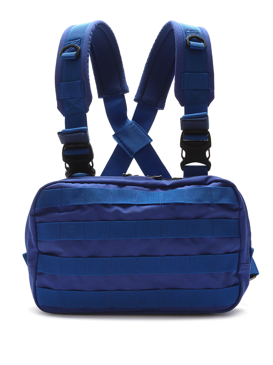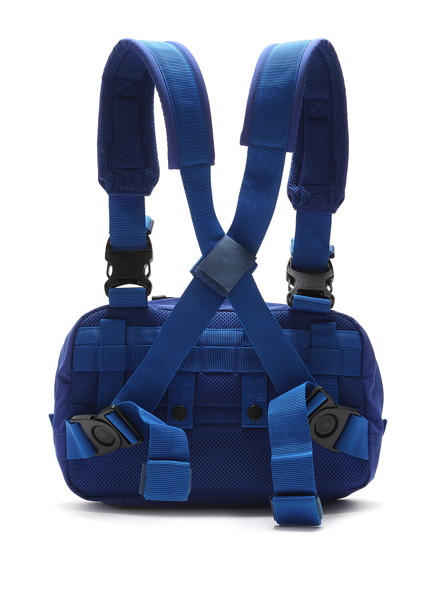 Sac harnais à la poitrine bleu avec sangles ajustables. Fermetures par boutons-pression et glissière. Doublure imprimée camouflage.