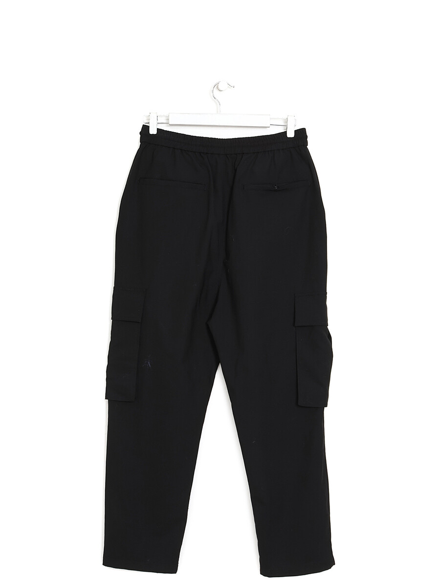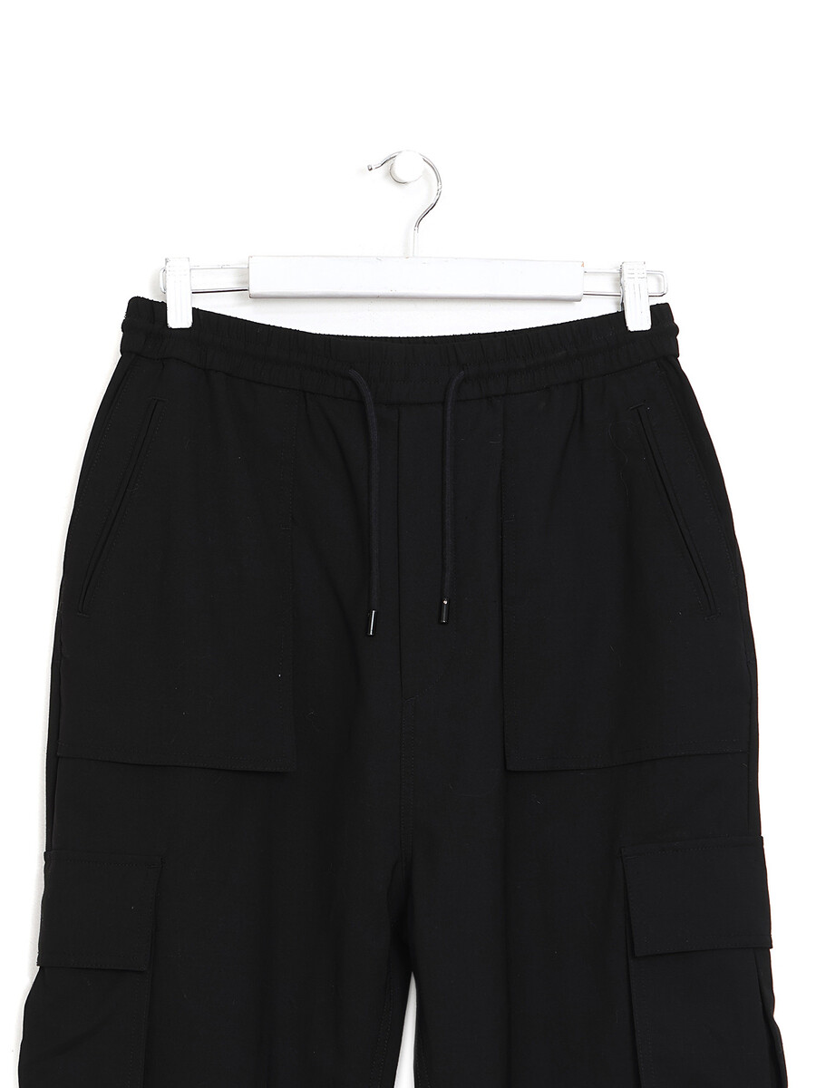 Pantalon cargo noir coupe décontractée avec ceinture élastique à cordons. Poches cargo latérales.