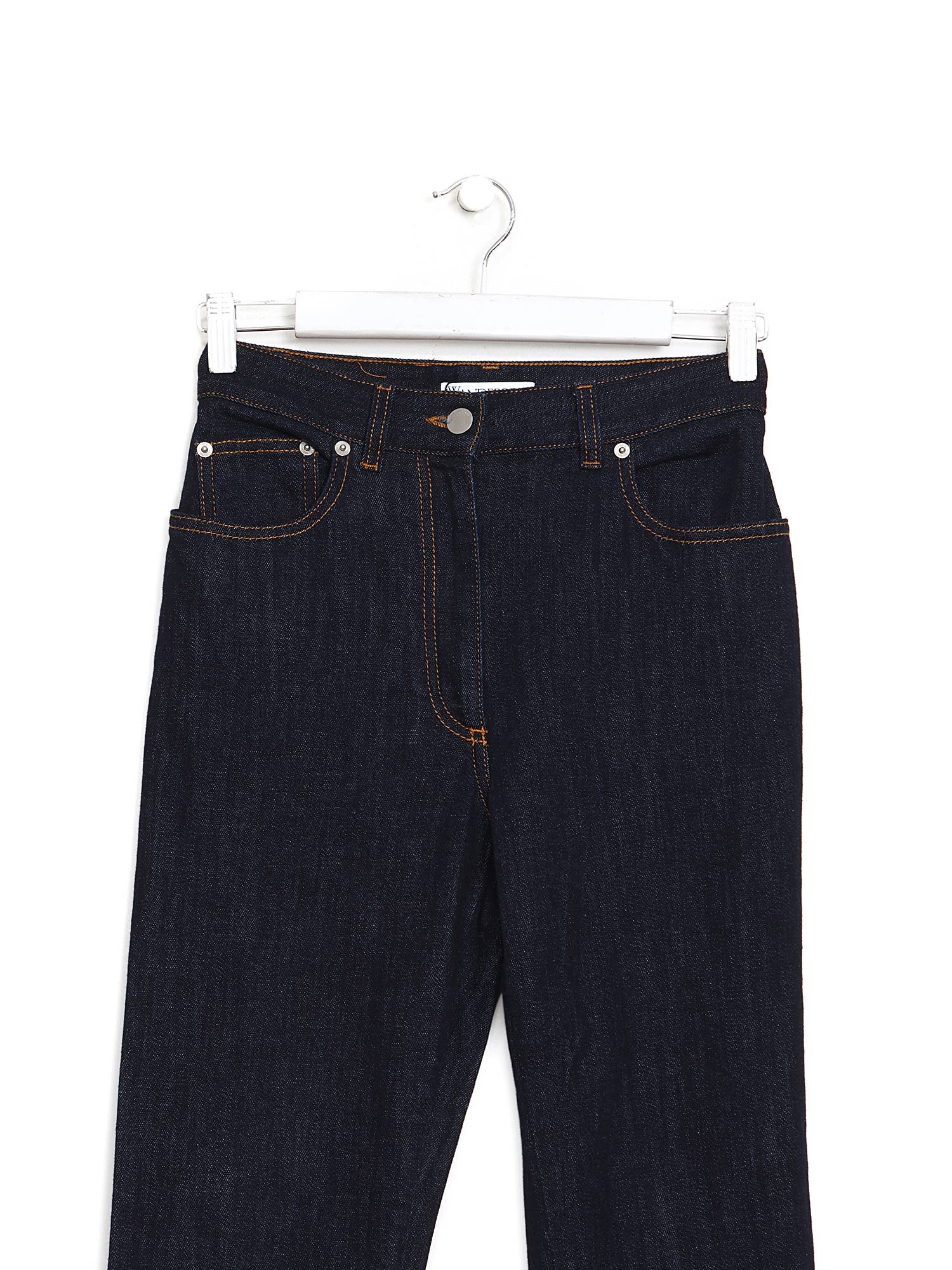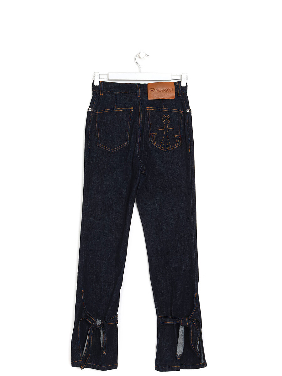 Jeans skinny taille haute en indigo avec poches arrière brodées d'une ancre et nœuds décoratifs aux chevilles.