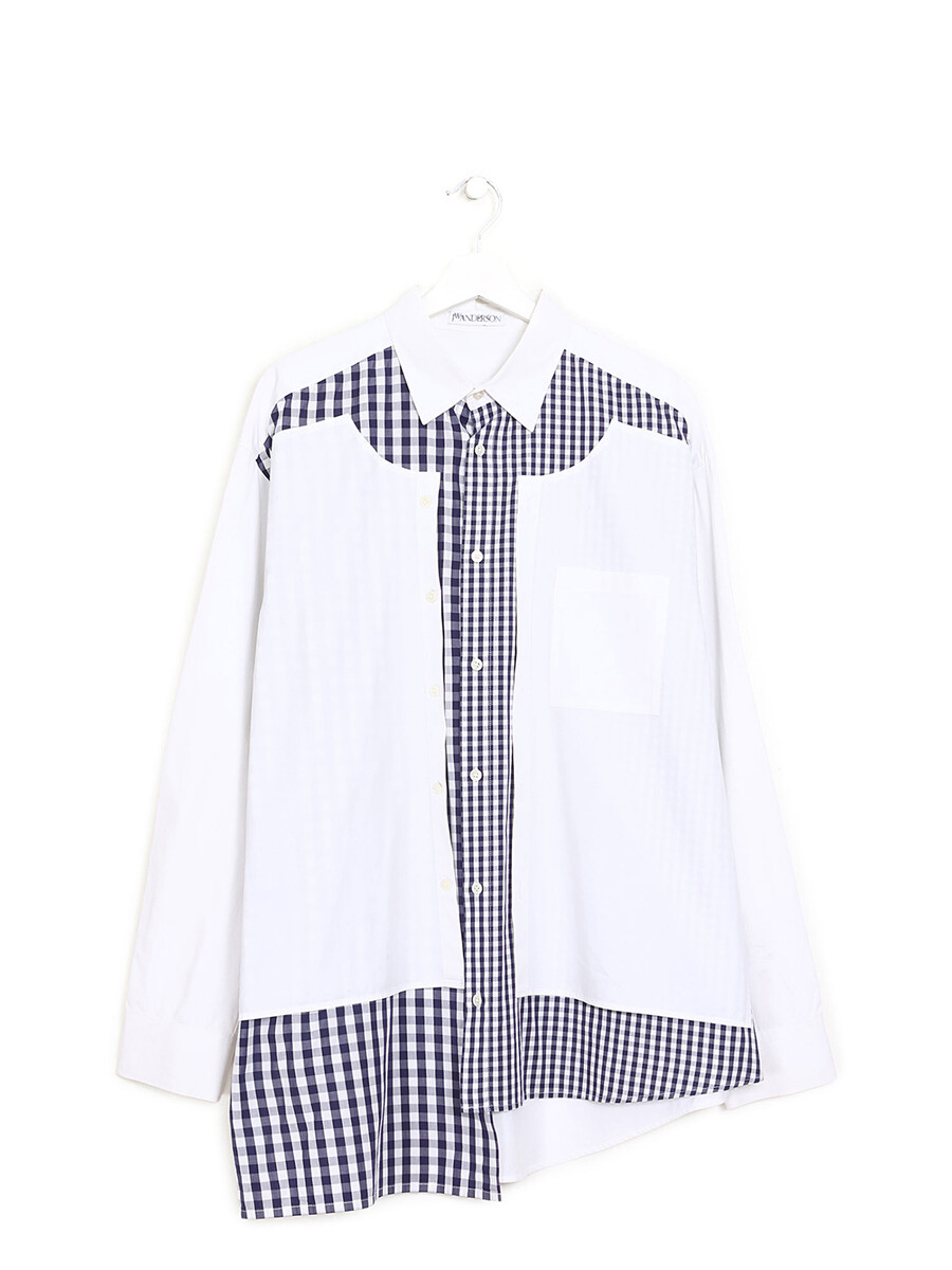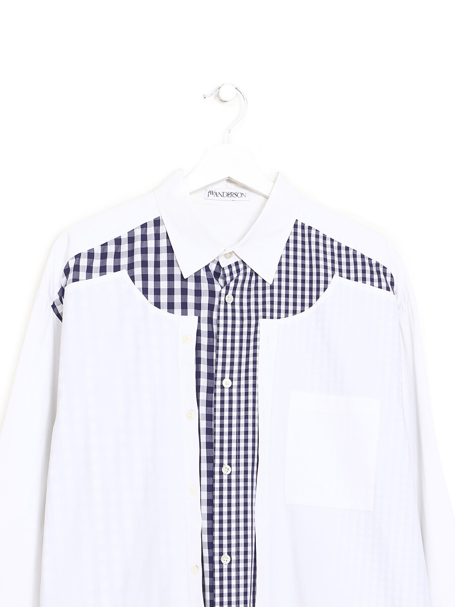 Chemise asymétrique en coton à motif vichy bleu et blanc à manches courtes. Col à rabat classique. Patte de boutonnage devant.