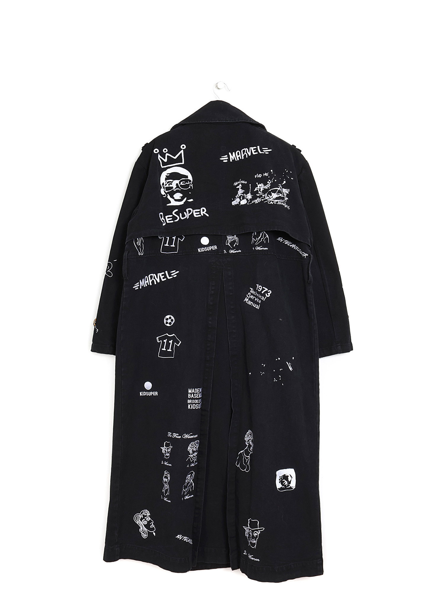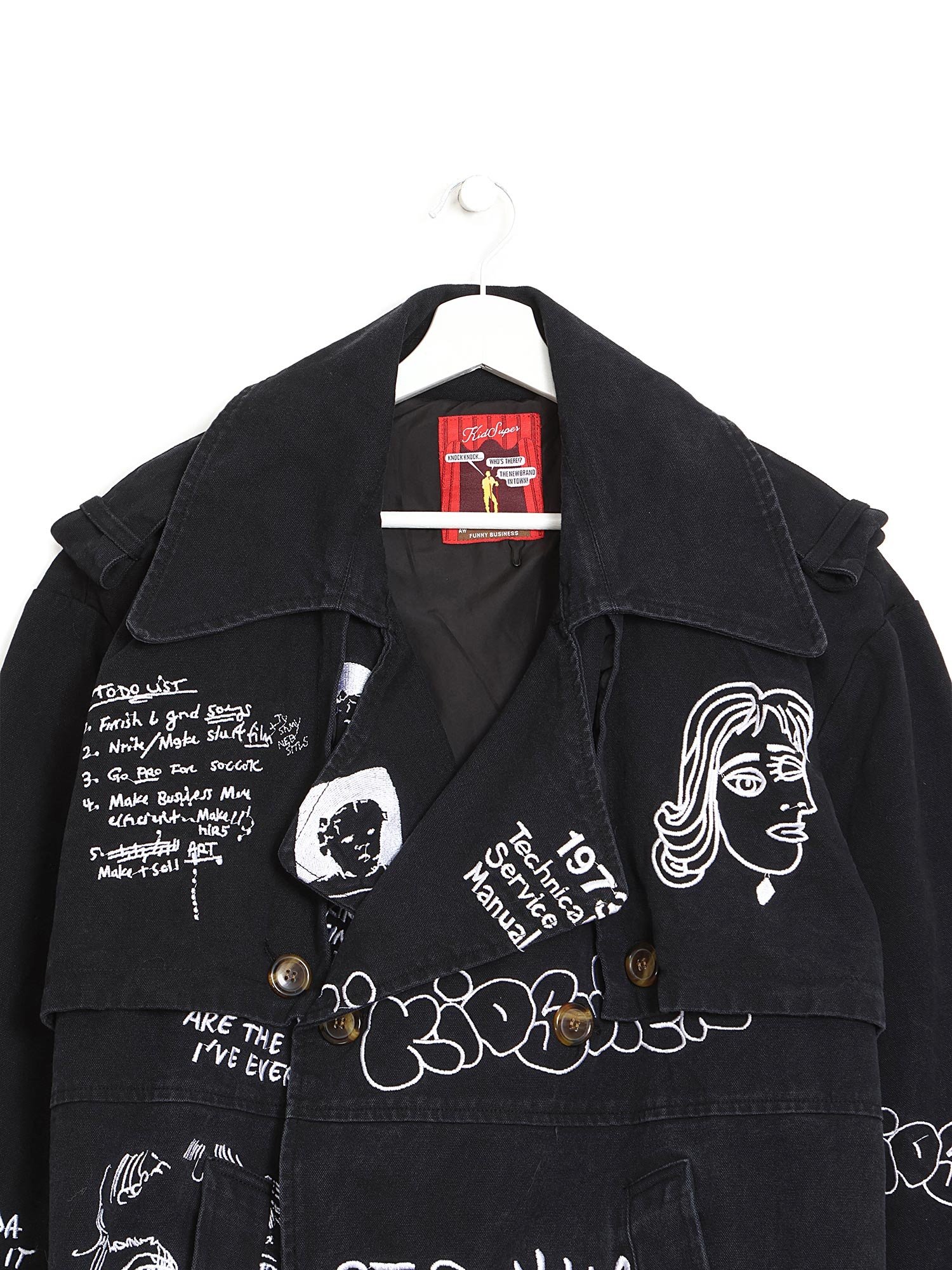 Veste de type "trench" longue avec broderies dans les tons de noir et blanc. Col à revers cranté. Fermeture à boutons.
