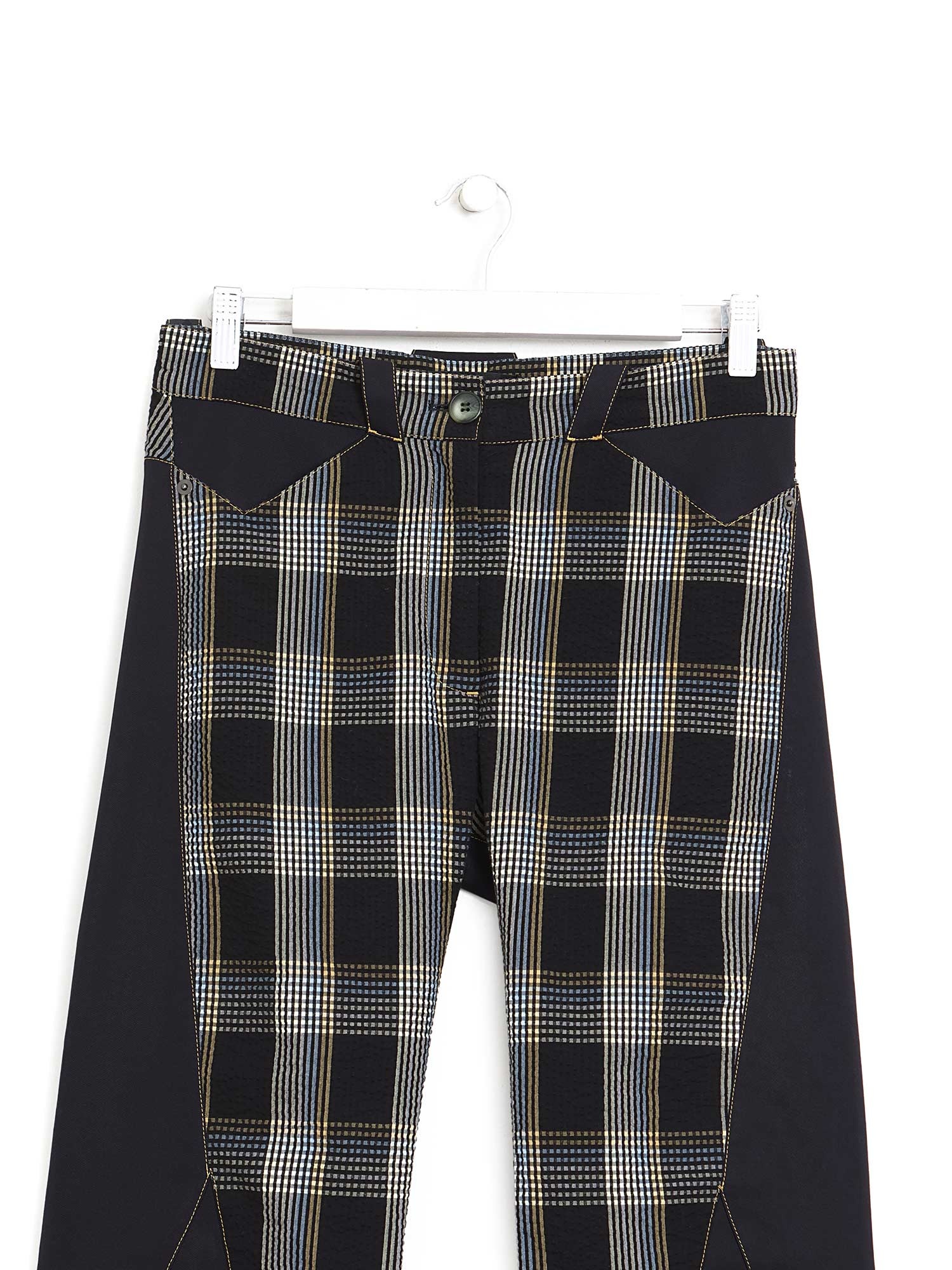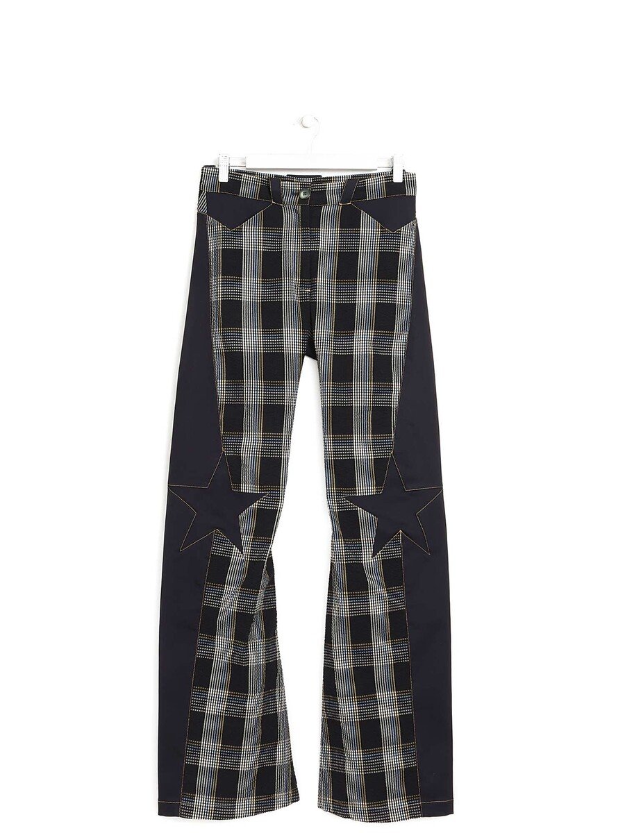 Pantalon à motif à carreaux en gris et noir avec des découpes étoiles aux genoux.