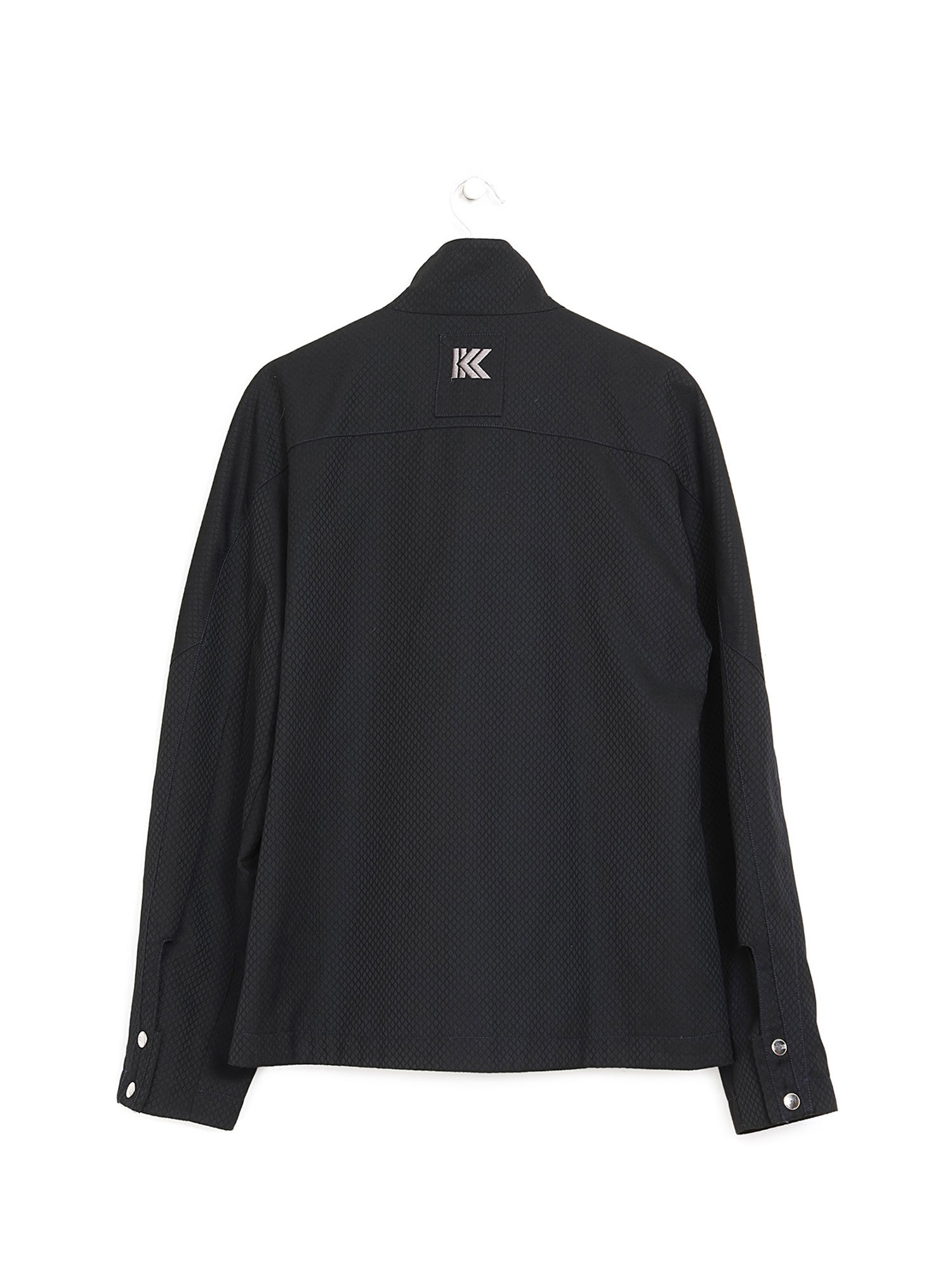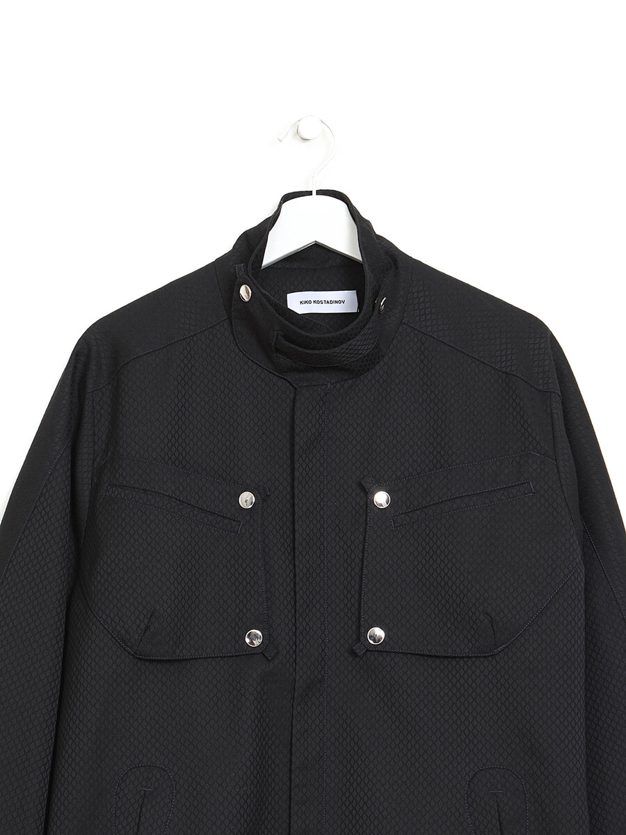 Blouson en laine noire avec col montant, fermeture éclair et boutons-pression. Poches plaquées à la poitrine et poches passepoilées latérales.