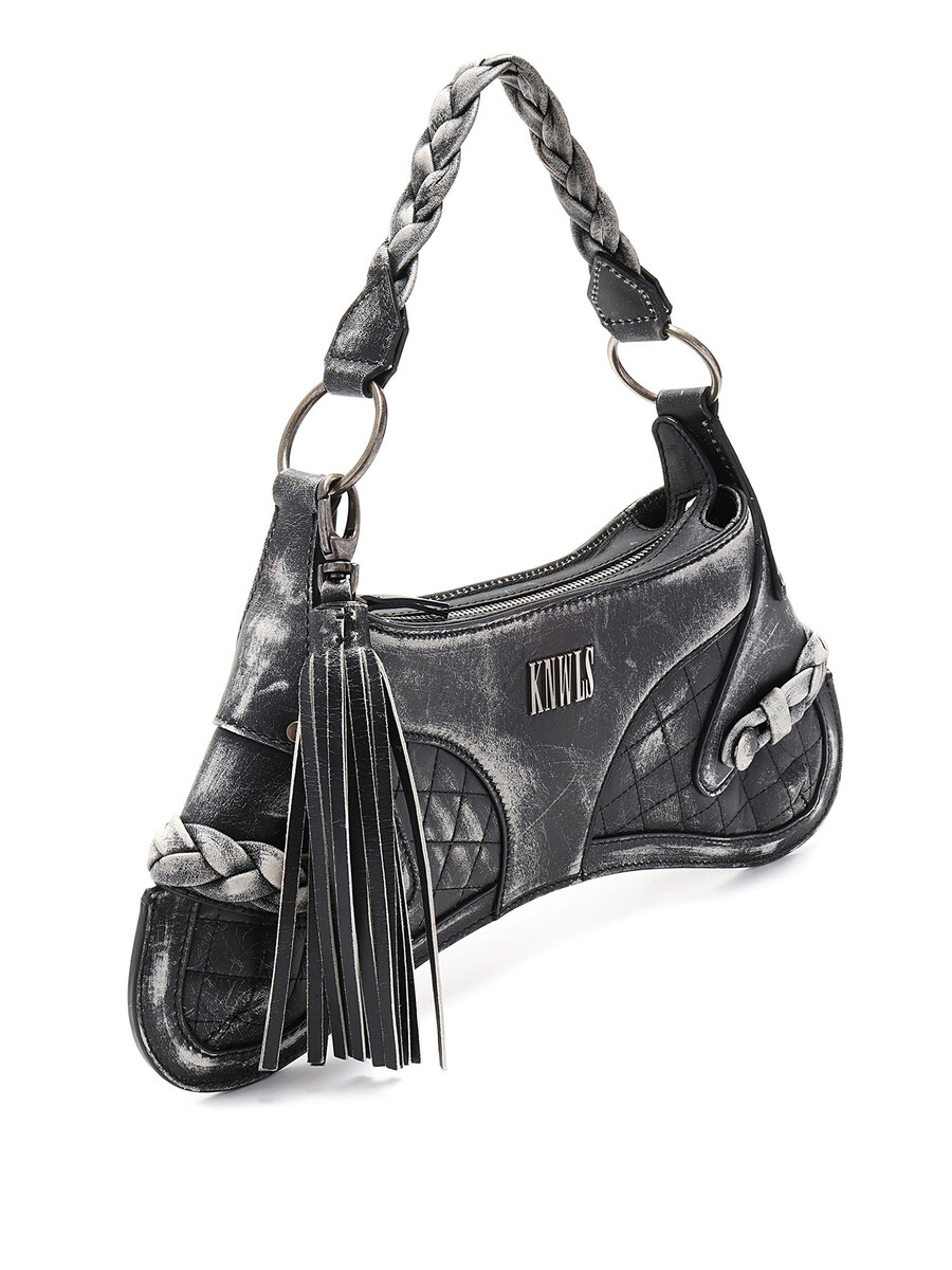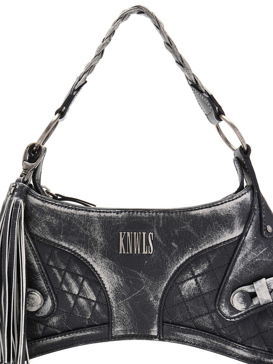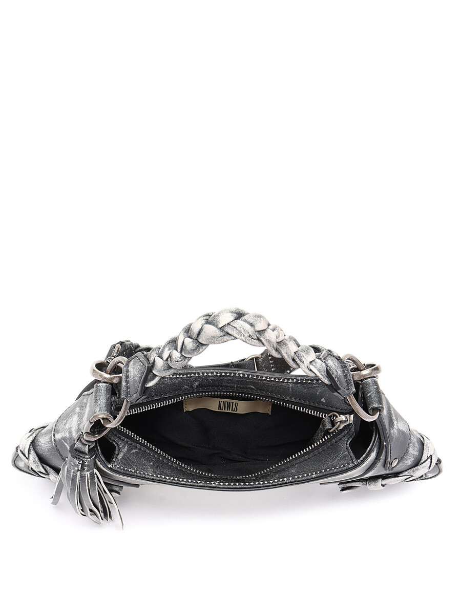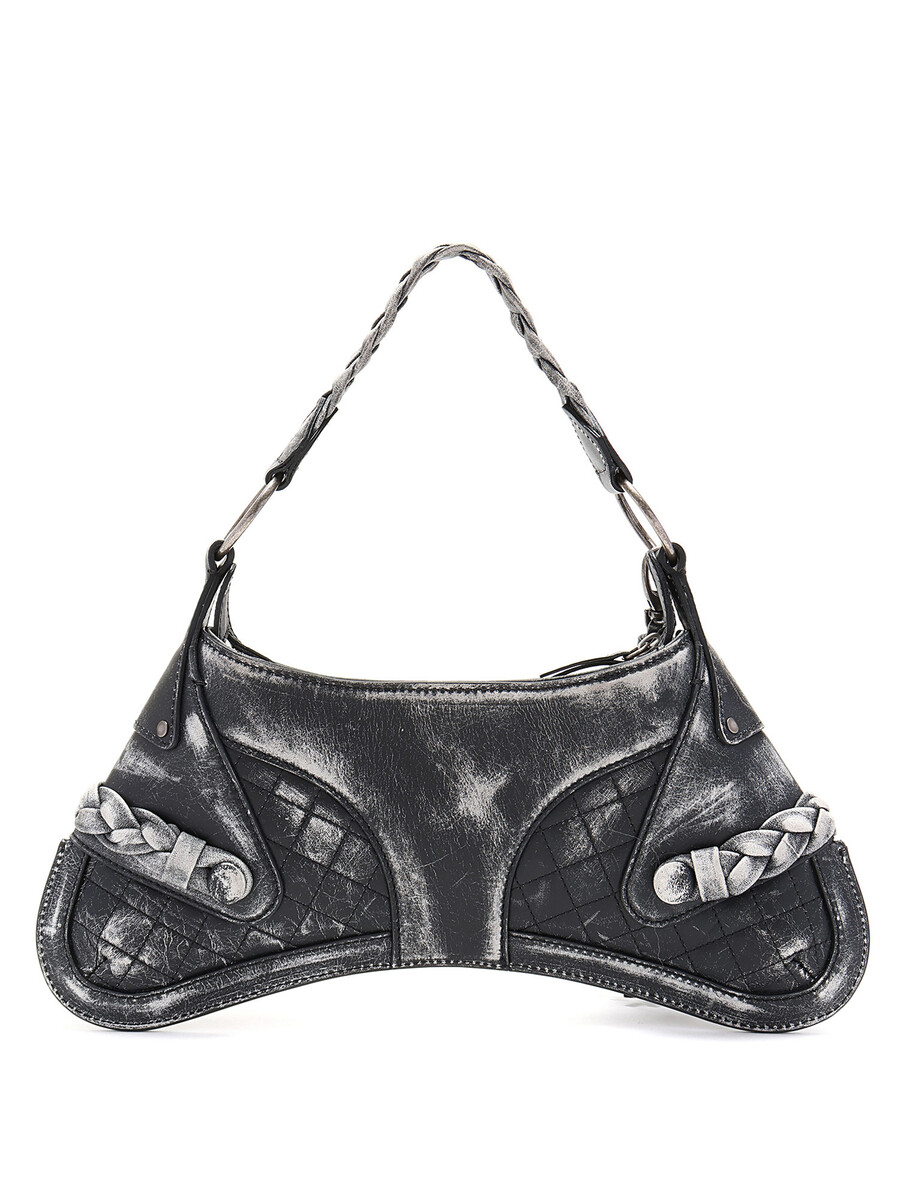 Sac à l’épaule en cuir grainé gris délavé avec ferrures en métal argenté. Détails matelassés et tressés partout. Plaque logo sur le devant. Poignée avec bandoulière amovible. Fermeture éclair sur le dessus.