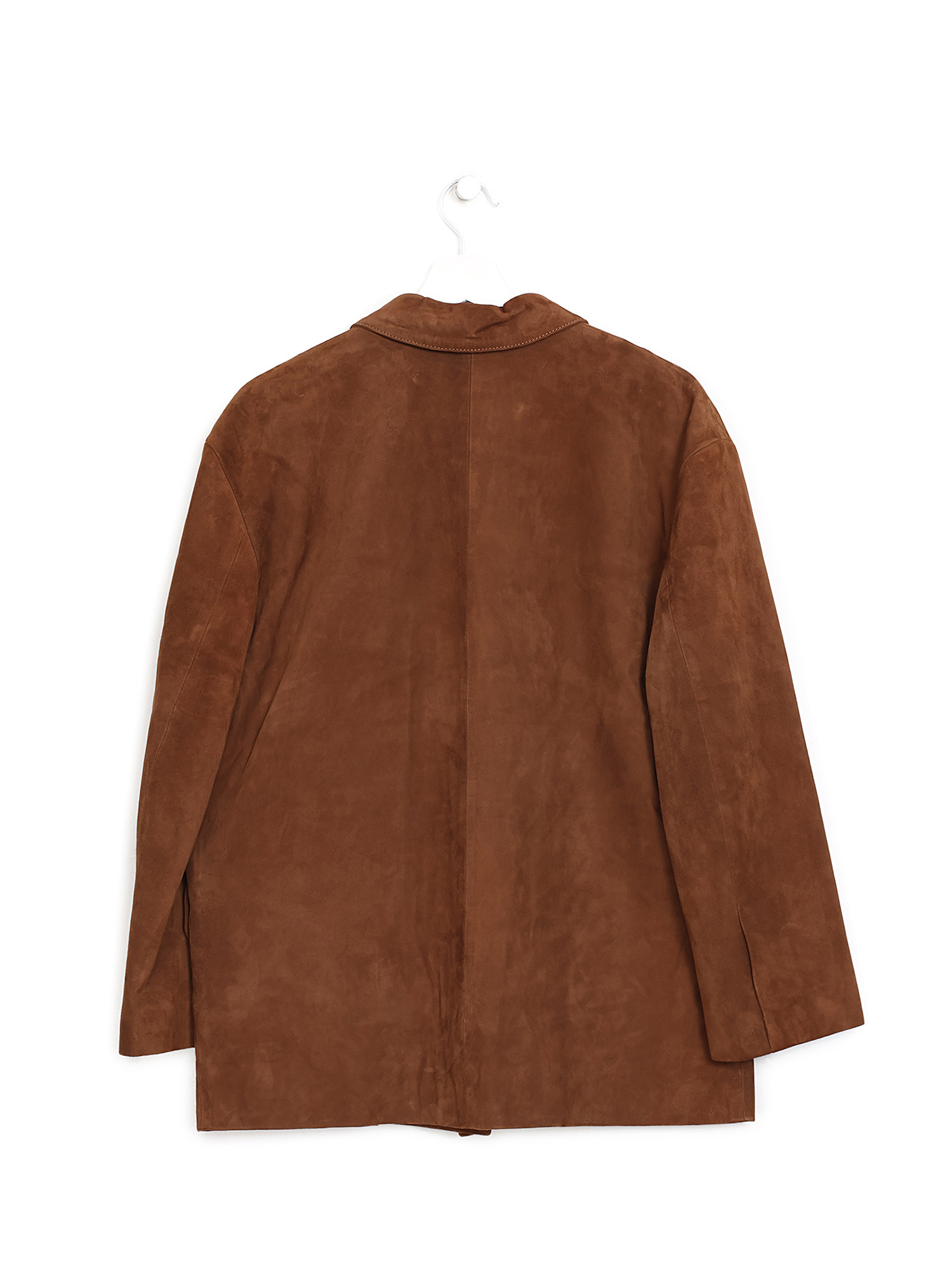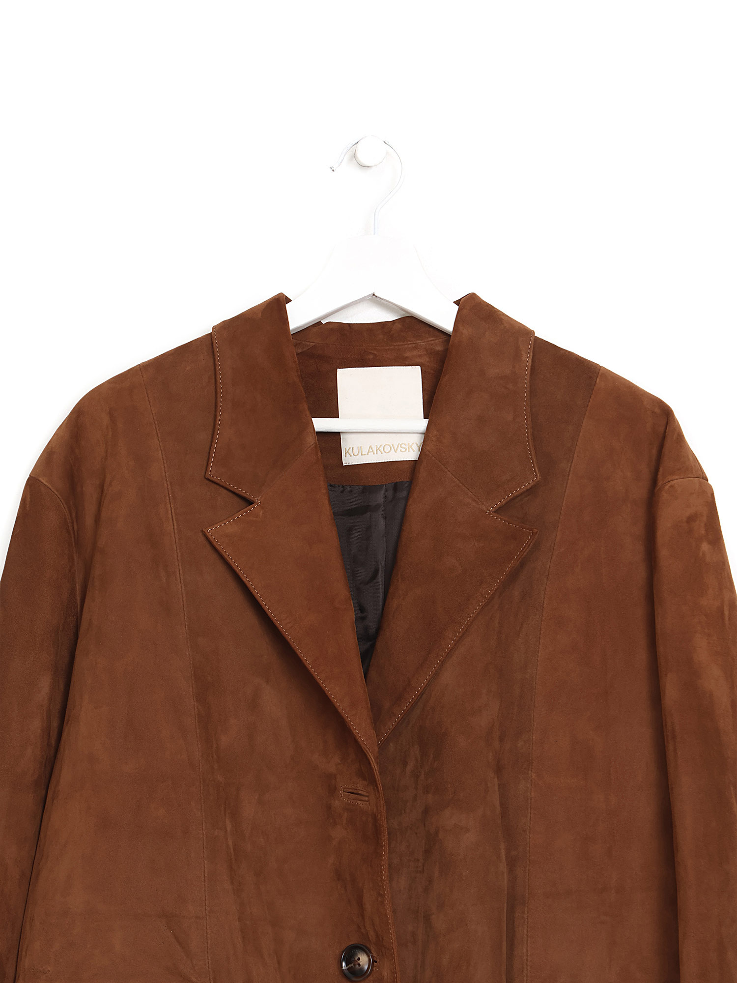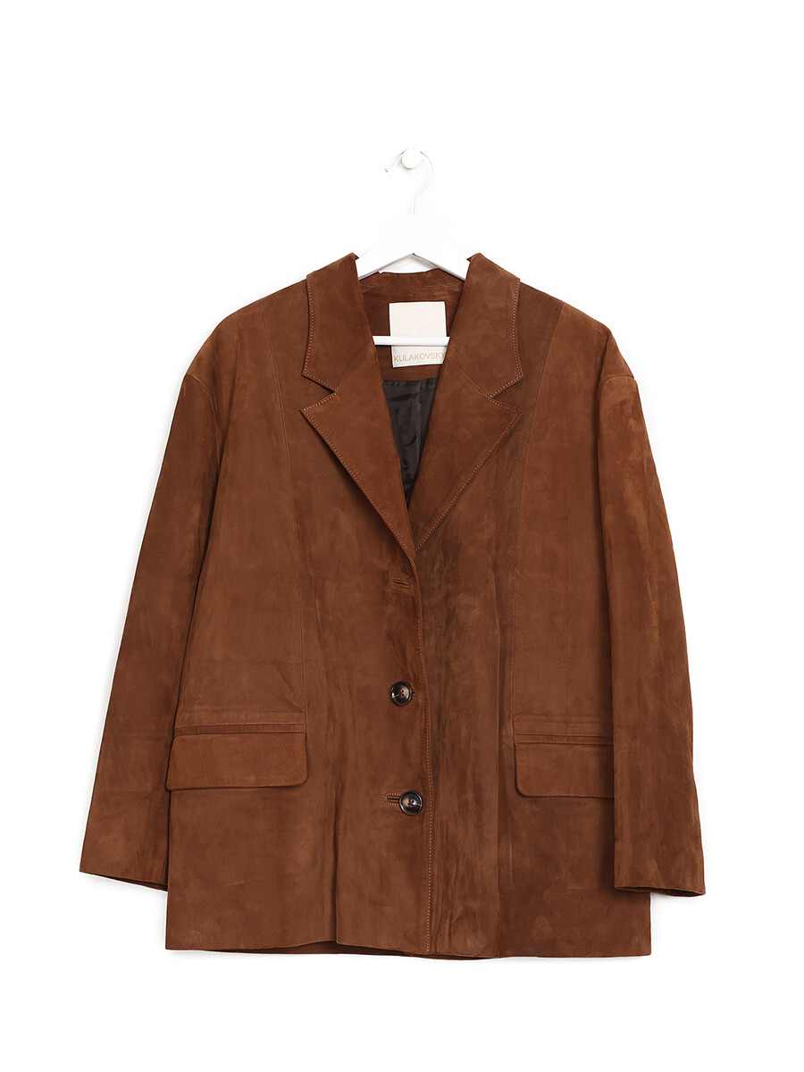 Veste en cuir d'agneau en brun. Revers. Boutonnière. Ganses pour ceinture ajustable à la taille.