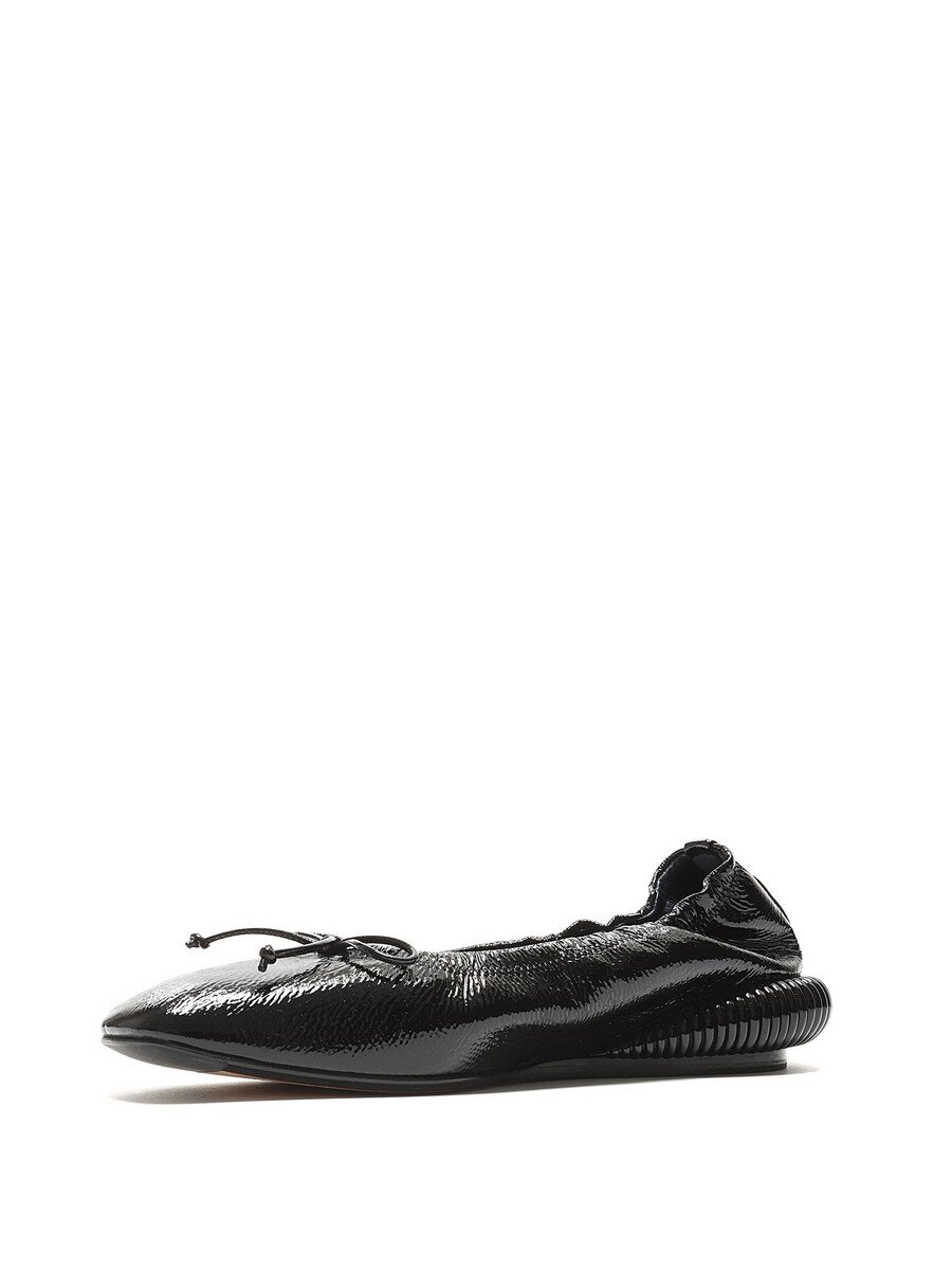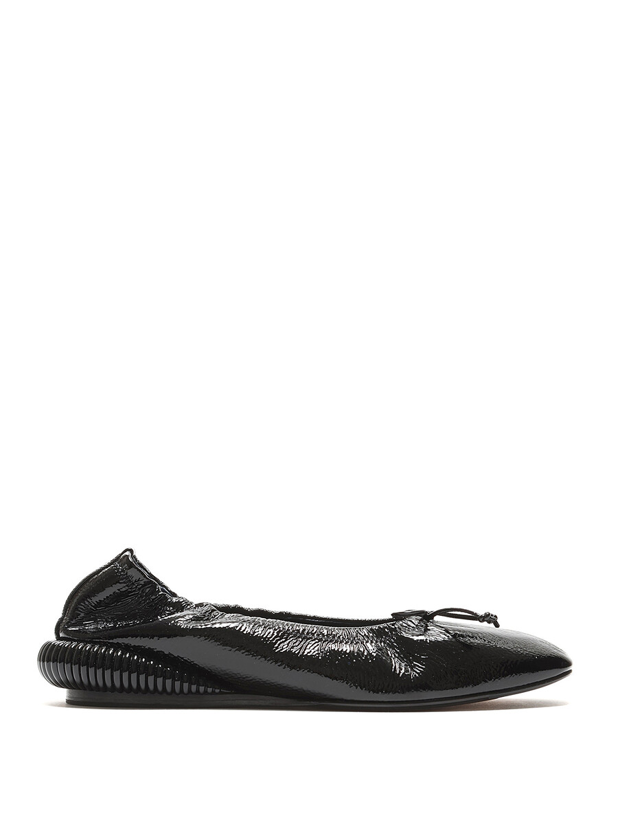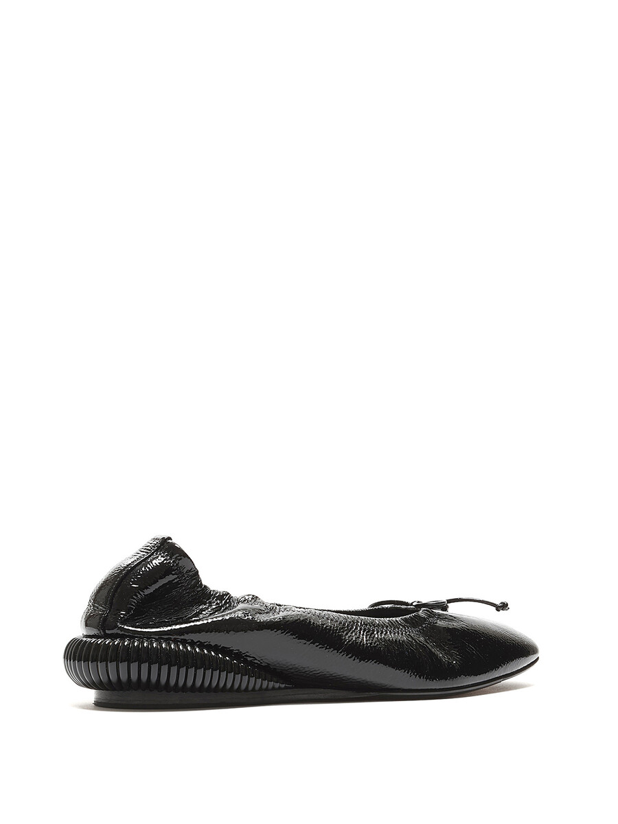 Ballerines en cuir verni noir avec détail sculptural au talon. Design à enfiler avec un bout rond. Dotées d'une semelle en cuir. Avec boîte.