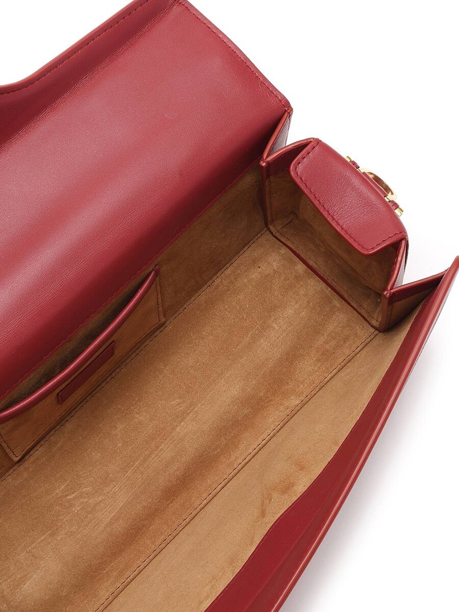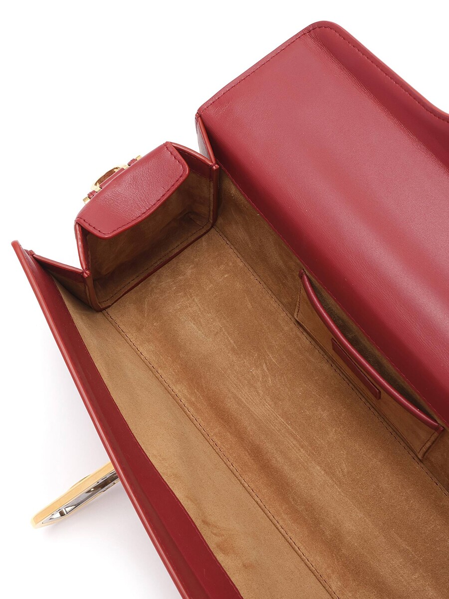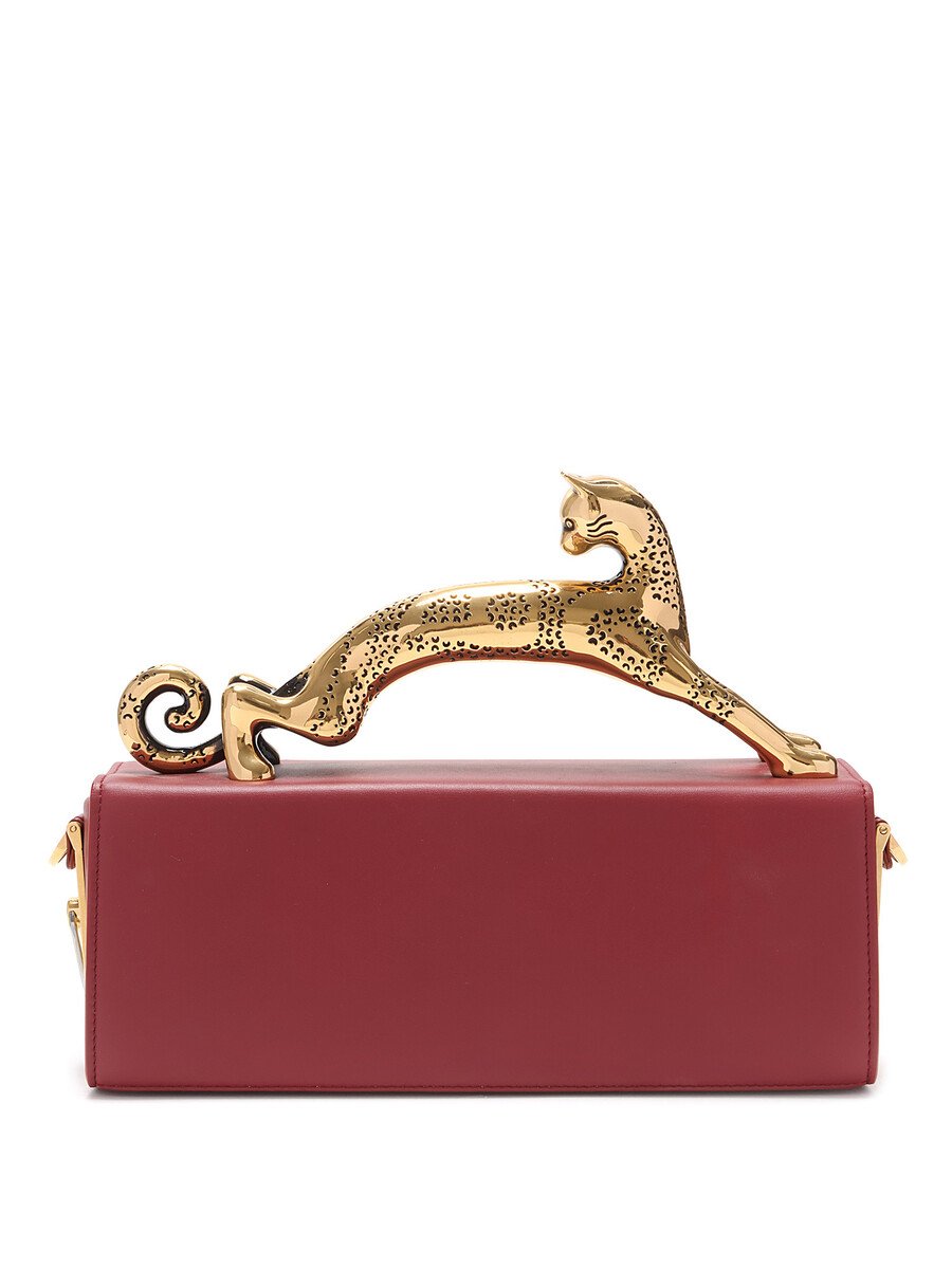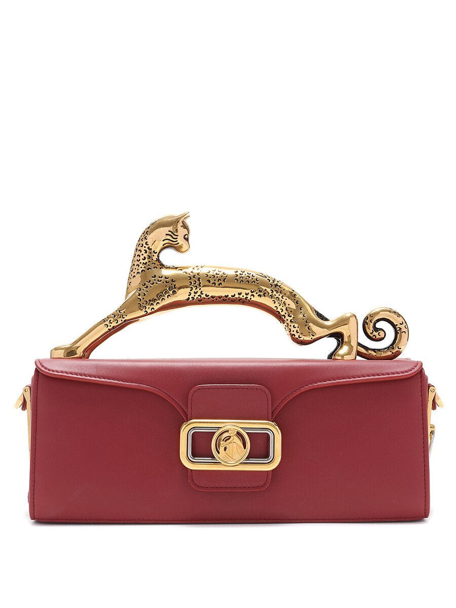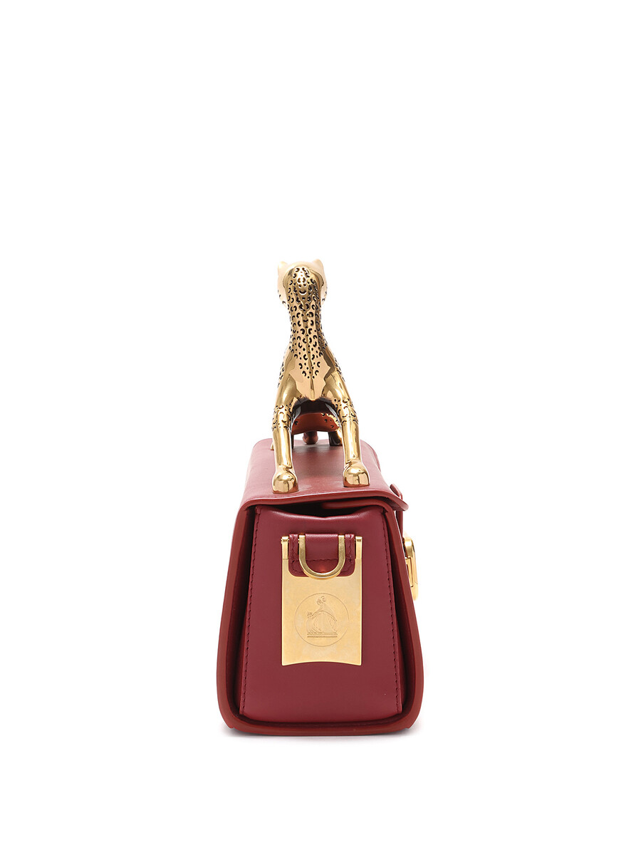 Sac à main en cuir rouge pâle avec une poignée supérieure en forme de panthère dorée. Fermeture à rabat avec détail de logo. Bandoulière en cuir amovible et réglable.