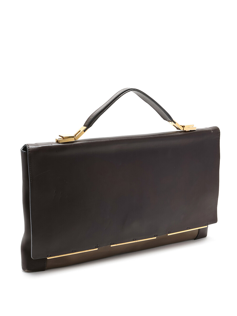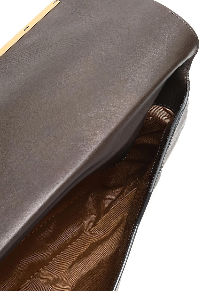 Sac à bandoulière en cuir lisse marron foncé avec bords contrastants. Ferrures dorées.