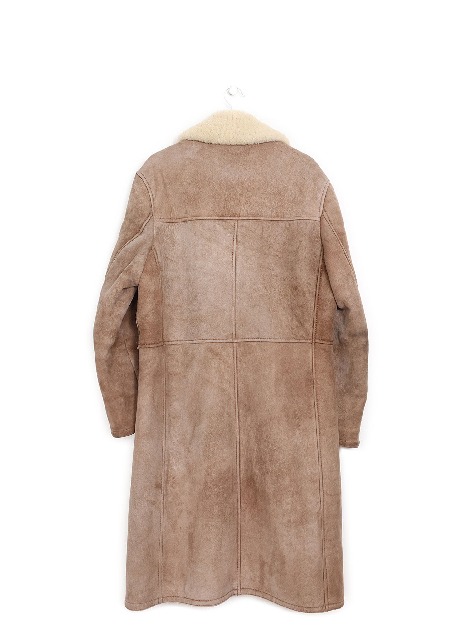 Manteau long en peau de mouton beige. Fermeture à boutons sur le devant. Grand col. Deux poches à rabat à l'avant.