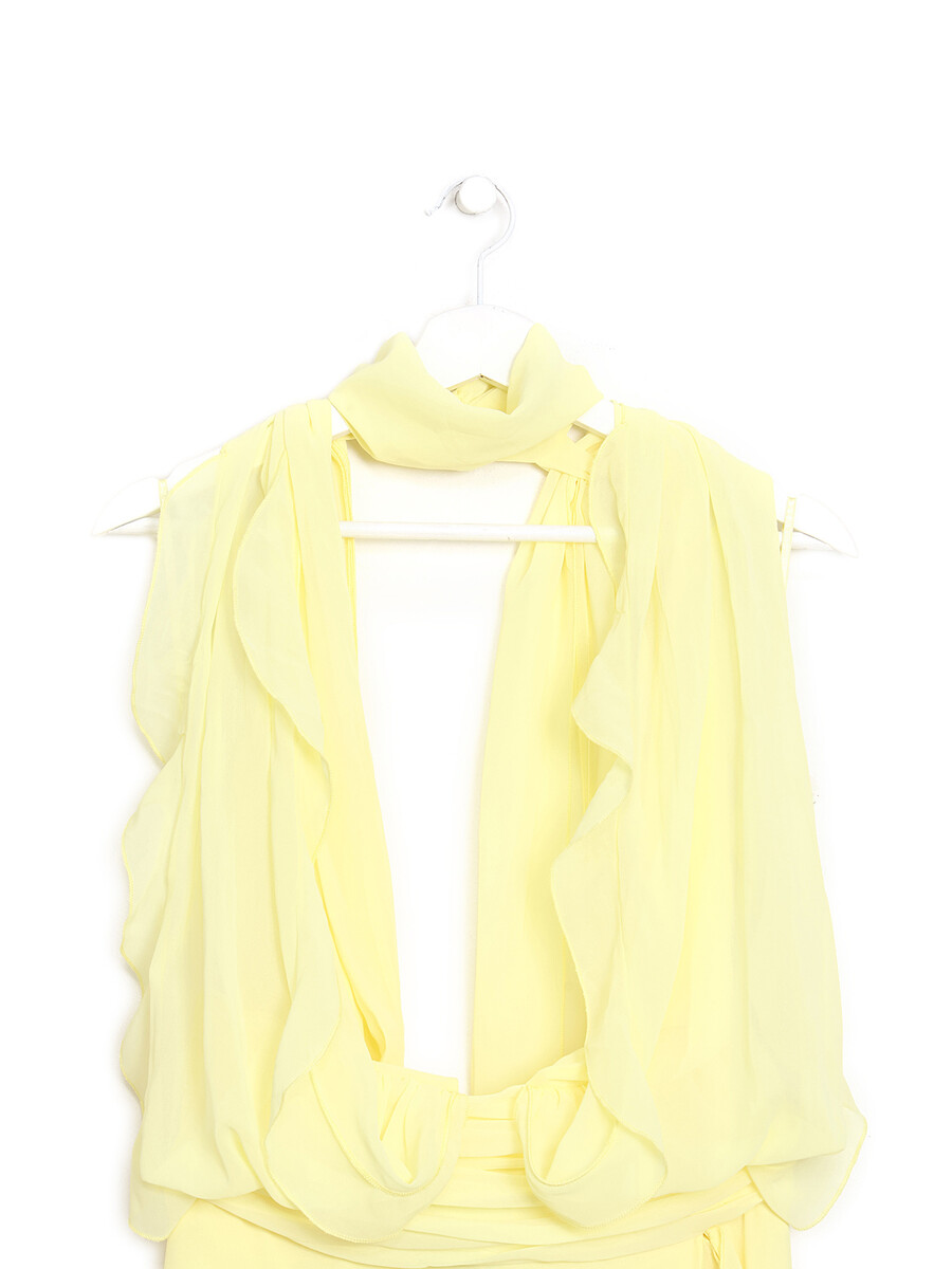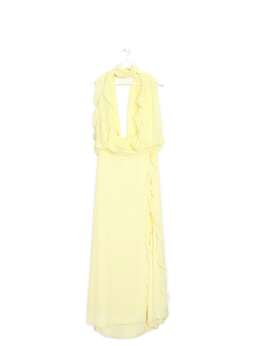 Robe longue jaune avec détails de volants le long du devant. Encolure en V. Détail de collier amovible. Fermeture à glissière au dos.
