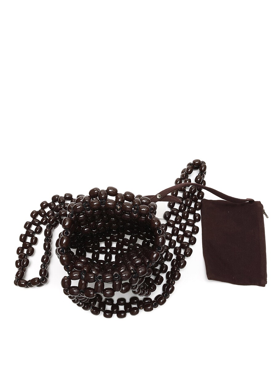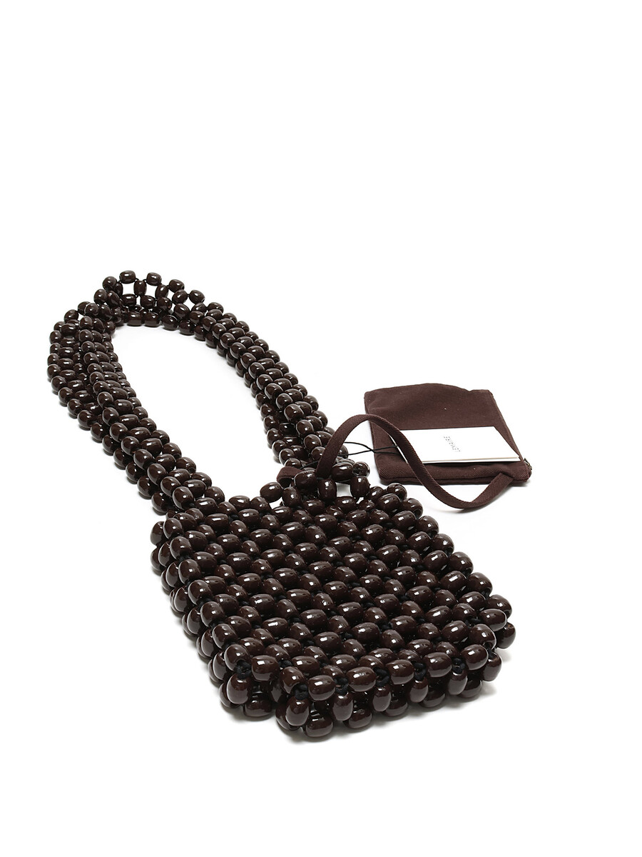 Sac à bandoulière en perles tissées brun foncé. Ouverture sur le dessus. Bretelles en perles. Bordures en tissu. Pochette amovible. Avec dustbag.