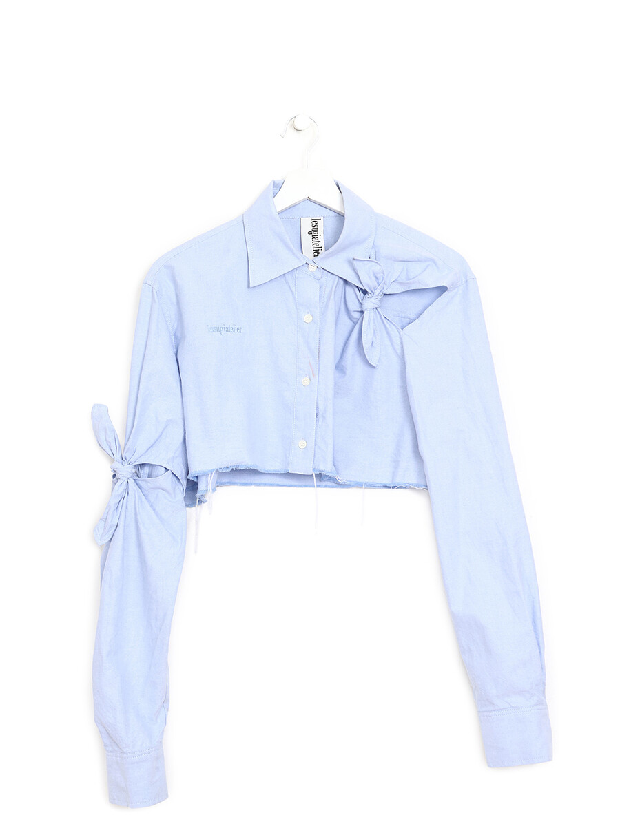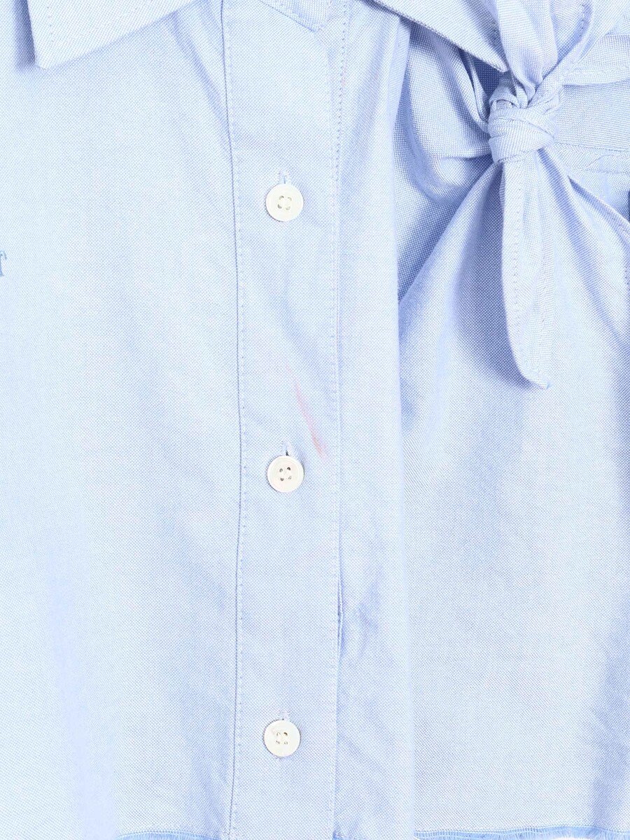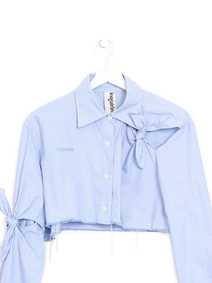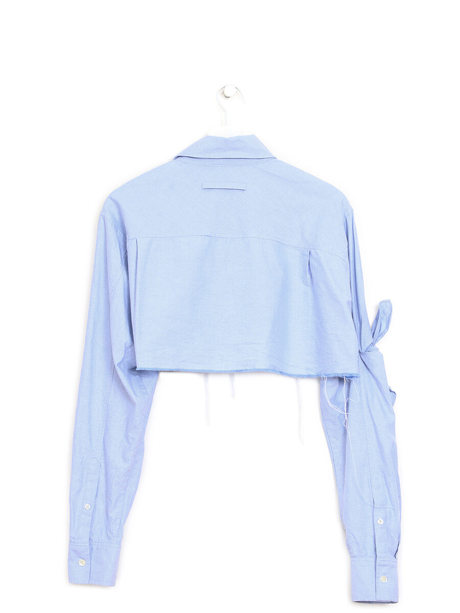 Chemise écourtée en bleu avec col classique et fermeture boutonnée. Fronces et découpes à l'épaule et à la manche.