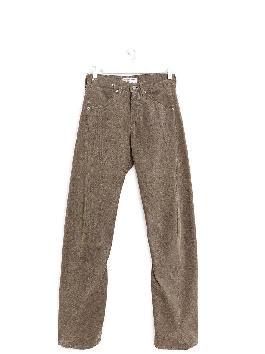Jeans à jambe droite en velours côtelé brun avec coutures torsadées. Fermeture à bouton et passants de ceinture. Style classique à cinq poches.