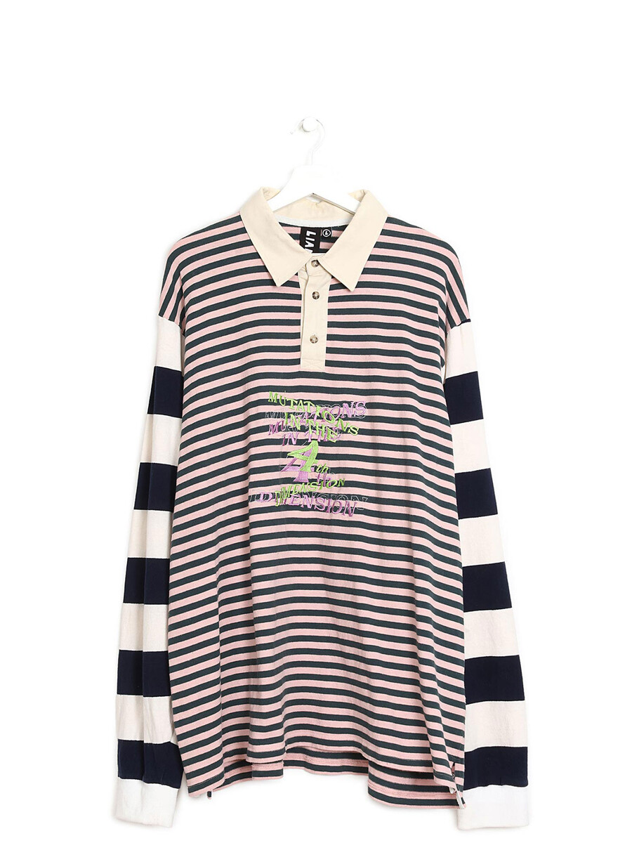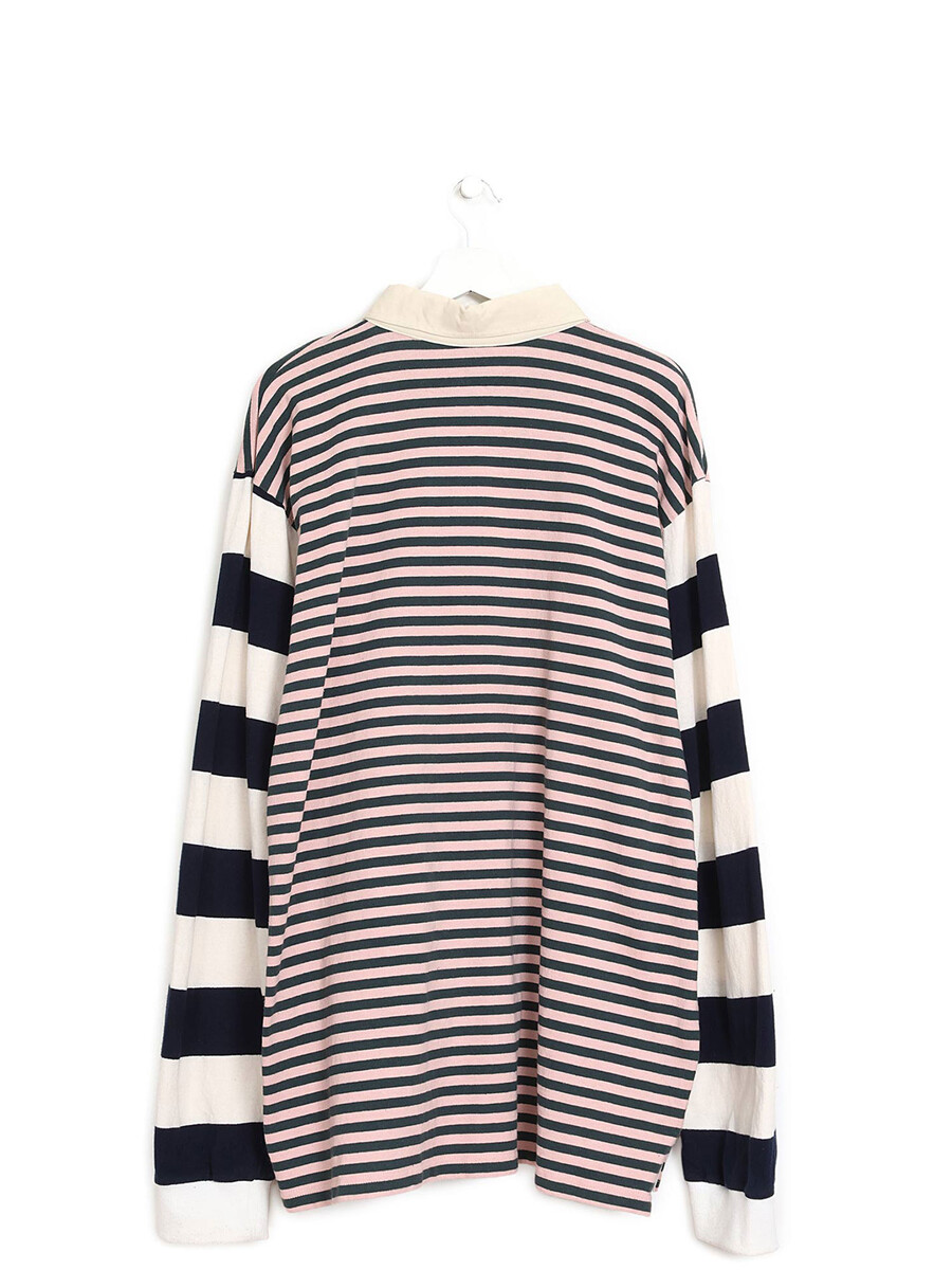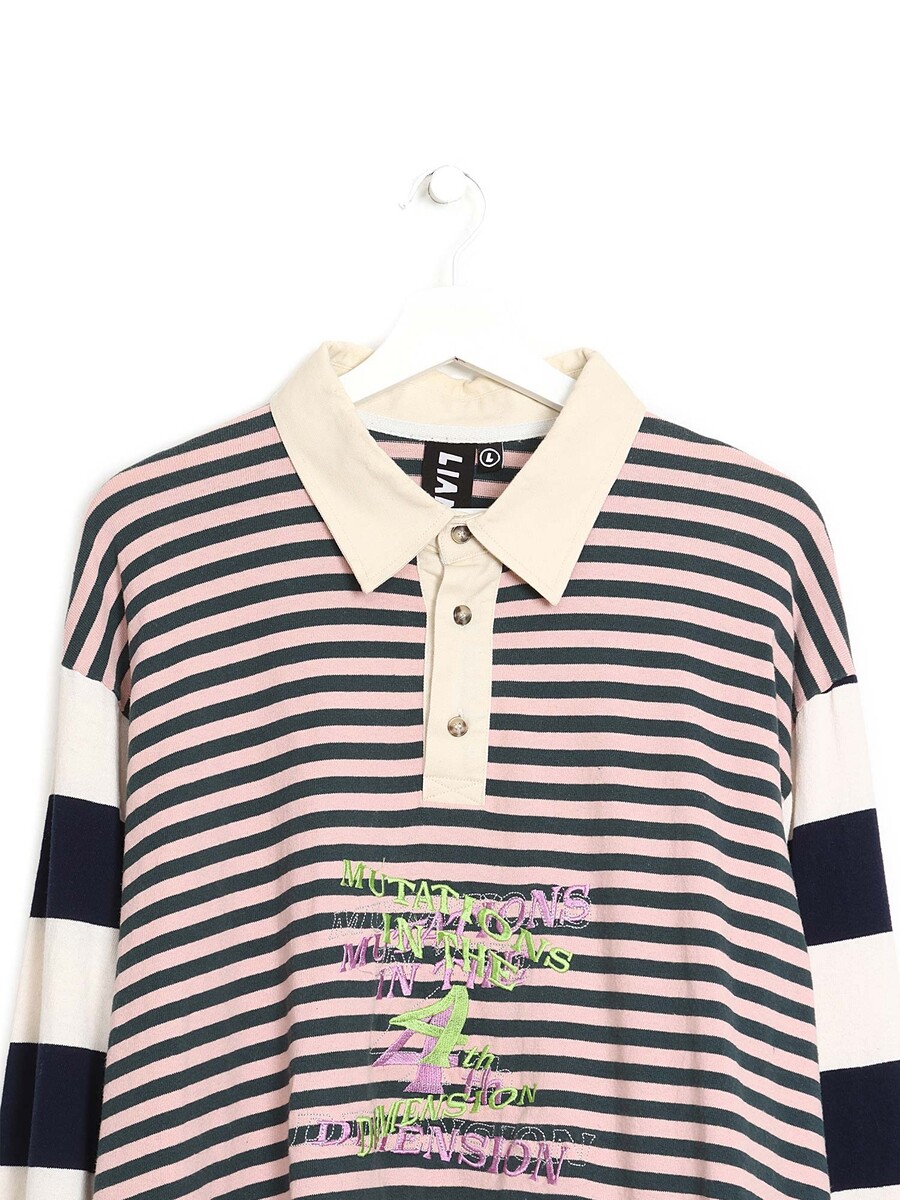 Chemise à manches longues en coton rayé rose, noir et blanc avec manches contrastées. Col chemise classique. Style polo rugby surdimensionné multicolore.