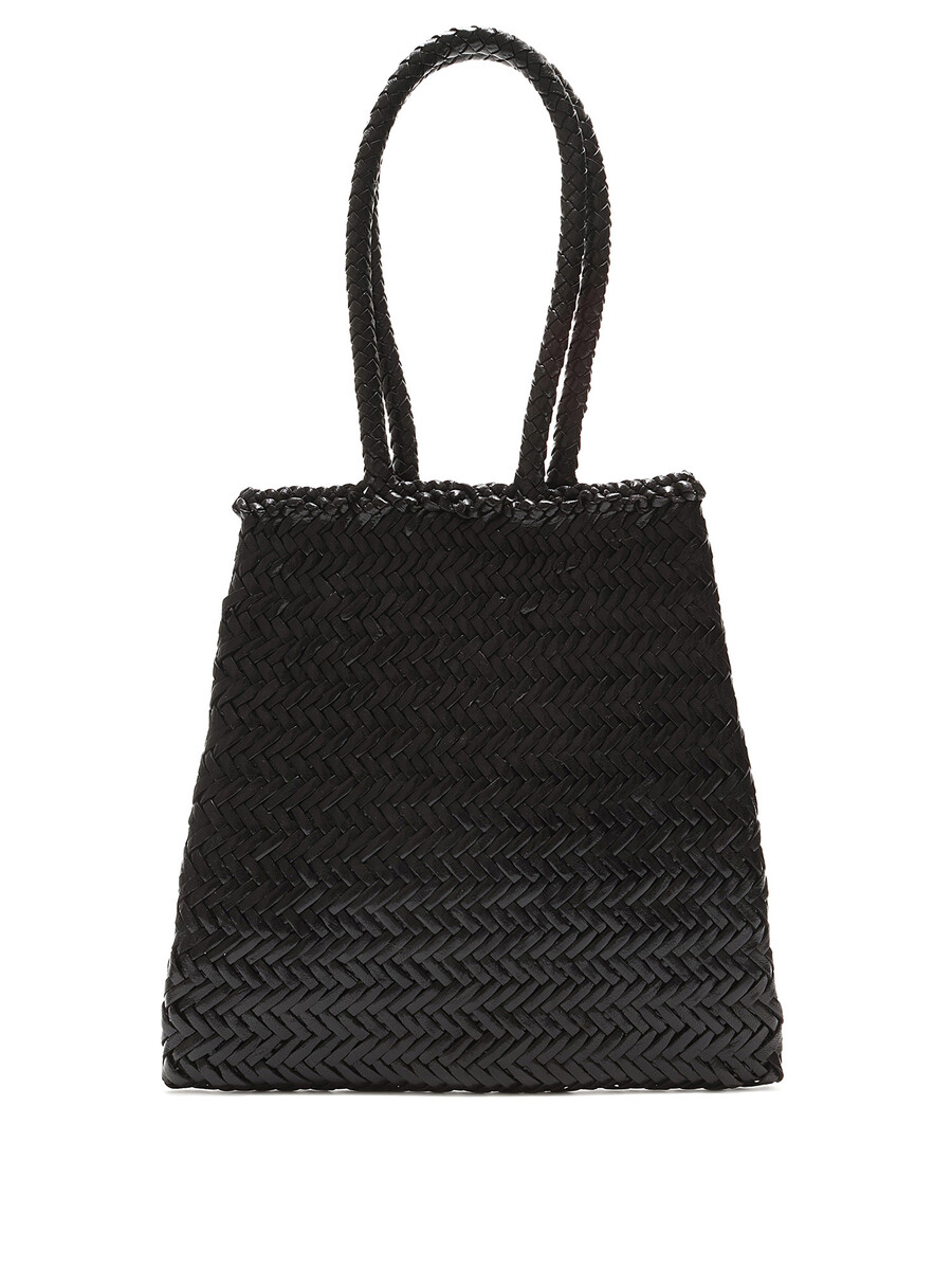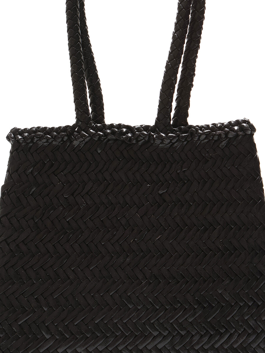 Cabas en tissu tressé noir avec motif à chevrons. Ouvert au sommet. Doubles poignées tressées pour un transport facile. Coutures ton sur ton sur tout l’ensemble.