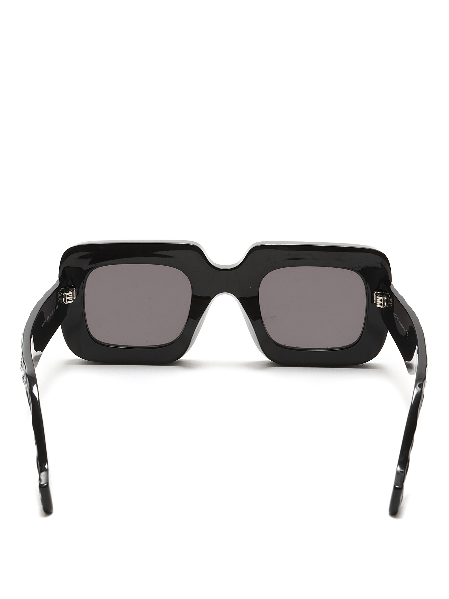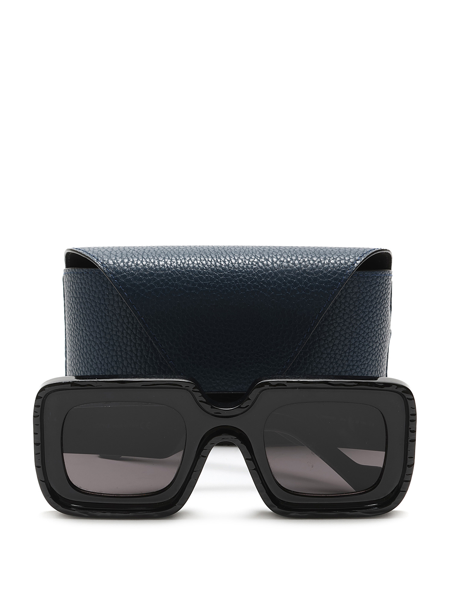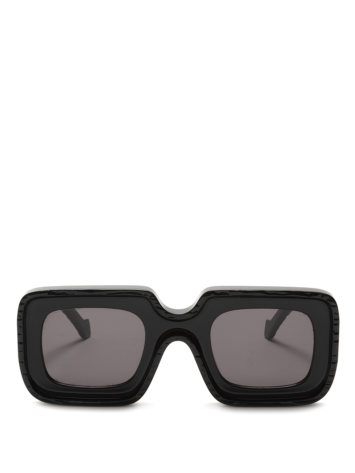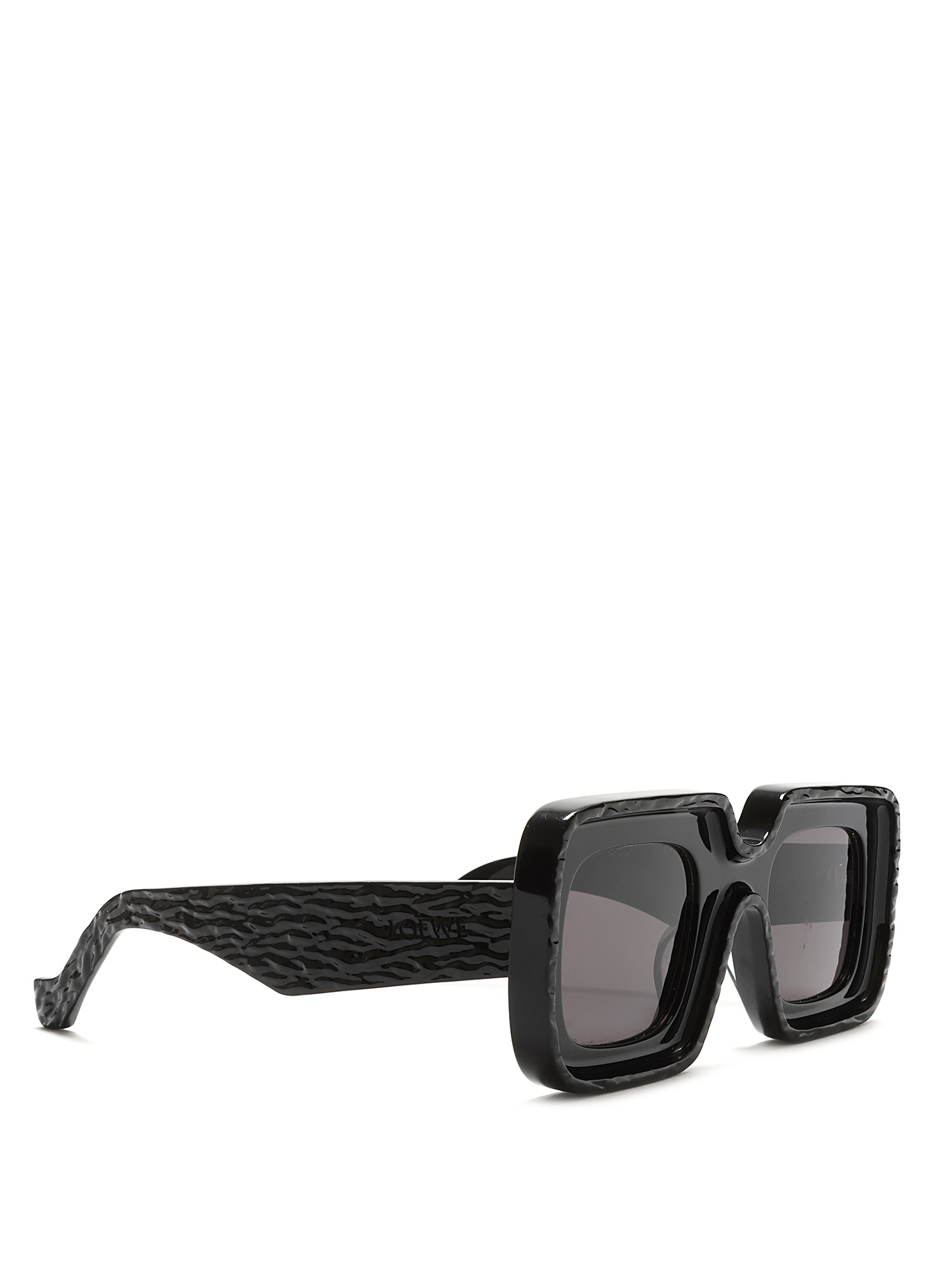 Lunettes de soleil rectangulaires avec branches texturées en noir brillant. Verres avec protection UV. Avec un étui de protection.