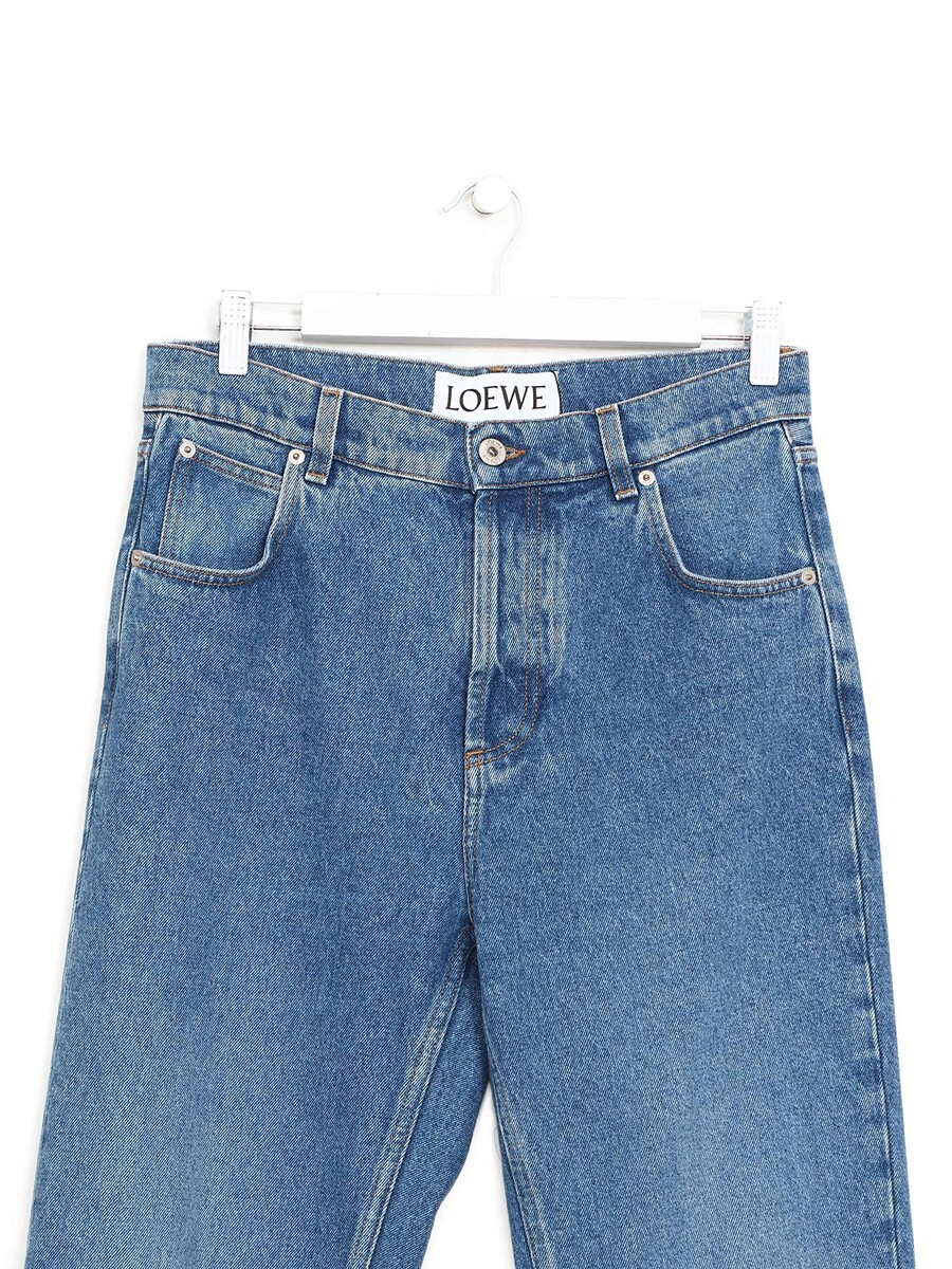 Jean classique en denim bleu avec fermeture à boutons et cinq poches.