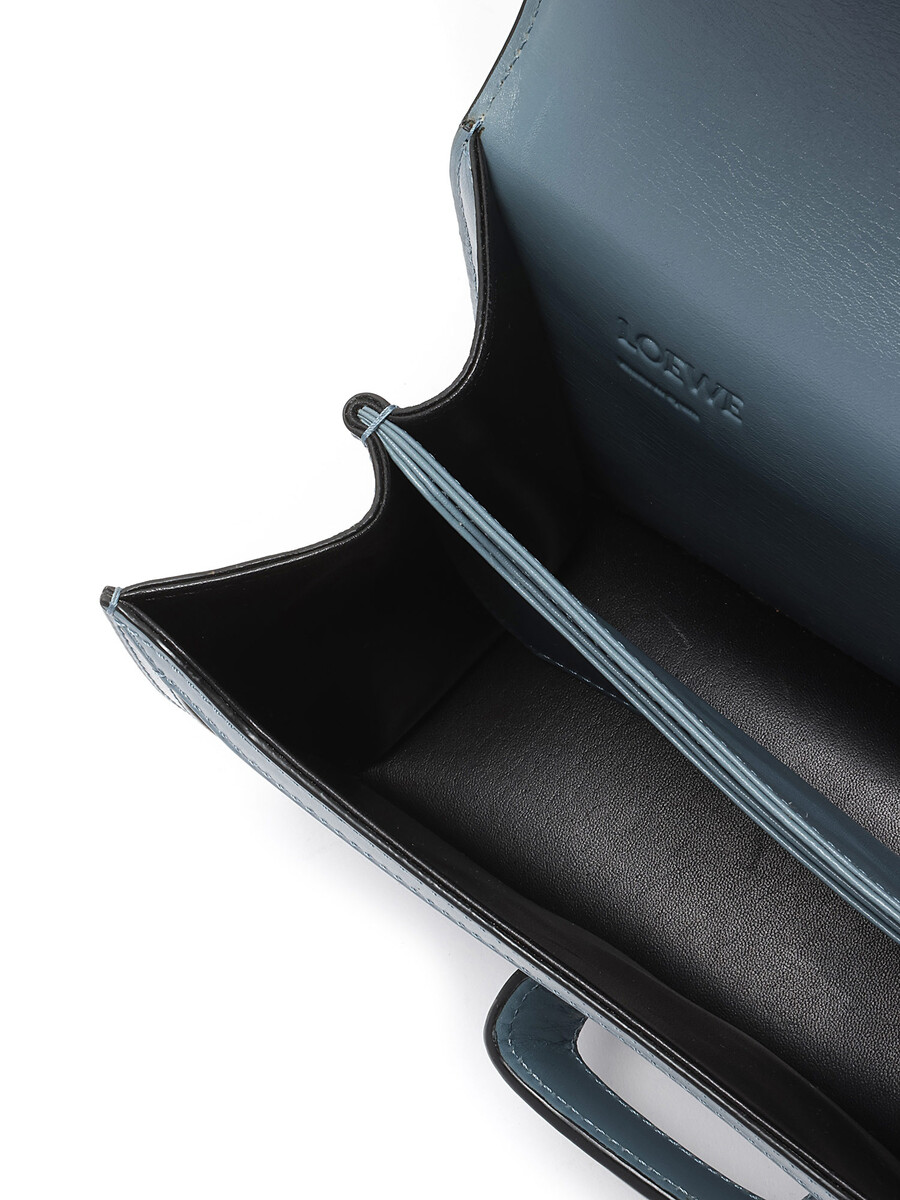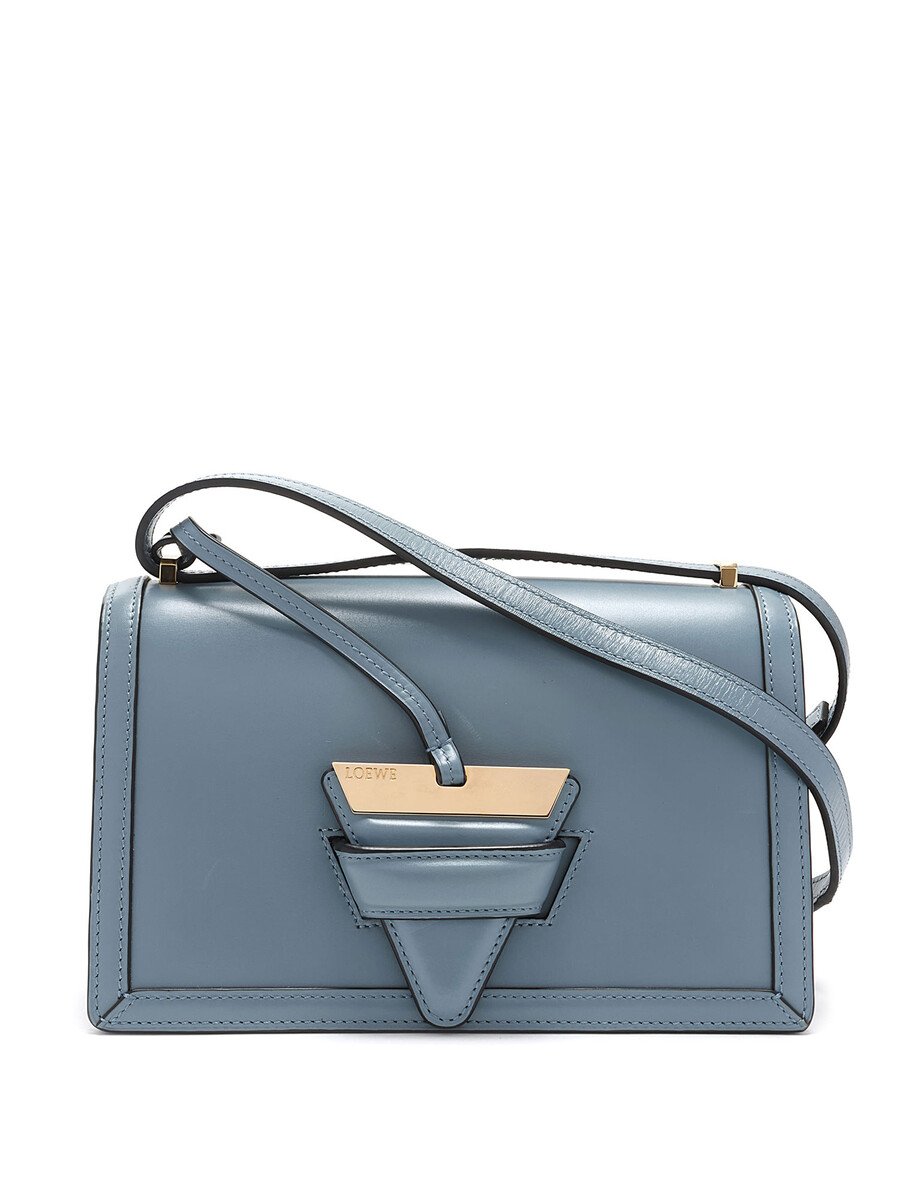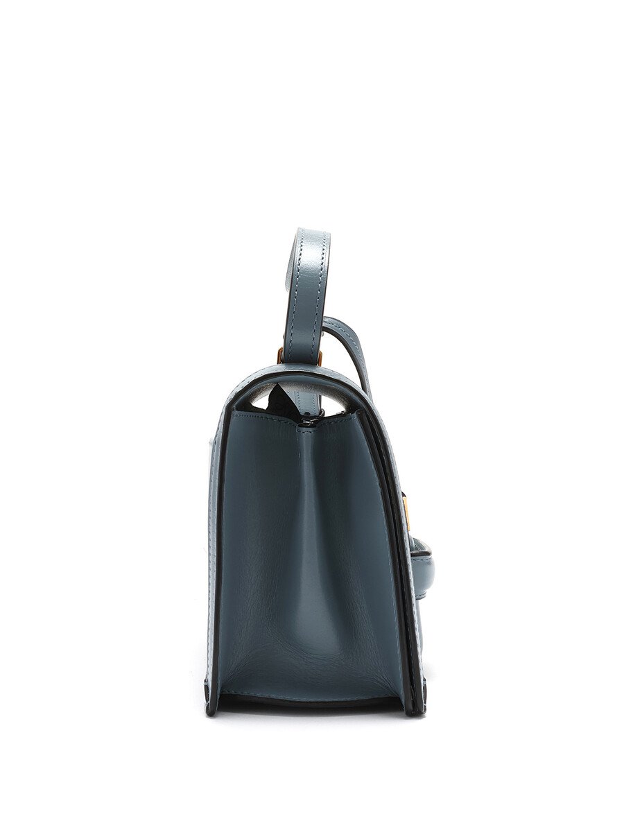 Sac à bandoulière structuré en cuir bleu pâle avec une fermeture triangulaire unique. Bandoulière ajustable en cuir. Quincaillerie dorée. Comprend une carte d'authenticité.