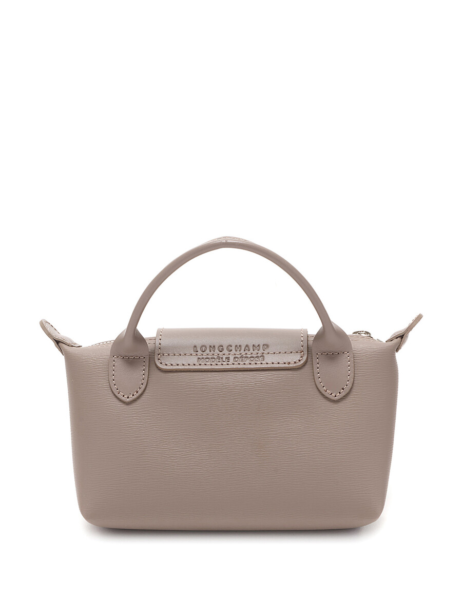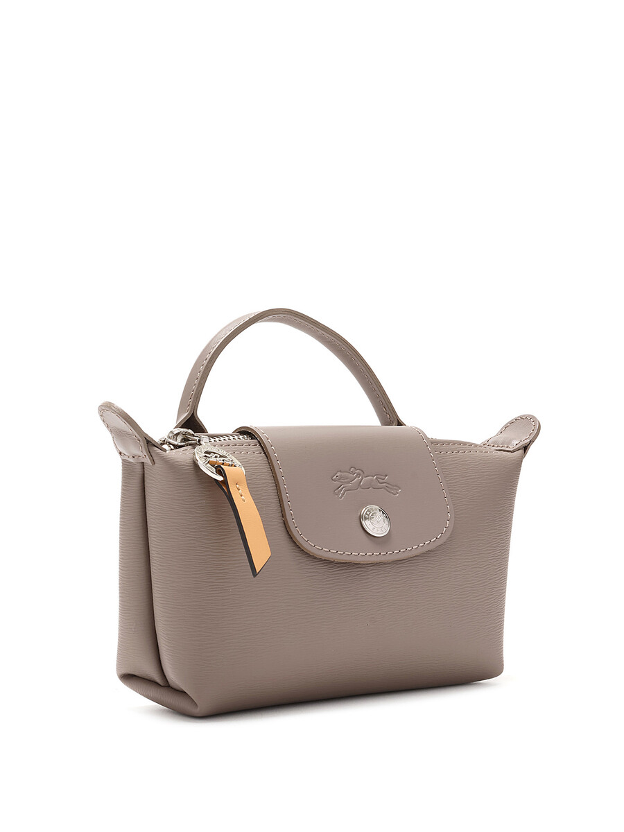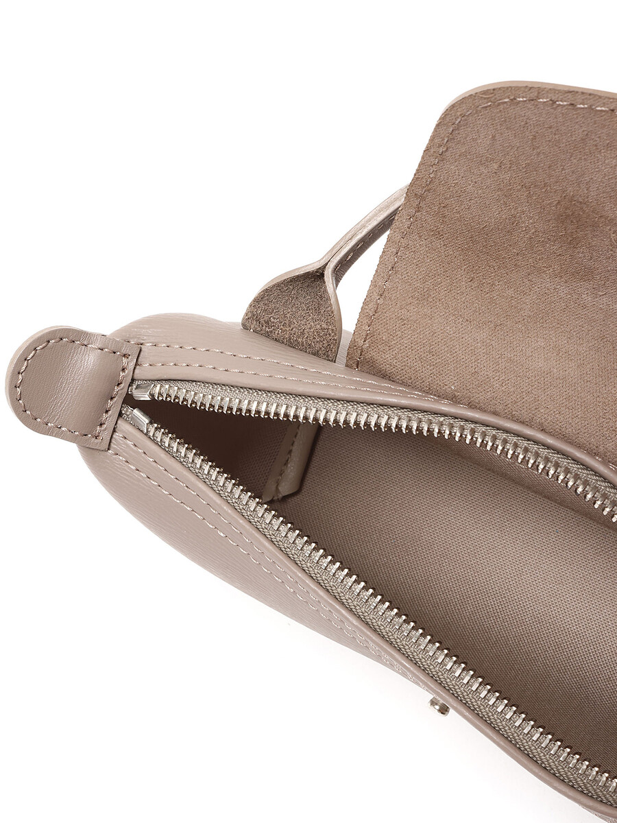 Mini sac à main en taupe avec garniture en cuir de vachette et synthétique. Rabat avec bouton-pression et fermeture éclair. Poignée courte non-ajustable. Ferrures en métal argenté.