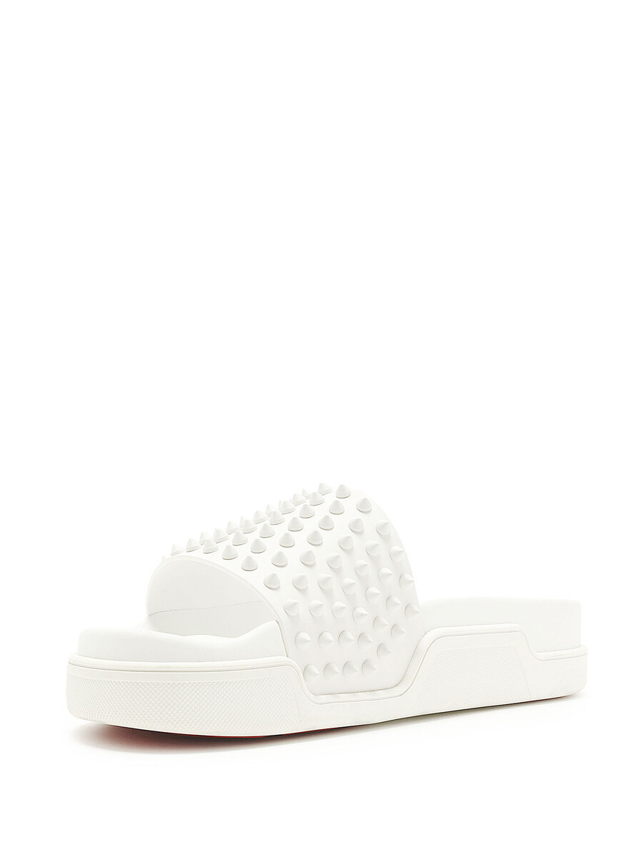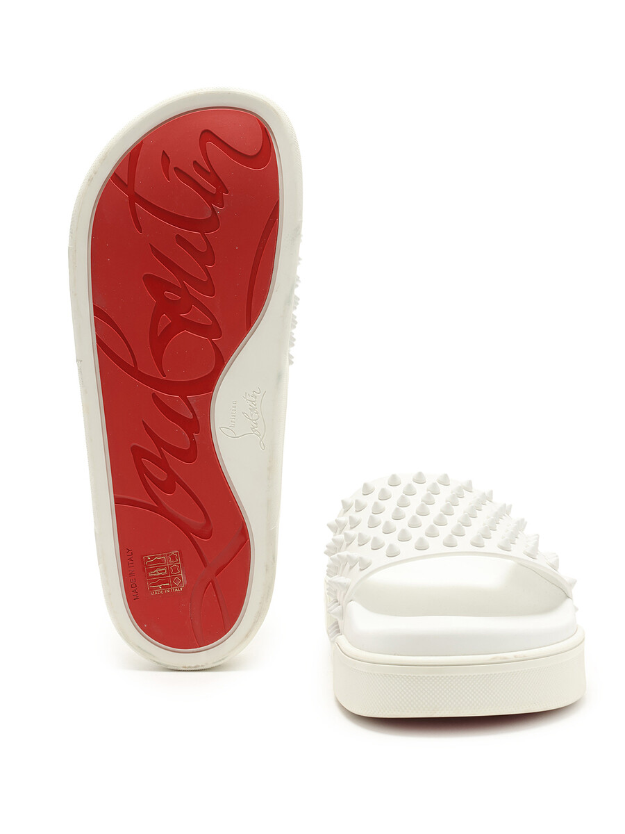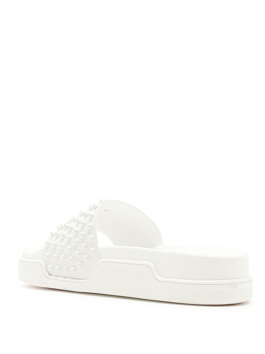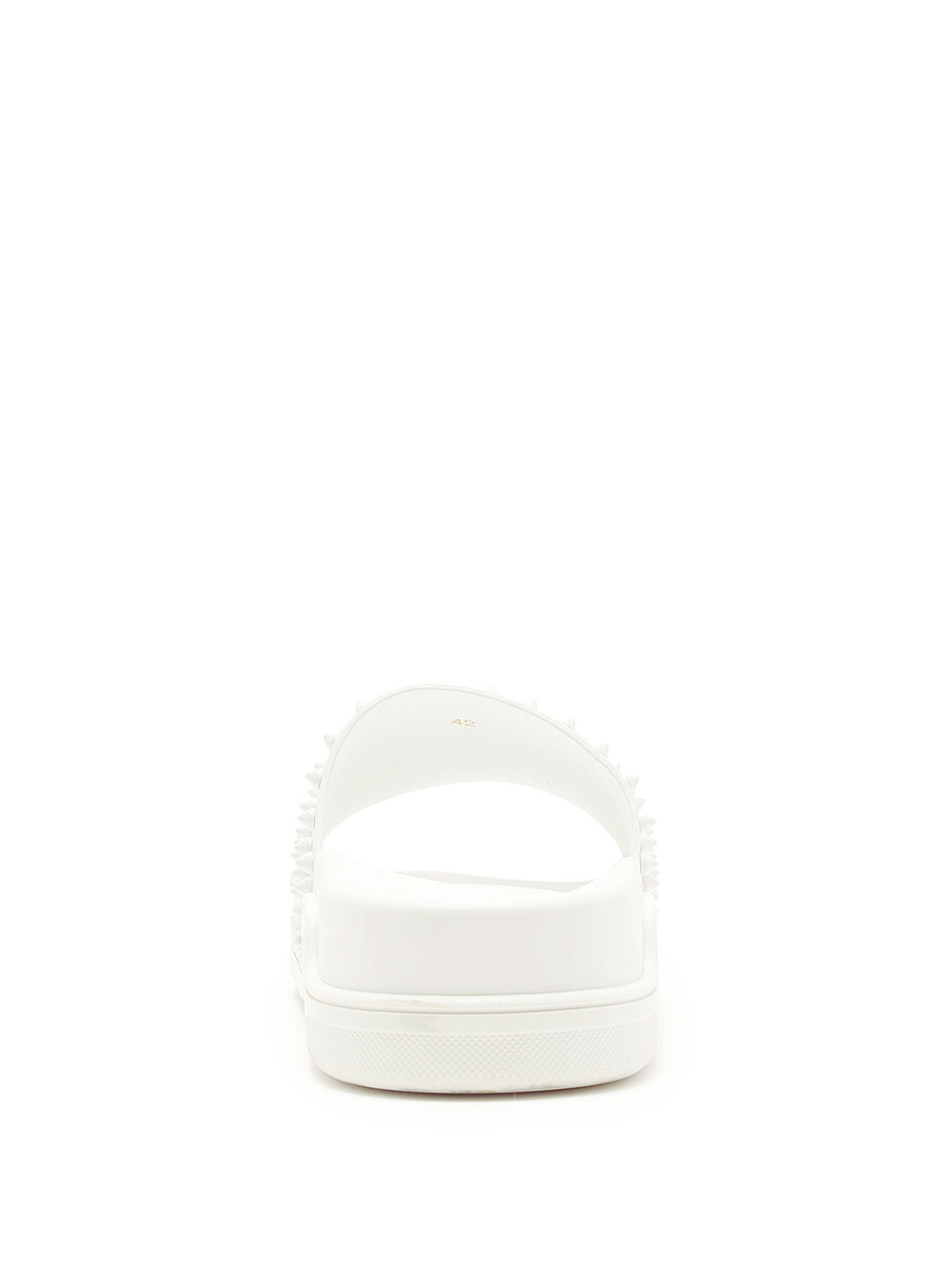 Sandales en caoutchouc avec des clous emblématiques sur la bride. Design blanc sur blanc avec les semelles rouges iconiques. Style à enfiler avec un bout ouvert.