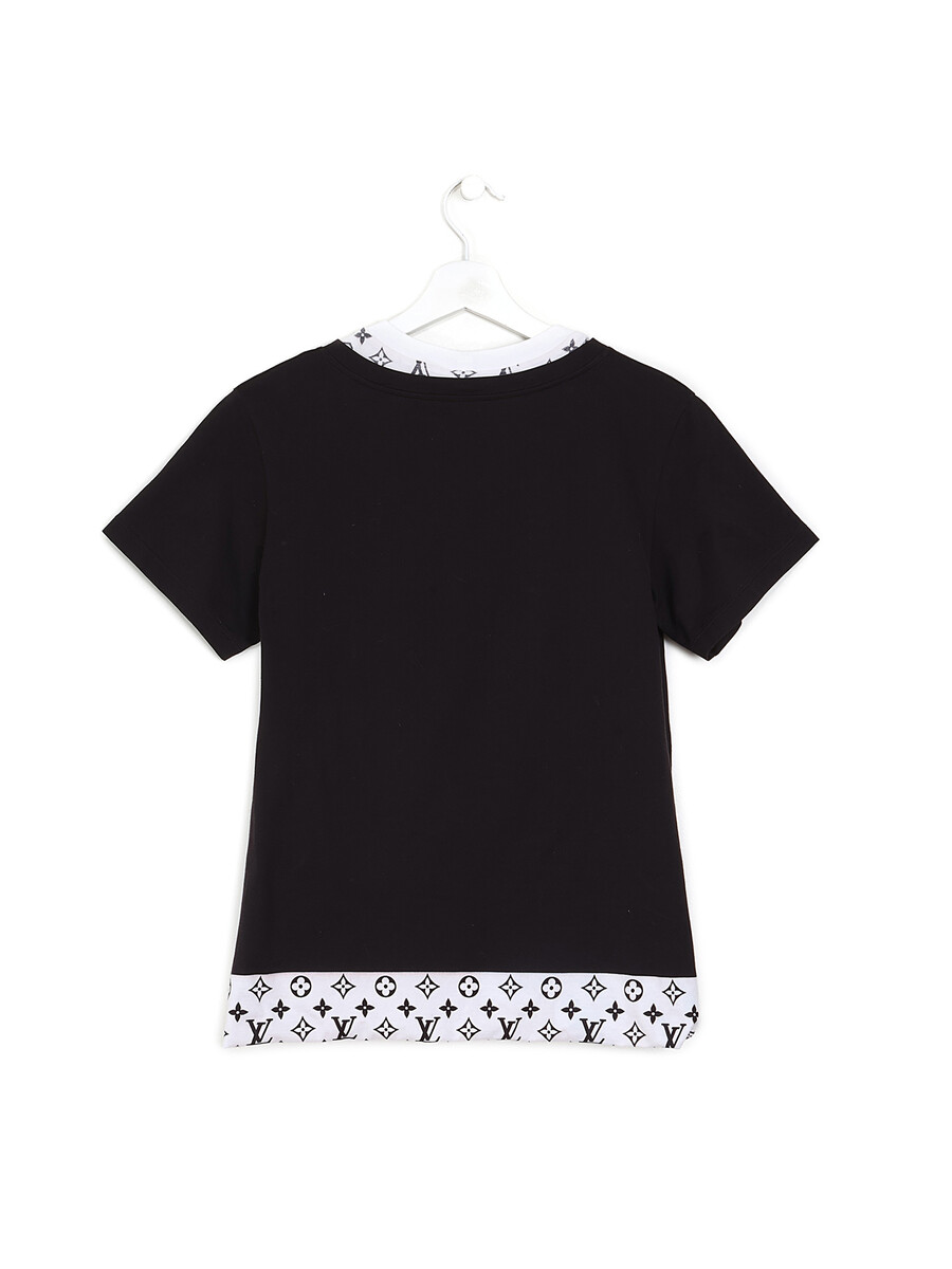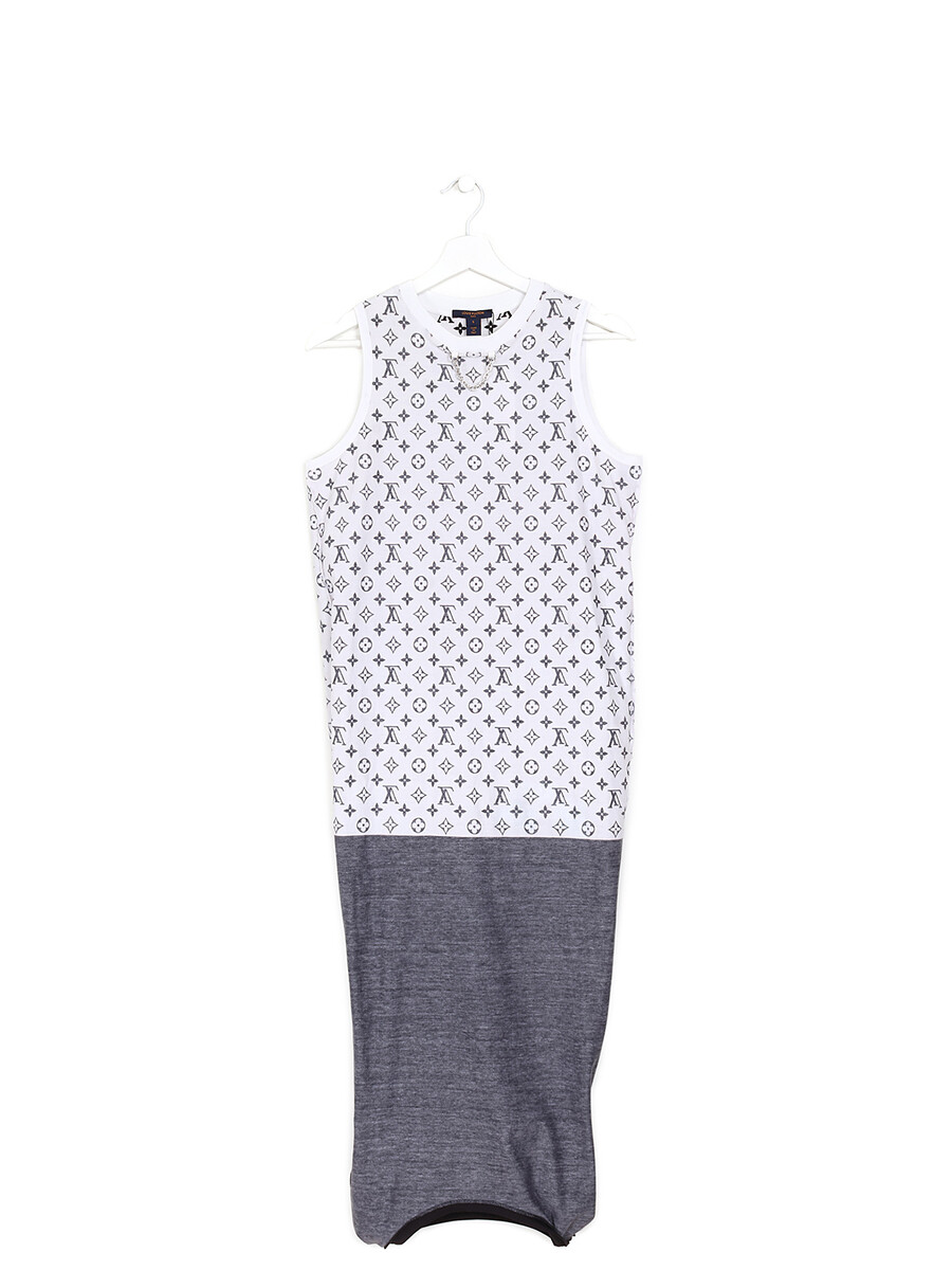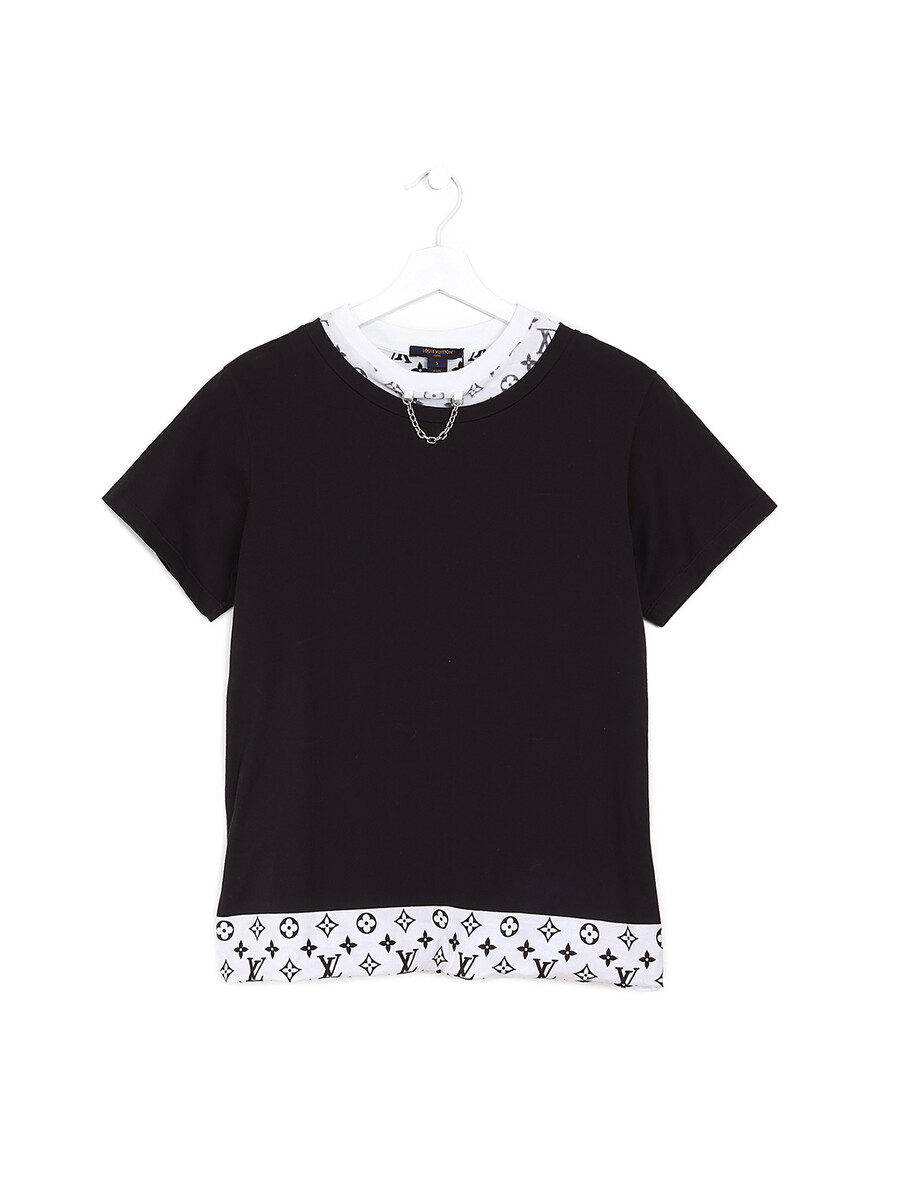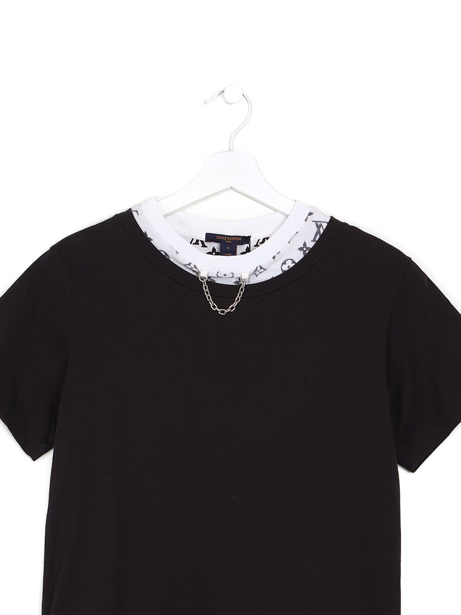 T-shirt à effet trompe l'œil en blanc et gris, sous-couche sans manches imprimée de monogrammes. Détail de chaîne en métal argenté à l'encolure. Col rond avec bordures côtelées.