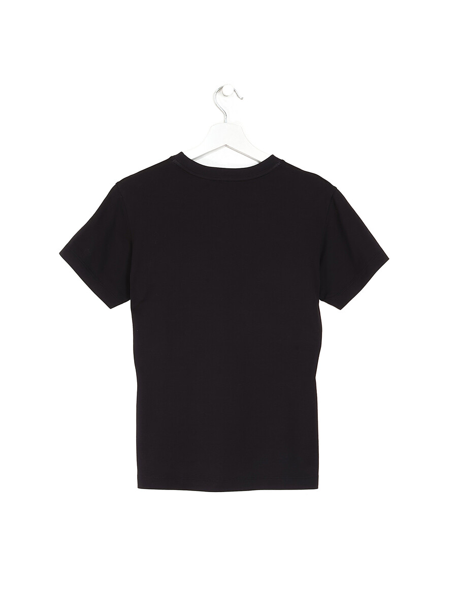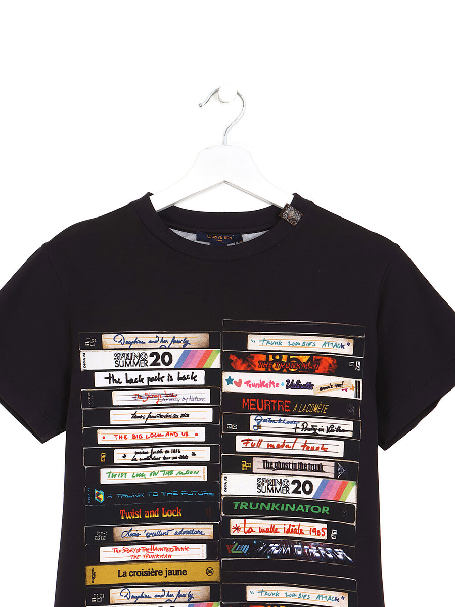 T-shirt gris avec imprimé de cassettes multicolores. Col rond à accent en toile enduite monogramme marron.