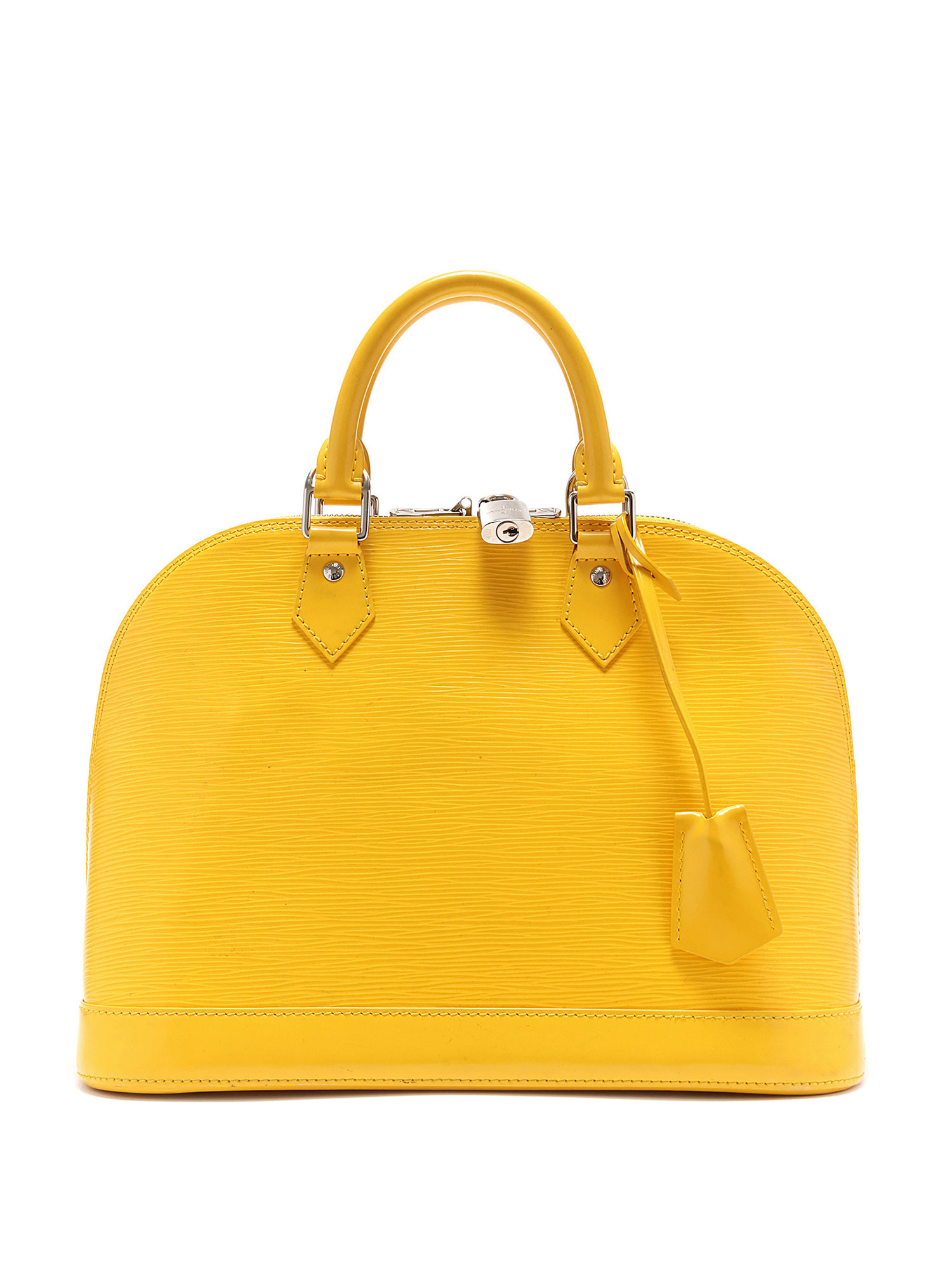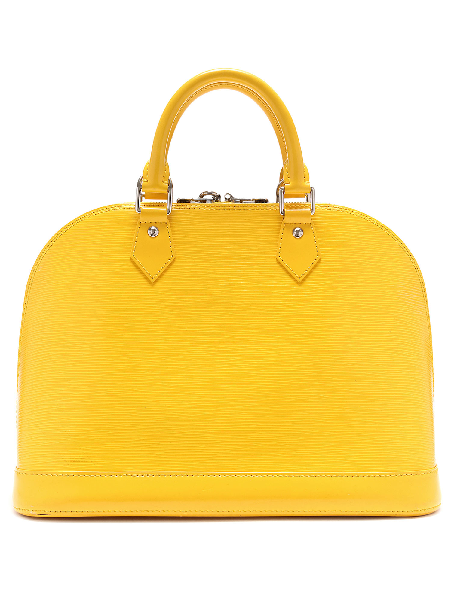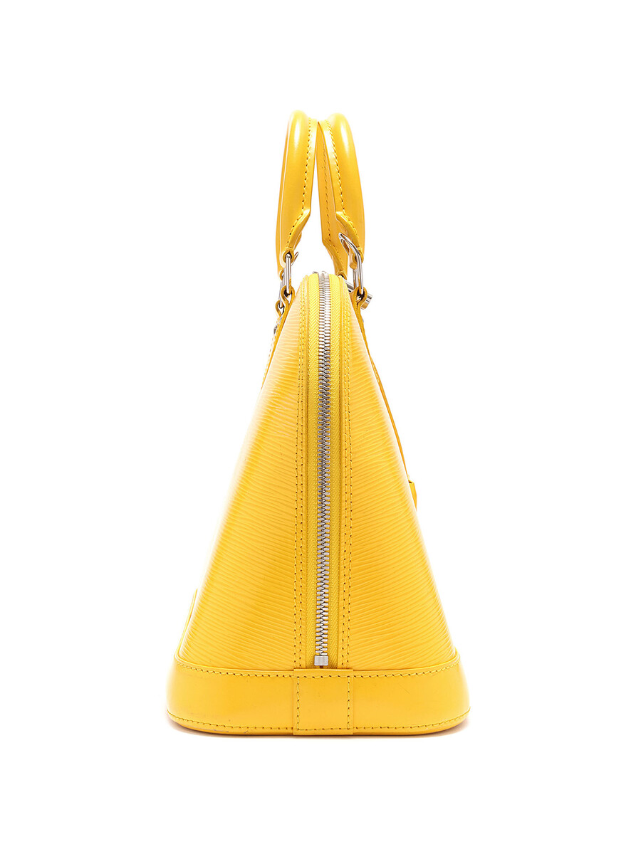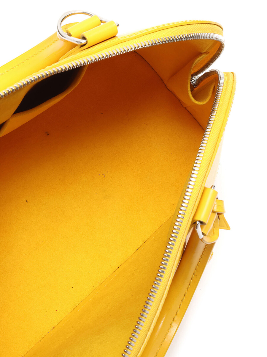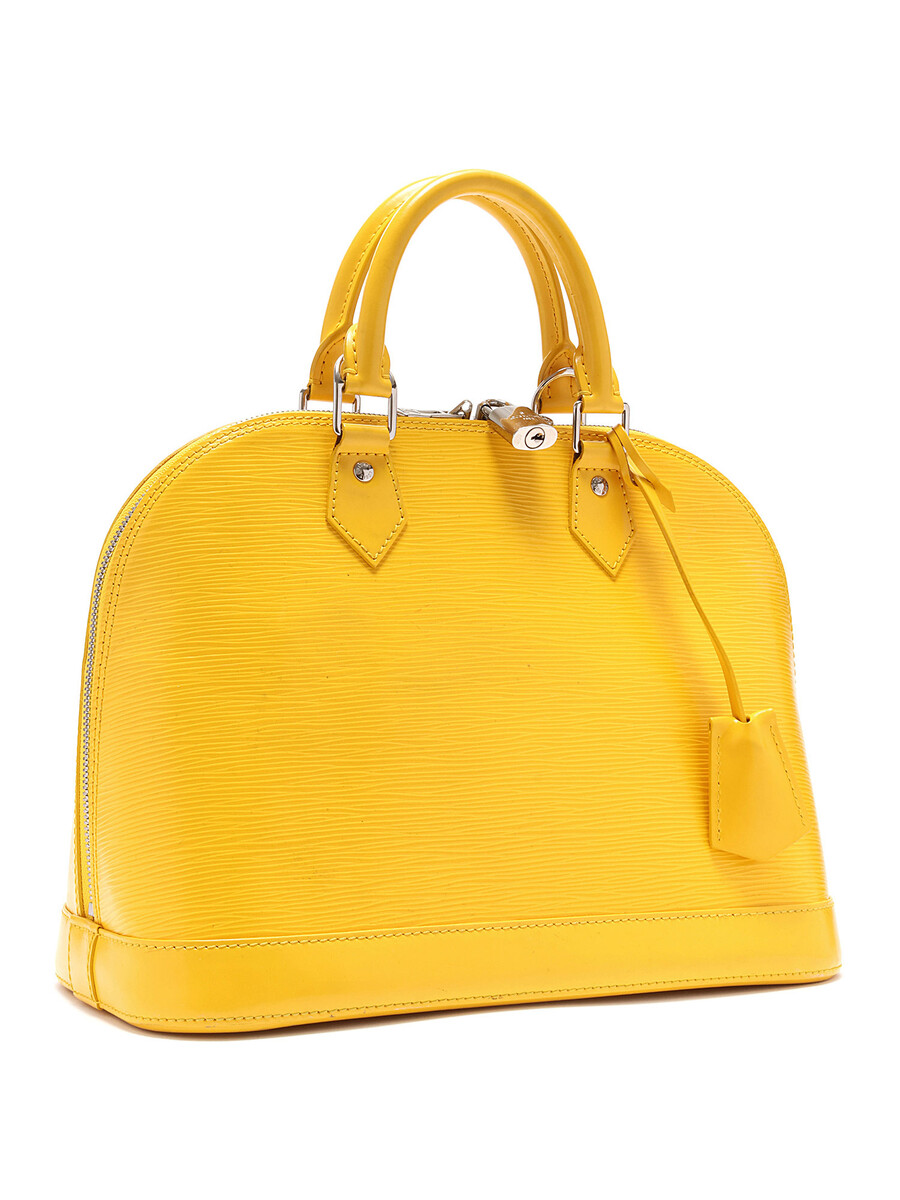 Sac à main en cuir Épi avec texture signature Épi en jaune. Poignées supérieures en cuir roulé. Fermeture à glissière. Garnitures en métal argenté.