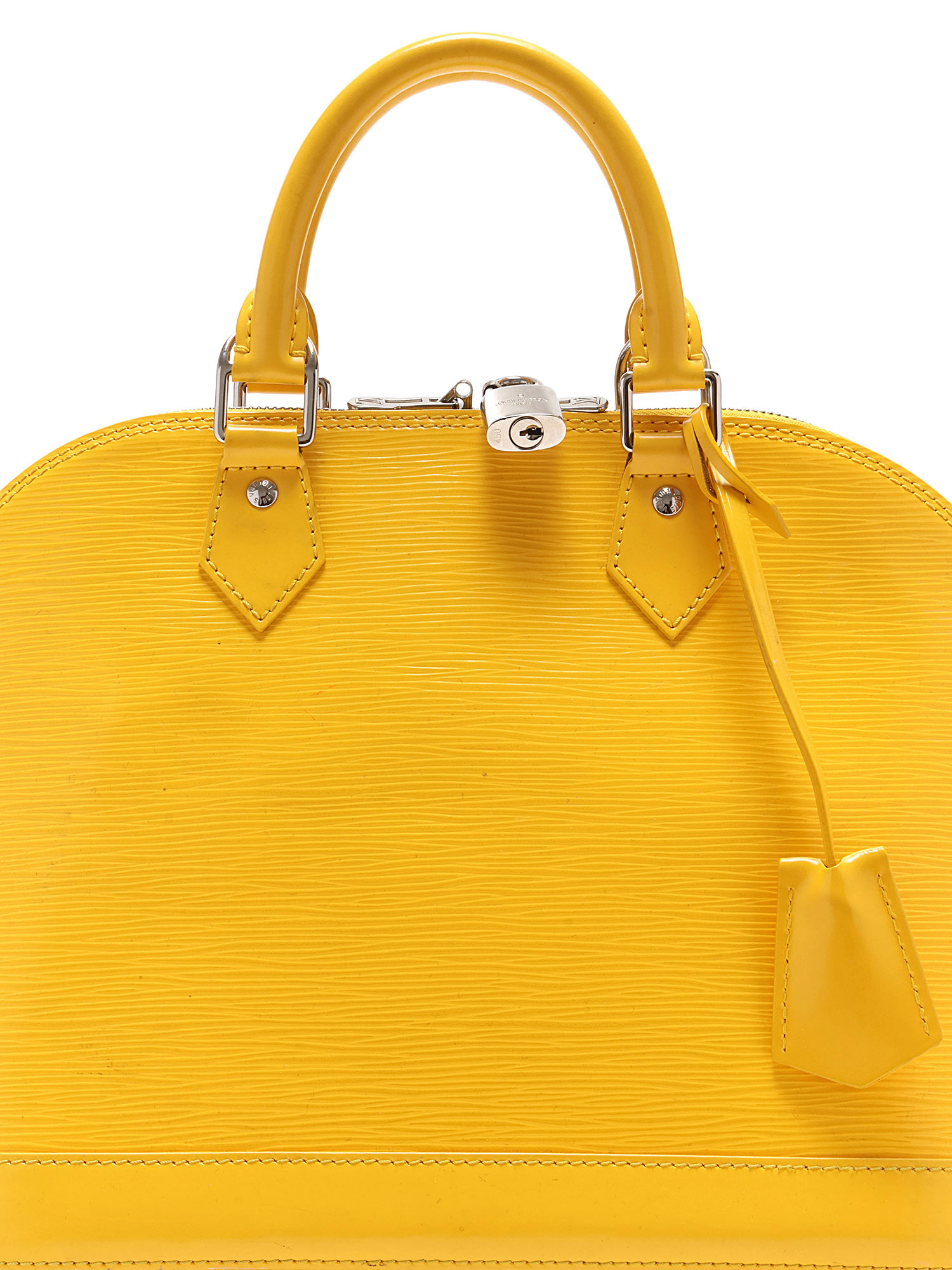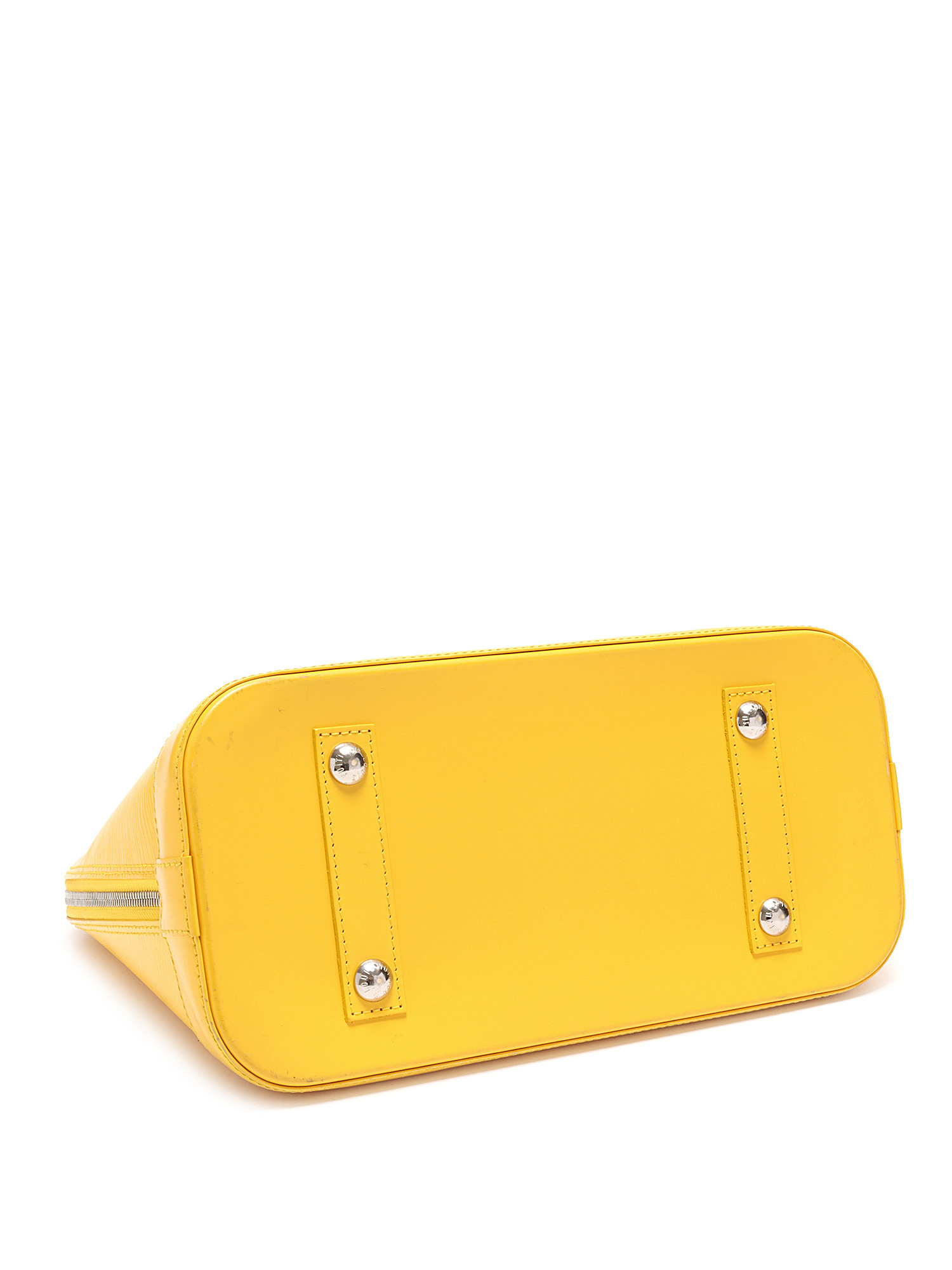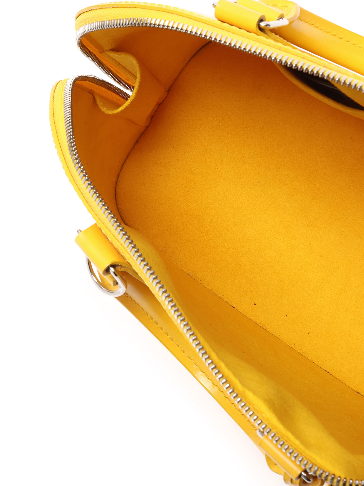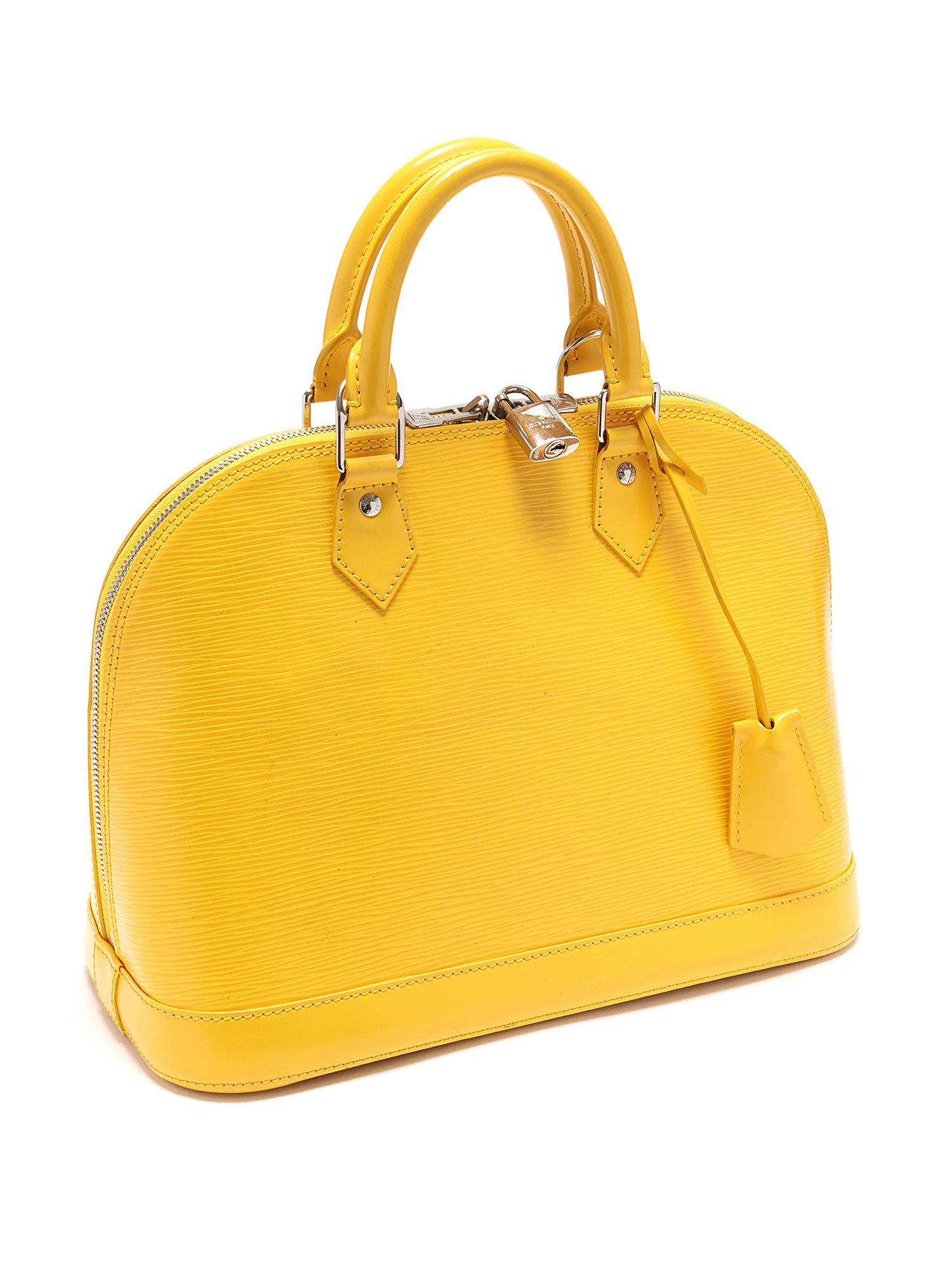 Sac à main en cuir Épi avec texture signature Épi en jaune. Poignées supérieures en cuir roulé. Fermeture à glissière. Garnitures en métal argenté.
