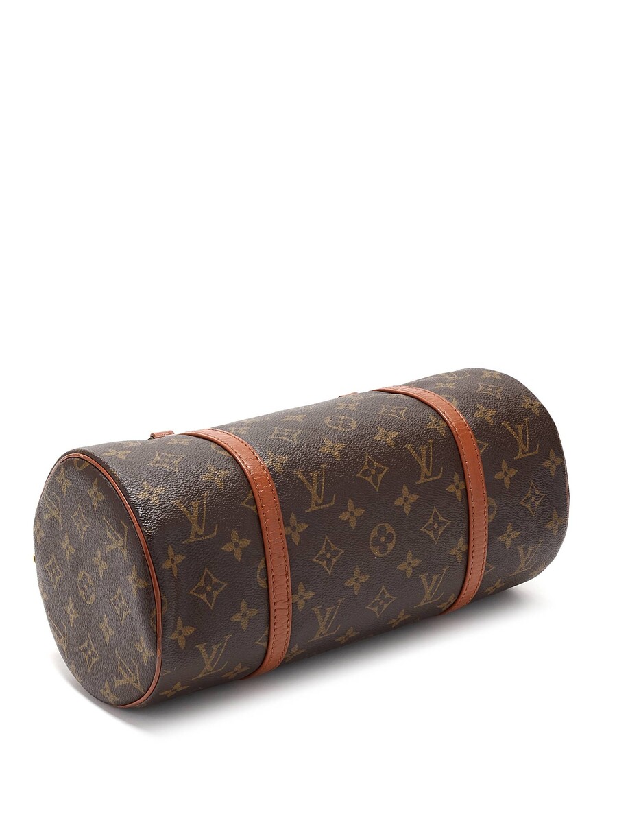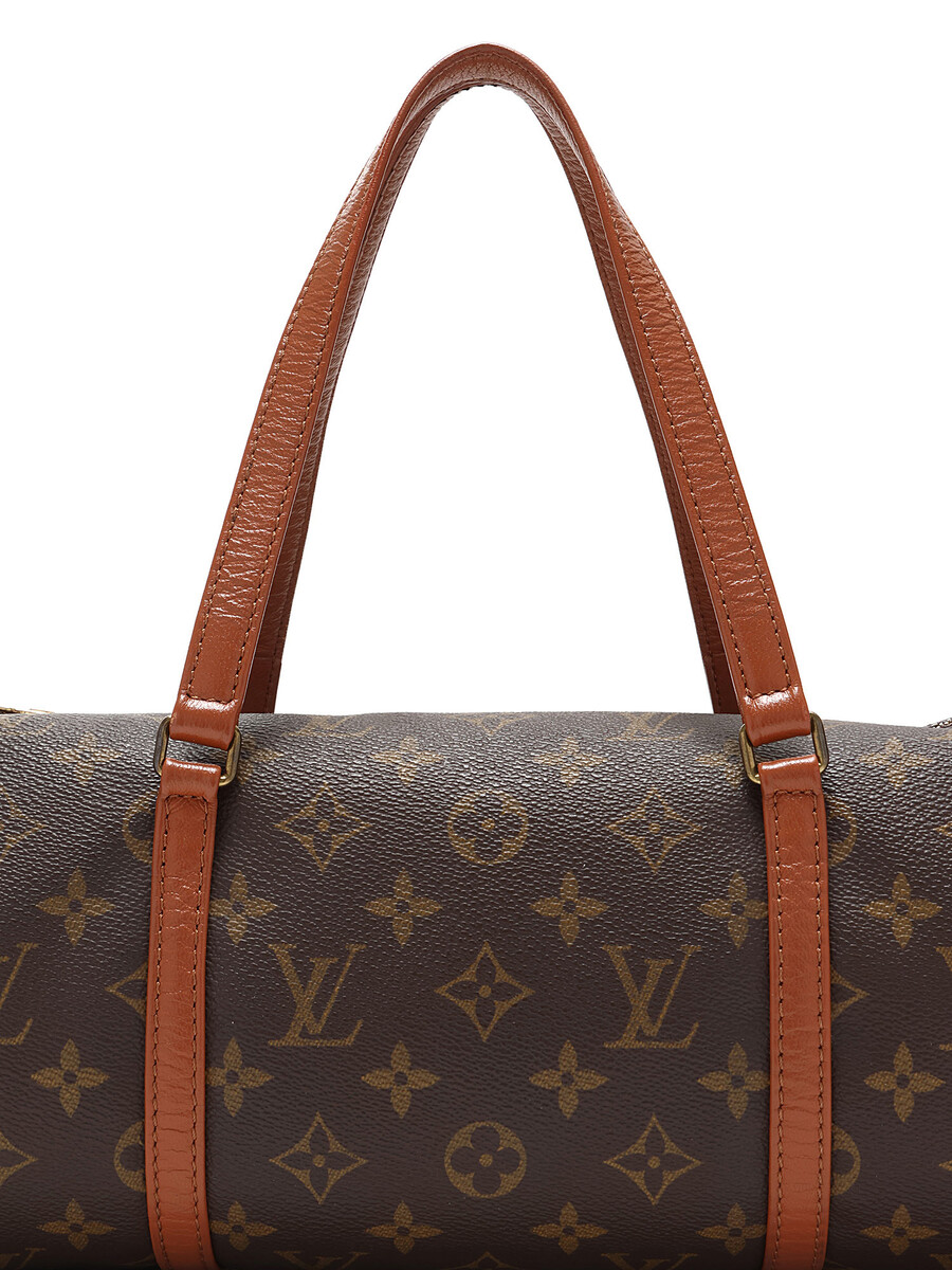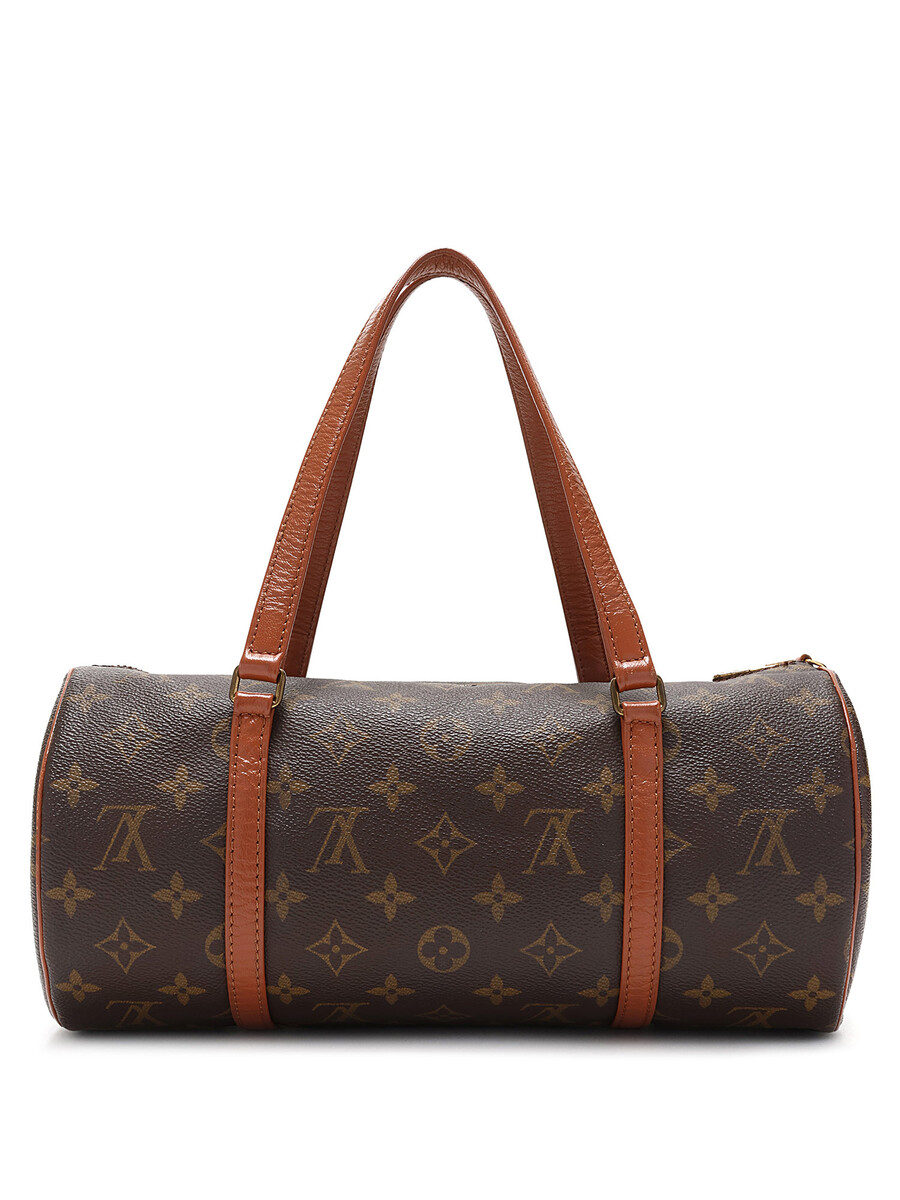 Sac tonneau Papillon 30 en toile Monogram. Bandoulières et garnitures en cuir camel. Fermeture à glissière.